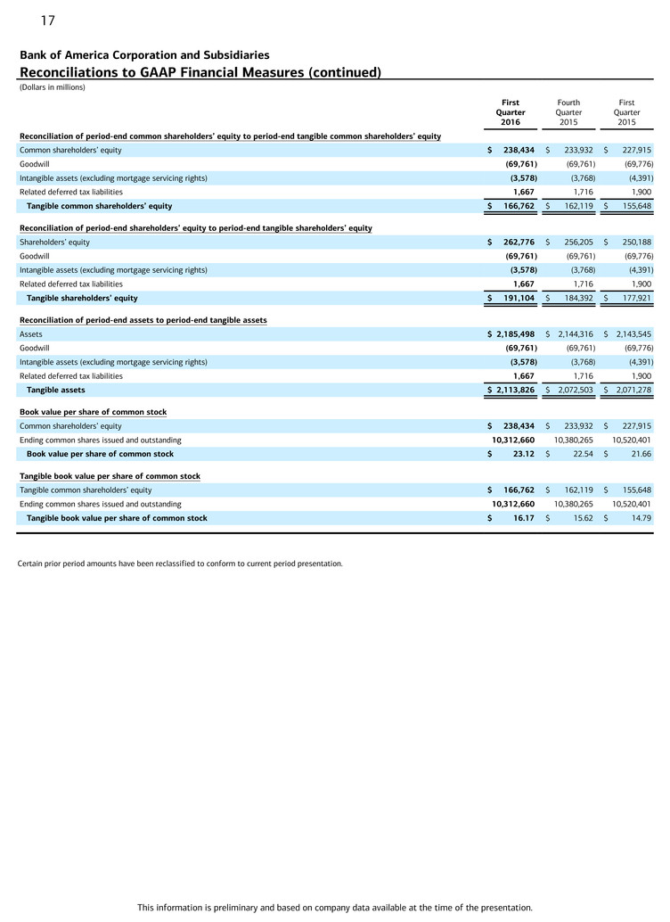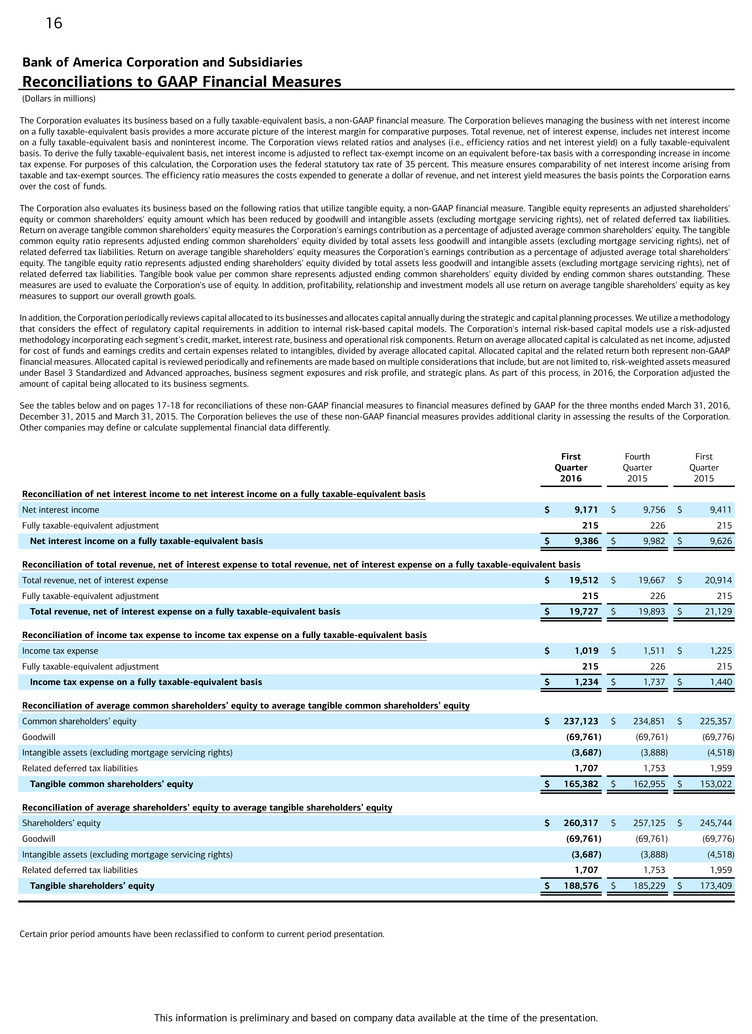 This information is preliminary and based on company data available at the time of the presentation. 16 Bank of America Corporation and Subsidiaries Reconciliations to GAAP Financial Measures (Dollars in millions) The Corporation evaluates its business based on a fully taxable-equivalent basis, a non-GAAP financial measure. The Corporation believes managing the business with net interest income on a fully taxable-equivalent basis provides a more accurate picture of the interest margin for comparative purposes. Total revenue, net of interest expense, includes net interest income on a fully taxable-equivalent basis and noninterest income. The Corporation views related ratios and analyses (i.e., efficiency ratios and net interest yield) on a fully taxable-equivalent basis. To derive the fully taxable-equivalent basis, net interest income is adjusted to reflect tax-exempt income on an equivalent before-tax basis with a corresponding increase in income tax expense. For purposes of this calculation, the Corporation uses the federal statutory tax rate of 35 percent. This measure ensures comparability of net interest income arising from taxable and tax-exempt sources. The efficiency ratio measures the costs expended to generate a dollar of revenue, and net interest yield measures the basis points the Corporation earns over the cost of funds. The Corporation also evaluates its business based on the following ratios that utilize tangible equity, a non-GAAP financial measure. Tangible equity represents an adjusted shareholders' equity or common shareholders' equity amount which has been reduced by goodwill and intangible assets (excluding mortgage servicing rights), net of related deferred tax liabilities. Return on average tangible common shareholders' equity measures the Corporation's earnings contribution as a percentage of adjusted average common shareholders' equity. The tangible common equity ratio represents adjusted ending common shareholders' equity divided by total assets less goodwill and intangible assets (excluding mortgage servicing rights), net of related deferred tax liabilities. Return on average tangible shareholders' equity measures the Corporation's earnings contribution as a percentage of adjusted average total shareholders' equity. The tangible equity ratio represents adjusted ending shareholders' equity divided by total assets less goodwill and intangible assets (excluding mortgage servicing rights), net of related deferred tax liabilities. Tangible book value per common share represents adjusted ending common shareholders' equity divided by ending common shares outstanding. These measures are used to evaluate the Corporation's use of equity. In addition, profitability, relationship and investment models all use return on average tangible shareholders' equity as key measures to support our overall growth goals. In addition, the Corporation periodically reviews capital allocated to its businesses and allocates capital annually during the strategic and capital planning processes. We utilize a methodology that considers the effect of regulatory capital requirements in addition to internal risk-based capital models. The Corporation's internal risk-based capital models use a risk-adjusted methodology incorporating each segment's credit, market, interest rate, business and operational risk components. Return on average allocated capital is calculated as net income, adjusted for cost of funds and earnings credits and certain expenses related to intangibles, divided by average allocated capital. Allocated capital and the related return both represent non-GAAP financial measures. Allocated capital is reviewed periodically and refinements are made based on multiple considerations that include, but are not limited to, risk-weighted assets measured under Basel 3 Standardized and Advanced approaches, business segment exposures and risk profile, and strategic plans. As part of this process, in 2016, the Corporation adjusted the amount of capital being allocated to its business segments. See the tables below and on pages 17-18 for reconciliations of these non-GAAP financial measures to financial measures defined by GAAP for the three months ended March 31, 2016, December 31, 2015 and March 31, 2015. The Corporation believes the use of these non-GAAP financial measures provides additional clarity in assessing the results of the Corporation. Other companies may define or calculate supplemental financial data differently. First Quarter 2016 Fourth Quarter 2015 First Quarter 2015 Reconciliation of net interest income to net interest income on a fully taxable-equivalent basis Net interest income $ 9,171 $ 9,756 $ 9,411 Fully taxable-equivalent adjustment 215 226 215 Net interest income on a fully taxable-equivalent basis $ 9,386 $ 9,982 $ 9,626 Reconciliation of total revenue, net of interest expense to total revenue, net of interest expense on a fully taxable-equivalent basis Total revenue, net of interest expense $ 19,512 $ 19,667 $ 20,914 Fully taxable-equivalent adjustment 215 226 215 Total revenue, net of interest expense on a fully taxable-equivalent basis $ 19,727 $ 19,893 $ 21,129 Reconciliation of income tax expense to income tax expense on a fully taxable-equivalent basis Income tax expense $ 1,019 $ 1,511 $ 1,225 Fully taxable-equivalent adjustment 215 226 215 Income tax expense on a fully taxable-equivalent basis $ 1,234 $ 1,737 $ 1,440 Reconciliation of average common shareholders’ equity to average tangible common shareholders’ equity Common shareholders’ equity $ 237,123 $ 234,851 $ 225,357 Goodwill (69,761) (69,761) (69,776) Intangible assets (excluding mortgage servicing rights) (3,687) (3,888) (4,518) Related deferred tax liabilities 1,707 1,753 1,959 Tangible common shareholders’ equity $ 165,382 $ 162,955 $ 153,022 Reconciliation of average shareholders’ equity to average tangible shareholders’ equity Shareholders’ equity $ 260,317 $ 257,125 $ 245,744 Goodwill (