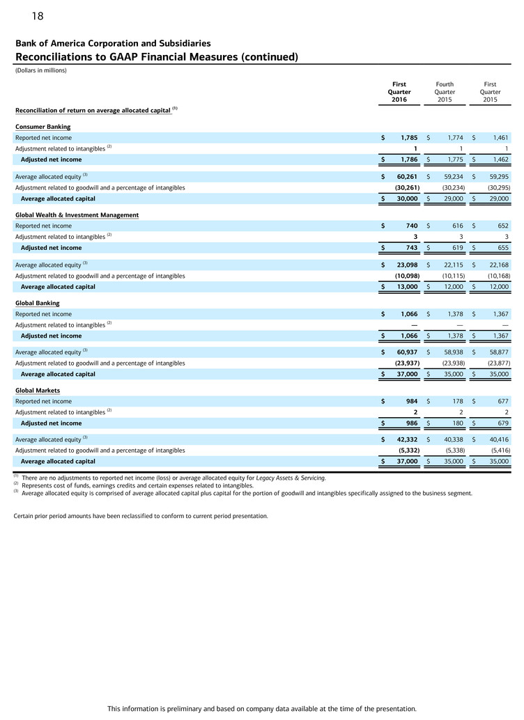 This information is preliminary and based on company data available at the time of the presentation. 17 Bank of America Corporation and Subsidiaries Reconciliations to GAAP Financial Measures (continued) (Dollars in millions) First Quarter 2016 Fourth Quarter 2015 First Quarter 2015 Reconciliation of period-end common shareholders’ equity to period-end tangible common shareholders’ equity Common shareholders’ equity $ 238,434 $ 233,932 $ 227,915 Goodwill (69,761) (69,761) (69,776) Intangible assets (excluding mortgage servicing rights) (3,578) (3,768) (4,391) Related deferred tax liabilities 1,667 1,716 1,900 Tangible common shareholders’ equity $ 166,762 $ 162,119 $ 155,648 Reconciliation of period-end shareholders’ equity to period-end tangible shareholders’ equity Shareholders’ equity $ 262,776 $ 256,205 $ 250,188 Goodwill (69,761) (69,761) (69,776) Intangible assets (excluding mortgage servicing rights) (3,578) (3,768) (4,391) Related deferred tax liabilities 1,667 1,716 1,900 Tangible shareholders’ equity $ 191,104 $ 184,392 $ 177,921 Reconciliation of period-end assets to period-end tangible assets Assets $ 2,185,498 $ 2,144,316 $ 2,143,545 Goodwill (69,761) (69,761) (69,776) Intangible assets (excluding mortgage servicing rights) (3,578) (3,768) (4,391) Related deferred tax liabilities 1,667 1,716 1,900 Tangible assets $ 2,113,826 $ 2,072,503 $ 2,071,278 Book value per share of common stock Common shareholders’ equity $ 238,434 $ 233,932 $ 227,915 Ending common shares issued and outstanding 10,312,660 10,380,265 10,520,401 Book value per share of common stock $ 23.12 $ 22.54 $ 21.66 Tangible book value per share of common stock Tangible common shareholders’ equity $ 166,762 $ 162,119 $ 155,648 Ending common shares issued and outstanding 10,312,660 10,380,265 10,520,401 Tangible book value per share of common stock $ 16.17 $ 15.62 $ 14.79 Certain prior period amounts have been reclassified to conform to current period presentation.