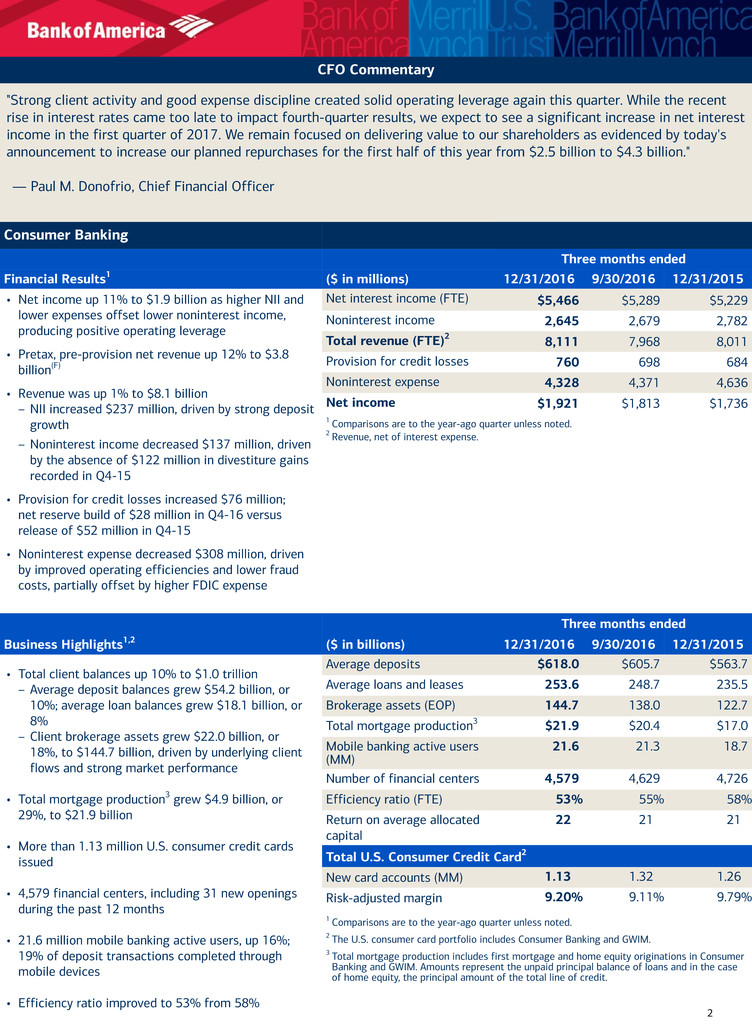2 Combined consumer credit/debit spending, including GWIM, excludes the impact of portfolio divestitures. Including divestitures, combined spending was up 4%.