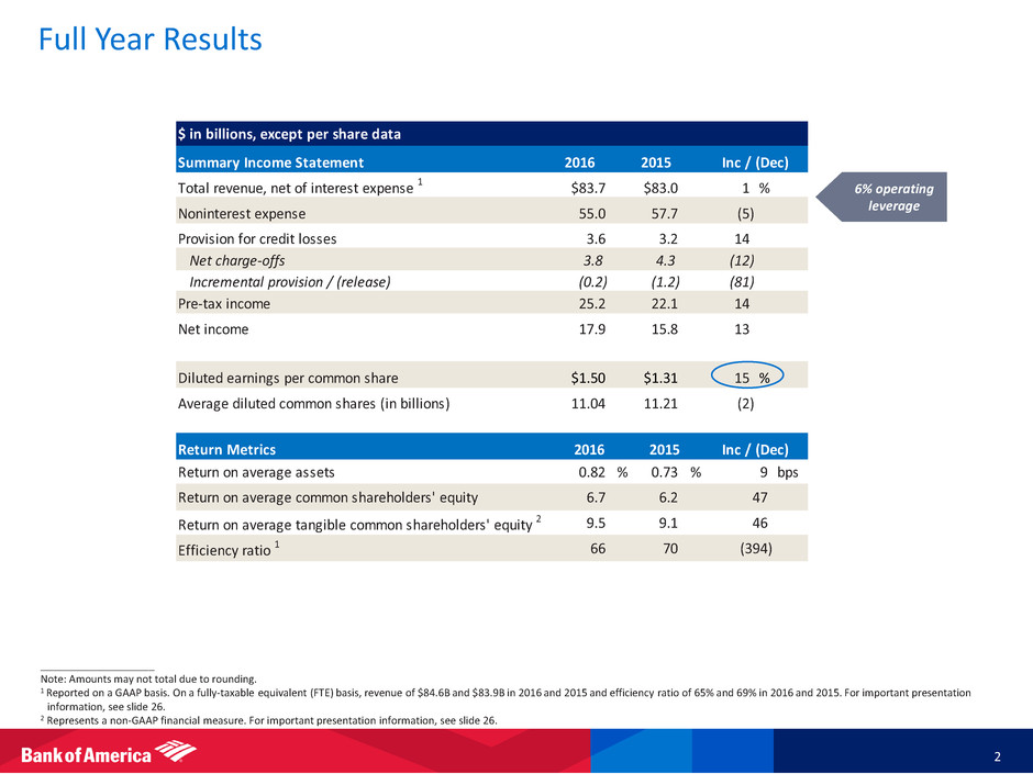 1 Reported on a GAAP basis. On a fully-taxable equivalent (FTE) basis, revenue of $84.6B and $83.9B in 2016 and 2015 and efficiency ratio of 65% and 69% in 2016 and 2015. For important presentation