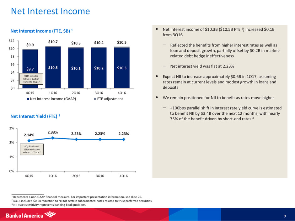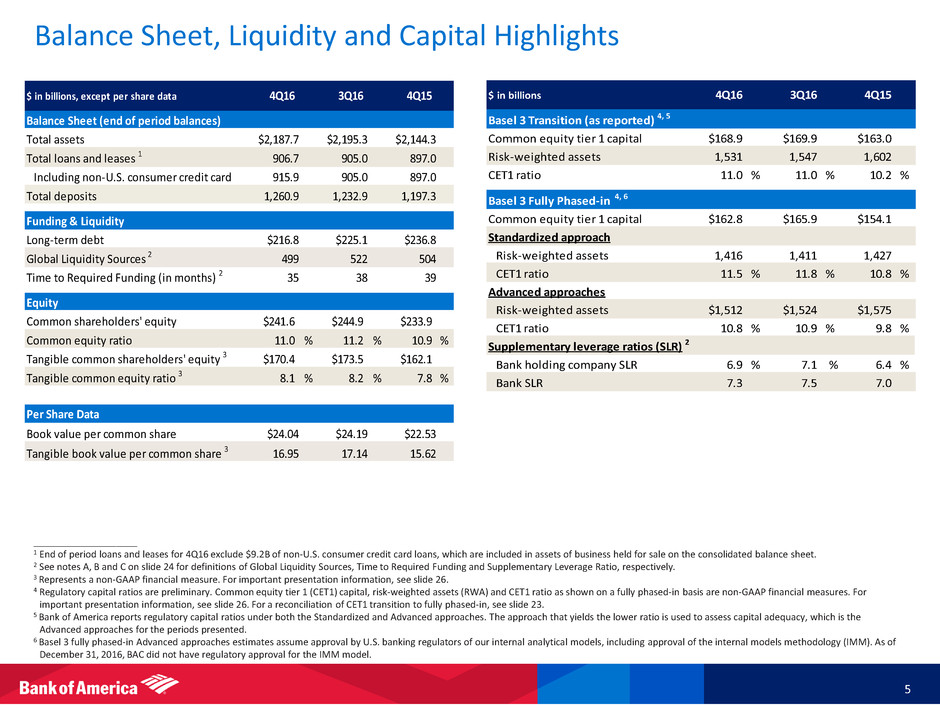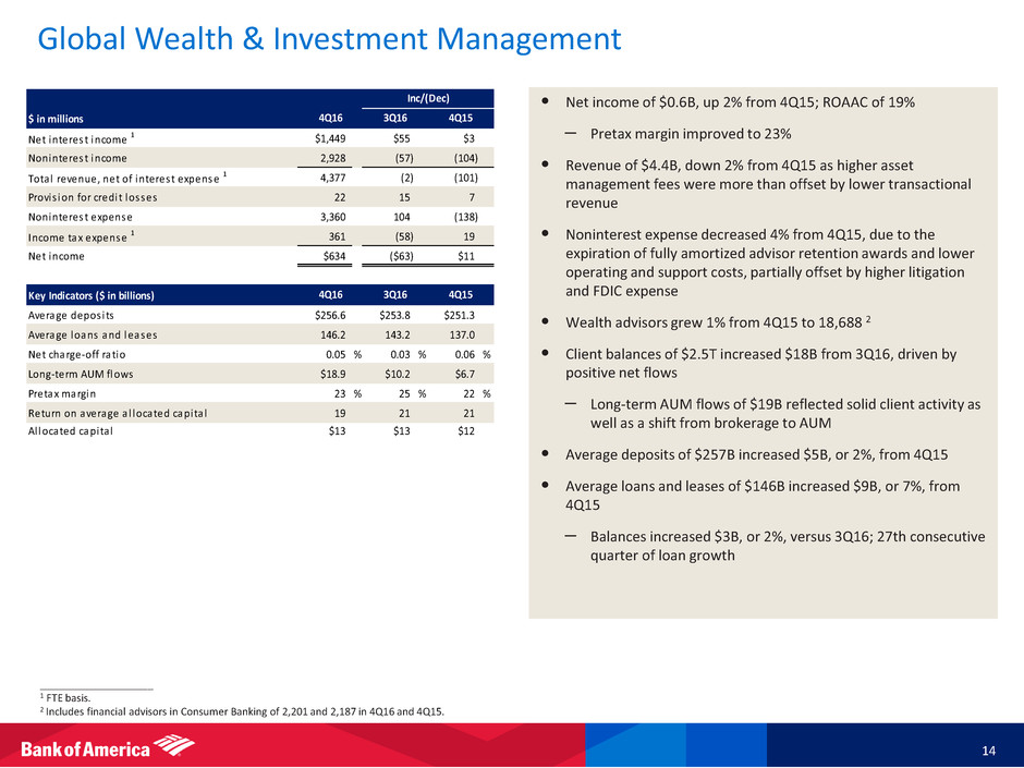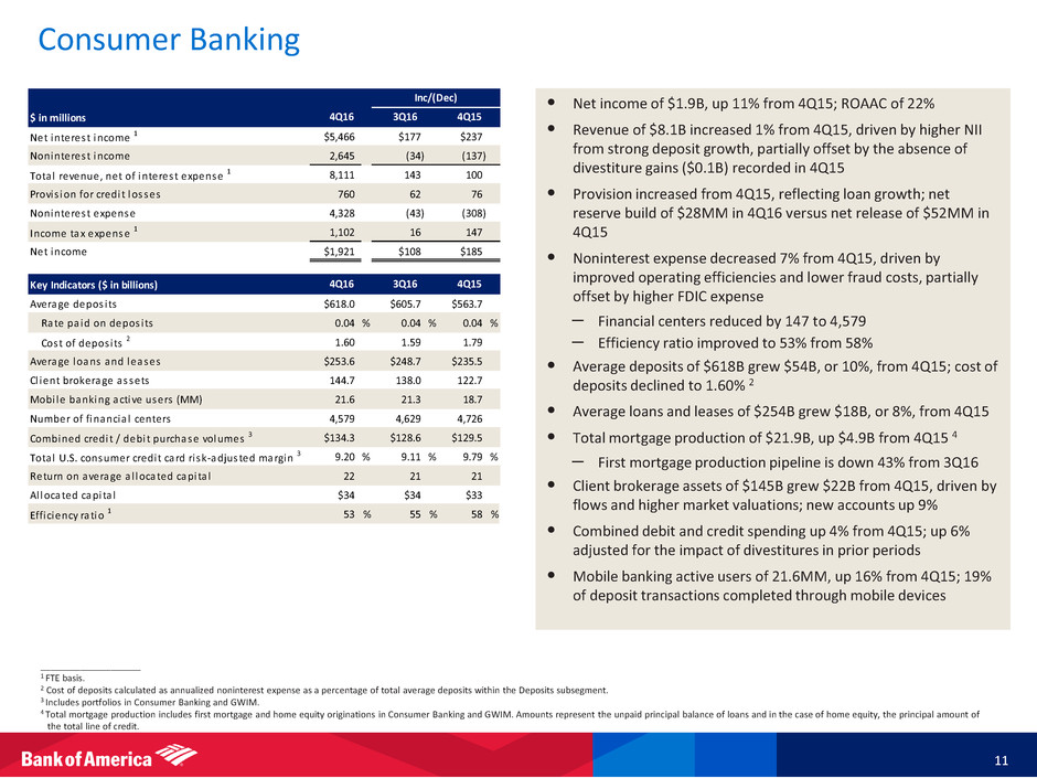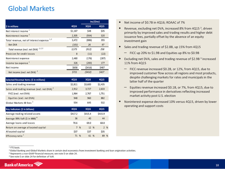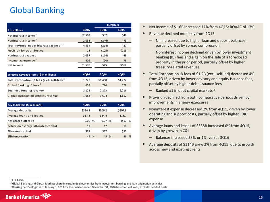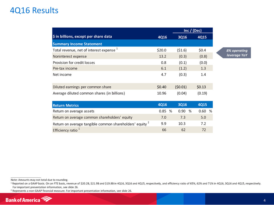 1 Reported on a GAAP basis. On an FTE basis, revenue of $20.2B, $21.9B and $19.8B in 4Q16, 3Q16 and 4Q15, respectively, and efficiency ratio of 65%, 62% and 71% in 4Q16, 3Q16 and 4Q15, respectively.