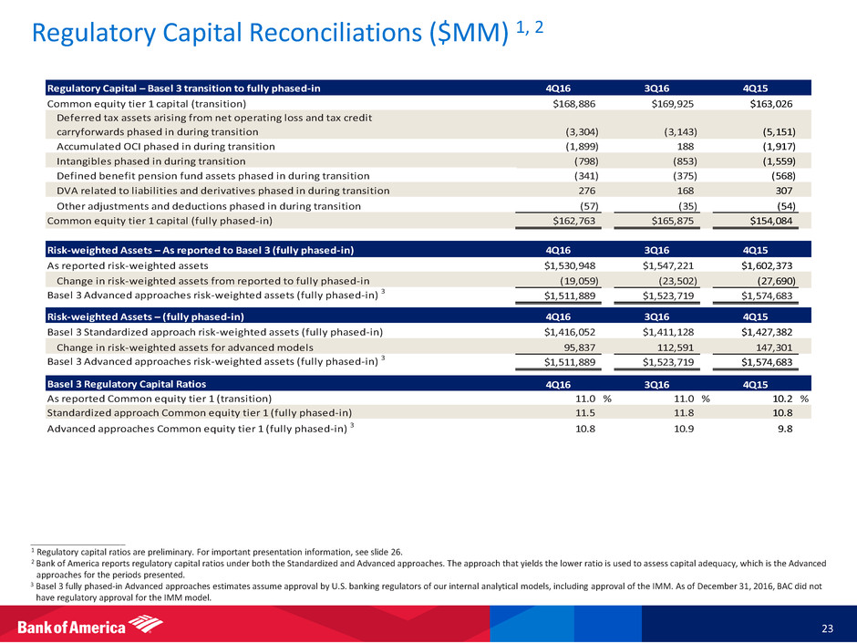 3 Basel 3 fully phased-in Advanced approaches estimates assume approval by U.S. banking regulators of our internal analytical models, including approval of the IMM. As of December 31, 2016, BAC did not