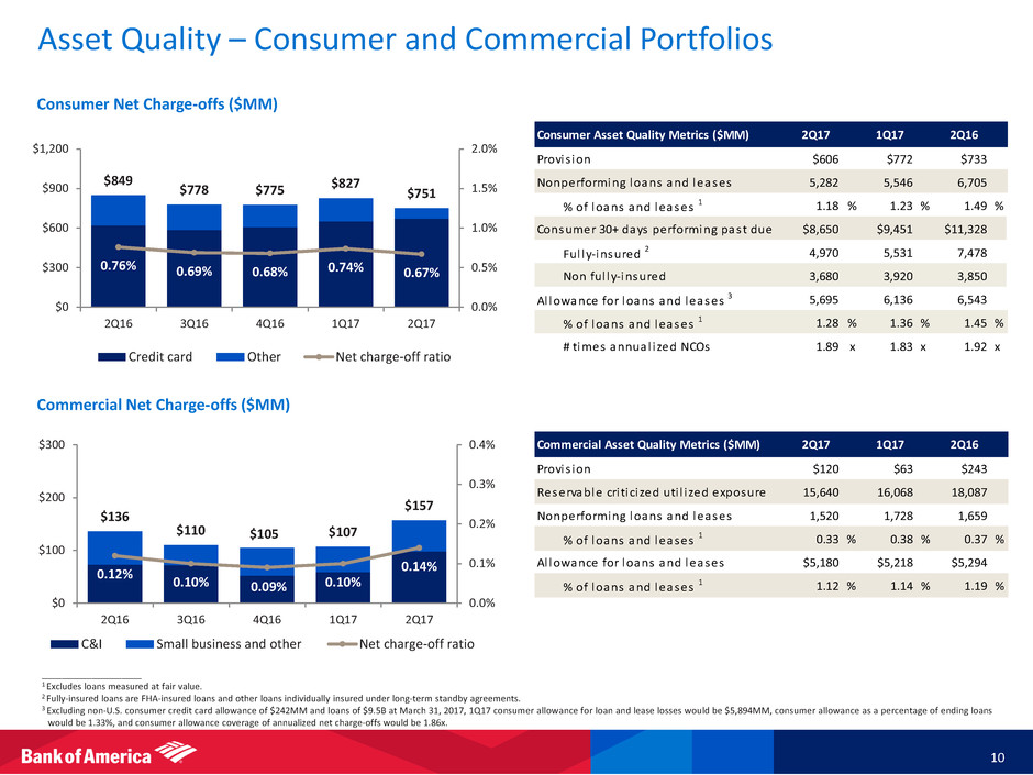 • Asset quality remained strong; declines in net charge-offs, delinquencies, nonperforming loans and leases and