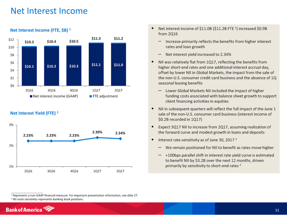 – Net interest income increased 9%, or $0.9B, to $11.0B ($11.2B FTE 1)