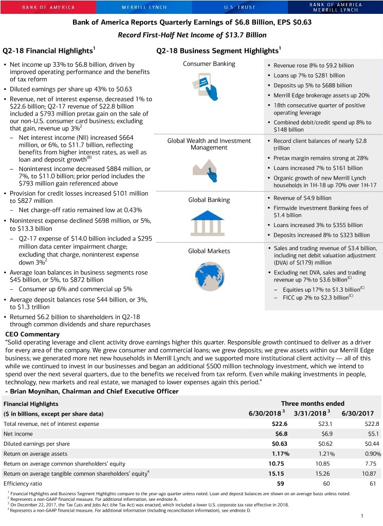 Bank of America Reports Quarterly Earnings of $6.8 Billion, EPS $0.63 Record First-Half Net Income of $13.7 Billion Q2-18 Financial Highlights1 Q2-18 Business Segment Highlights1 • Net income up 33% to $6.8 billion, driven by Consumer Banking • Revenue rose 8% to $9.2 billion improved operating performance and the benefits • Loans up 7% to $281 billion of tax reform • Deposits up 5% to $688 billion • Diluted earnings per share up 43% to $0.63 • Merrill Edge brokerage assets up 20% • Revenue, net of interest expense, decreased 1% to $22.6 billion; Q2-17 revenue of $22.8 billion • 18th consecutive quarter of positive included a $793 million pretax gain on the sale of operating leverage our non-U.S. consumer card business; excluding • Combined debit/credit spend up 8% to 2 that gain, revenue up 3% $148 billion – Net interest income (NII) increased $664 Global Wealth and Investment • Record client balances of nearly $2.8 million, or 6%, to $11.7 billion, reflecting Management trillion benefits from higher interest rates, as well as loan and deposit growth(B) • Pretax margin remains strong at 28% – Noninterest income decreased $884 million, or • Loans increased 7% to $161 billion 7%, to $11.0 billion; prior period includes the • Organic growth of new Merrill Lynch $793 million gain referenced above households in 1H-18 up 70% over 1H-17 • Provision for credit losses increased $101 million Global Banking • Revenue of $4.9 billion to $827 million • – Net charge-off ratio remained low at 0.43% • Firmwide Investment Banking fees of $1.4 billion • Noninterest expense declined $698 million, or 5%, • Loans increased 3% to $355 billion to $13.3 billion • Deposits increased 8% to $323 billion – Q2-17 expense of $14.0 billion included a $295 million data center impairment charge; • Efficiency ratio remained low at 44% Global Markets • Sales and trading revenue of $3.4 billion, excluding that charge, noninterest expense including net debit valuation adjustment down 3%2 (DVA) of $(179) million • Average loan balances in business segments rose • Excluding net DVA, sales and trading $45 billion, or 5%, to $872 billion revenue up 7% to $3.6 billion(C) – Consumer up 6% and commercial up 5% – Equities up 17% to $1.3 billion(C) (C) • Average deposit balances rose $44 billion, or 3%, – FICC up 2% to $2.3 billion to $1.3 trillion • Returned $6.2 billion to shareholders in Q2-18 through common dividends and share repurchases CEO Commentary “Solid operating leverage and client activity drove earnings higher this quarter. Responsible growth continued to deliver as a driver for every area of the company. We grew consumer and commercial loans; we grew deposits; we grew assets within our Merrill Edge business; we generated more net new households in Merrill Lynch; and we supported more institutional client activity — all of this while we continued to invest in our businesses and began an additional $500 million technology investment, which we intend to spend over the next several quarters, due to the benefits we received from tax reform. Even while making investments in people, technology, new markets and real estate, we managed to lower expenses again this period.” - Brian Moynihan, Chairman and Chief Executive Officer Financial Highlights Three months ended ($ in billions, except per share data) 6/30/2018 3 3/31/2018 3 6/30/2017 Total revenue, net of interest expense $22.6 $23.1 $22.8 Net income $6.8 $6.9 $5.1 Diluted earnings per share $0.63 $0.62 $0.44 Return on average assets 1.17% 1.21% 0.90% Return on average common shareholders’ equity 10.75 10.85 7.75 Return on average tangible common shareholders’ equity4 15.15 15.26 10.87 Efficiency ratio 59 60 61 1 Financial Highlights and Business Segment Highlights compare to the year-ago quarter unless noted. Loan and deposit balances are shown on an average basis unless noted. 2 Represents a non-GAAP financial measure. For additional information, see endnote A. 3 On December 22, 2017, the Tax Cuts and Jobs Act (the Tax Act) was enacted, which included a lower U.S. corporate tax rate effective in 2018. 4 Represents a non-GAAP financial measure. For additional information (including reconciliation information), see endnote D. 1