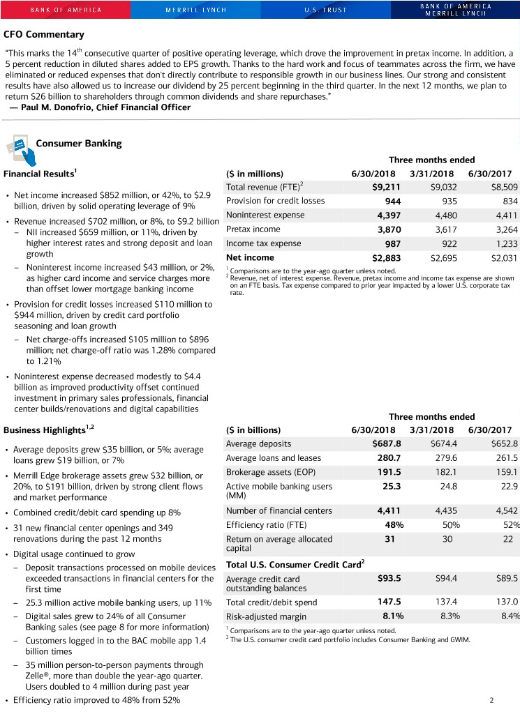 CFO Commentary “This marks the 14th consecutive quarter of positive operating leverage, which drove the improvement in pretax income. In addition, a 5 percent reduction in diluted shares added to EPS growth. Thanks to the hard work and focus of teammates across the firm, we have eliminated or reduced expenses that don't directly contribute to responsible growth in our business lines. Our strong and consistent results have also allowed us to increase our dividend by 25 percent beginning in the third quarter. In the next 12 months, we plan to return $26 billion to shareholders through common dividends and share repurchases.” — Paul M. Donofrio, Chief Financial Officer Consumer Banking Three months ended Financial Results1 ($ in millions) 6/30/2018 3/31/2018 6/30/2017 Total revenue (FTE)2 $9,211 $9,032 $8,509 • Net income increased $852 million, or 42%, to $2.9 Provision for credit losses 944 935 834 billion, driven by solid operating leverage of 9% Noninterest expense 4,397 4,480 4,411 • Revenue increased $702 million, or 8%, to $9.2 billion – NII increased $659 million, or 11%, driven by Pretax income 3,870 3,617 3,264 higher interest rates and strong deposit and loan Income tax expense 987 922 1,233 growth Net income $2,883 $2,695 $2,031 – Noninterest income increased $43 million, or 2%, 1 Comparisons are to the year-ago quarter unless noted. as higher card income and service charges more 2 Revenue, net of interest expense. Revenue, pretax income and income tax expense are shown on an FTE basis. Tax expense compared to prior year impacted by a lower U.S. corporate tax than offset lower mortgage banking income rate. • Provision for credit losses increased $110 million to $944 million, driven by credit card portfolio seasoning and loan growth – Net charge-offs increased $105 million to $896 million; net charge-off ratio was 1.28% compared to 1.21% • Noninterest expense decreased modestly to $4.4 billion as improved productivity offset continued investment in primary sales professionals, financial center builds/renovations and digital capabilities Three months ended Business Highlights1,2 ($ in billions) 6/30/2018 3/31/2018 6/30/2017 Average deposits $687.8 $674.4 $652.8 • Average deposits grew $35 billion, or 5%; average loans grew $19 billion, or 7% Average loans and leases 280.7 279.6 261.5 • Merrill Edge brokerage assets grew $32 billion, or Brokerage assets (EOP) 191.5 182.1 159.1 20%, to $191 billion, driven by strong client flows Active mobile banking users 25.3 24.8 22.9 and market performance (MM) • Combined credit/debit card spending up 8% Number of financial centers 4,411 4,435 4,542 • 31 new financial center openings and 349 Efficiency ratio (FTE) 48% 50% 52% renovations during the past 12 months Return on average allocated 31 30 22 capital • Digital usage continued to grow 2 – Deposit transactions processed on mobile devices Total U.S. Consumer Credit Card exceeded transactions in financial centers for the Average credit card $93.5 $94.4 $89.5 first time outstanding balances – 25.3 million active mobile banking users, up 11% Total credit/debit spend 147.5 137.4 137.0 – Digital sales grew to 24% of all Consumer Risk-adjusted margin 8.1% 8.3% 8.4% Banking sales (see page 8 for more information) 1 Comparisons are to the year-ago quarter unless noted. – Customers logged in to the BAC mobile app 1.4 2 The U.S. consumer credit card portfolio includes Consumer Banking and GWIM. billion times – 35 million person-to-person payments through Zelle®, more than double the year-ago quarter. Users doubled to 4 million during past year • Efficiency ratio improved to 48% from 52% 2