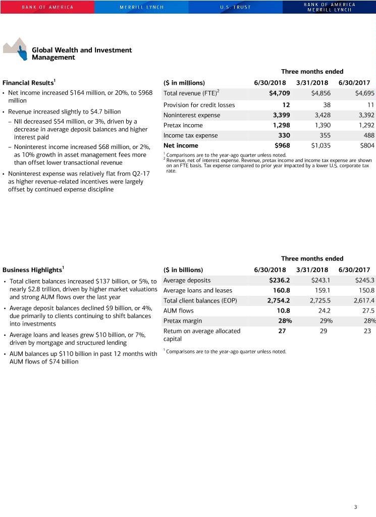 16 Bank of America Corporation and Subsidiaries Year-to-Date Results by Business Segment and All Other (Dollars in millions) Six Months Ended June 30, 2018 Consumer Global Global All Banking GWIM Banking Markets Other Total revenue, net of interest expense (FTE basis) (1) $ 18,243 $ 9,565 $ 9,856 $ 9,007 $ (633) Provision for credit losses 1,879 50 (7) (4) (257) Noninterest expense 8,877 6,827 4,349 5,533 1,595 Net income (loss) 5,578 2,003 4,080 2,574 (533) Return on average allocated capital (2) 30% 28% 20% 15% n/m Balance Sheet Average Total loans and leases $ 280,126 $ 159,969 $ 353,398 $ 74,412 $ 65,470 Total deposits 681,119 239,627 323,807 31,524 22,896 Allocated capital (2) 37,000 14,500 41,000 35,000 n/m Period end Total loans and leases $ 283,565 $ 162,034 $ 355,473 $ 73,496 $ 61,256 Total deposits 695,530 233,925 326,029 31,450 22,757 Six Months Ended June 30, 2017 Consumer Global Global All Banking GWIM Banking Markets Other Total revenue, net of interest expense (FTE basis) (1) $ 16,792 $ 9,287 $ 9,994 $ 8,654 $ 784 Provision for credit losses 1,672 34 32 8 (185) Noninterest expense 8,820 6,721 4,317 5,406 2,811 Net income (loss) 3,923 1,577 3,515 2,127 (699) Return on average allocated capital (2) 21% 23% 18% 12% n/m Balance Sheet Average Total loans and leases $ 259,751 $ 149,615 $ 343,966 $ 69,850 $ 91,250 Total deposits 644,238 251,324 302,827 32,535 25,811 Allocated capital (2) 37,000 14,000 40,000 35,000 n/m Period end Total loans and leases $ 265,938 $ 153,468 $ 344,457 $ 73,973 $ 78,830 Total deposits 662,678 237,131 303,205 33,363 26,603 (1) Fully taxable-equivalent (FTE) basis is a performance measure used by management in operating the business that management believes provides investors a more accurate picture of the interest margin for comparative purposes. The Corporation believes that this presentation allows for comparison of amounts from both taxable and tax-exempt sources and is consistent with industry practices. (2) Return on average allocated capital is calculated as net income, adjusted for cost of funds and earnings credits and certain expenses related to intangibles, divided by average allocated capital. Other companies may define or calculate these measures differently. n/m = not meaningful Certain prior period amounts have been reclassified among the segments to conform to current period presentation. Current period information is preliminary and based on company data available at the time of the presentation.
