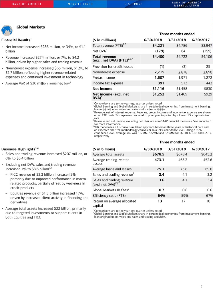 Global Markets Three months ended Financial Results1 ($ in millions) 6/30/2018 3/31/2018 6/30/2017 2,3 • Net income increased $286 million, or 34%, to $1.1 Total revenue (FTE) $4,221 $4,786 $3,947 billion Net DVA4 (179) 64 (159) Total revenue $4,400 $4,722 $4,106 • Revenue increased $274 million, or 7%, to $4.2 2,3,4 billion, driven by higher sales and trading revenue (excl. net DVA) (FTE) • Noninterest expense increased $65 million, or 2%, to Provision for credit losses (1) (3) 25 $2.7 billion, reflecting higher revenue-related Noninterest expense 2,715 2,818 2,650 expenses and continued investment in technology Pretax income 1,507 1,971 1,272 • Average VaR of $30 million remained low5 Income tax expense 391 513 442 Net income $1,116 $1,458 $830 Net income (excl. net $1,252 $1,409 $929 DVA)4 1 Comparisons are to the year-ago quarter unless noted. 2 Global Banking and Global Markets share in certain deal economics from investment banking, loan origination activities and sales and trading activities. 3 Revenue, net of interest expense. Revenue, pretax income and income tax expense are shown on an FTE basis. Tax expense compared to prior year impacted by a lower U.S. corporate tax rate. 4 Revenue and net income, excluding net DVA, are non-GAAP financial measures. See endnote C for more information. 5 VaR model uses a historical simulation approach based on three years of historical data and an expected shortfall methodology equivalent to a 99% confidence level. Using a 95% confidence level, average VaR was $17MM, $22MM and $23MM for Q2-18, Q1-18 and Q2-17, respectively. Three months ended Business Highlights1,2 ($ in billions) 6/30/2018 3/31/2018 6/30/2017 • Sales and trading revenue increased $207 million, or Average total assets $678.5 $678.4 $645.2 6%, to $3.4 billion Average trading-related 473.1 463.2 452.6 • Excluding net DVA, sales and trading revenue assets increased 7% to $3.6 billion(C) Average loans and leases 75.1 73.8 69.6 – FICC revenue of $2.3 billion increased 2%, Sales and trading revenue2 3.4 4.1 3.2 primarily due to improved performance in macro- Sales and trading revenue 3.6 4.1 3.4 related products, partially offset by weakness in (excl. net DVA)(C),2 credit products Global Markets IB fees2 0.7 0.6 0.6 – Equities revenue of $1.3 billion increased 17%, Efficiency ratio (FTE) 64% 59% 67% driven by increased client activity in financing and derivatives Return on average allocated 13 17 10 capital • Average total assets increased $33 billion, primarily 1 Comparisons are to the year-ago quarter unless noted. due to targeted investments to support clients in 2 Global Banking and Global Markets share in certain deal economics from investment banking, both Equities and FICC loan origination activities and sales and trading activities. 5