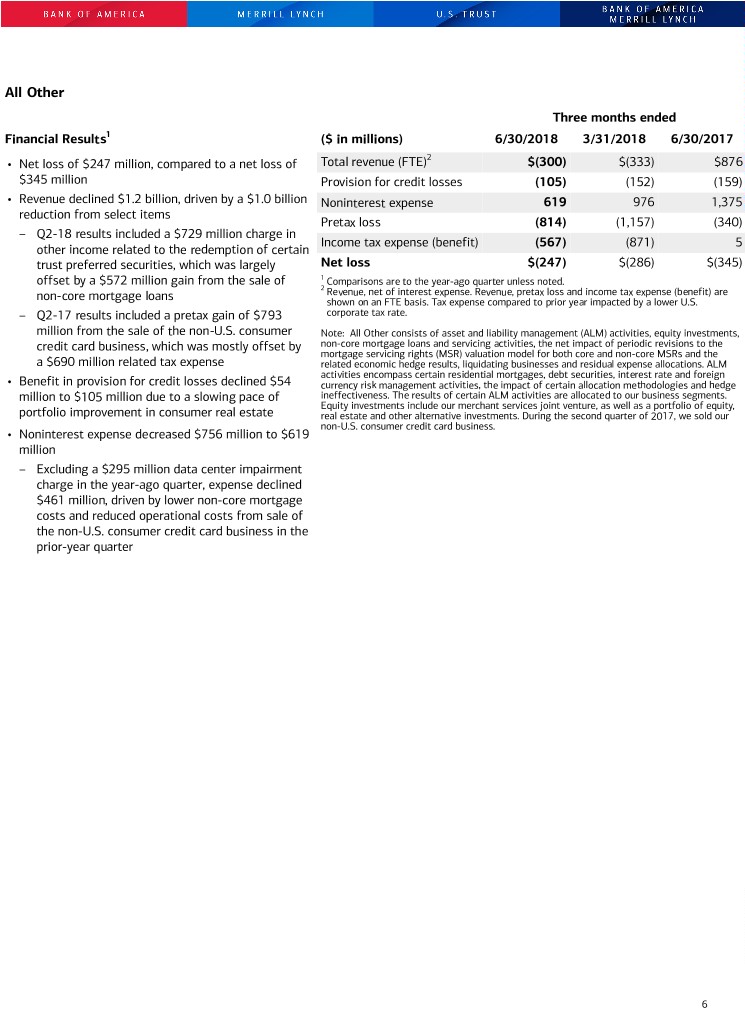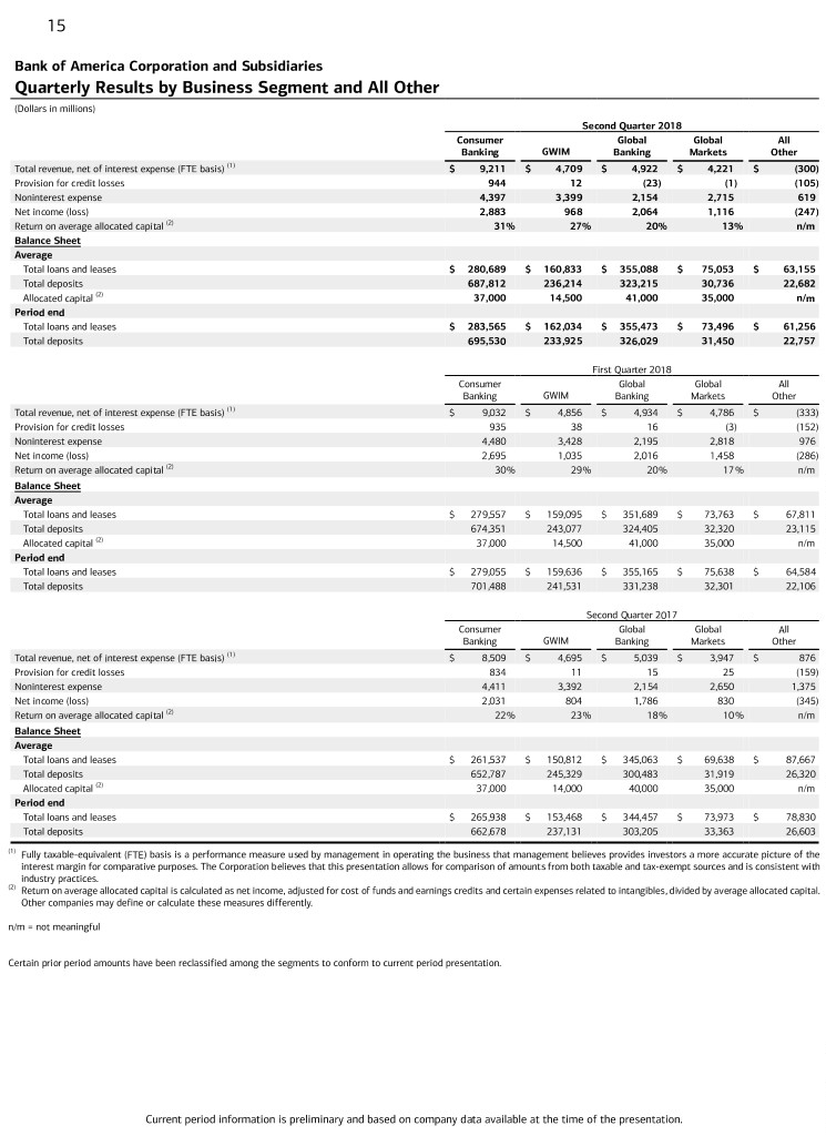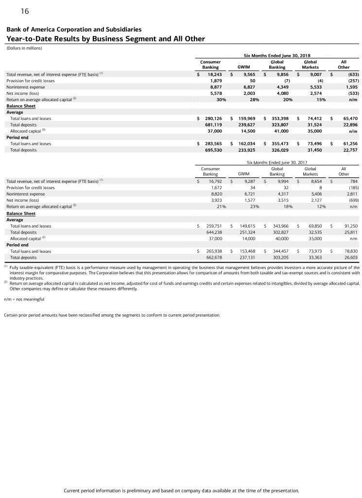 15 Bank of America Corporation and Subsidiaries Quarterly Results by Business Segment and All Other (Dollars in millions) Second Quarter 2018 Consumer Global Global All Banking GWIM Banking Markets Other Total revenue, net of interest expense (FTE basis) (1) $ 9,211 $ 4,709 $ 4,922 $ 4,221 $ (300) Provision for credit losses 944 12 (23) (1) (105) Noninterest expense 4,397 3,399 2,154 2,715 619 Net income (loss) 2,883 968 2,064 1,116 (247) Return on average allocated capital (2) 31% 27% 20% 13% n/m Balance Sheet Average Total loans and leases $ 280,689 $ 160,833 $ 355,088 $ 75,053 $ 63,155 Total deposits 687,812 236,214 323,215 30,736 22,682 Allocated capital (2) 37,000 14,500 41,000 35,000 n/m Period end Total loans and leases $ 283,565 $ 162,034 $ 355,473 $ 73,496 $ 61,256 Total deposits 695,530 233,925 326,029 31,450 22,757 First Quarter 2018 Consumer Global Global All Banking GWIM Banking Markets Other Total revenue, net of interest expense (FTE basis) (1) $ 9,032 $ 4,856 $ 4,934 $ 4,786 $ (333) Provision for credit losses 935 38 16 (3) (152) Noninterest expense 4,480 3,428 2,195 2,818 976 Net income (loss) 2,695 1,035 2,016 1,458 (286) Return on average allocated capital (2) 30% 29% 20% 17% n/m Balance Sheet Average Total loans and leases $ 279,557 $ 159,095 $ 351,689 $ 73,763 $ 67,811 Total deposits 674,351 243,077 324,405 32,320 23,115 Allocated capital (2) 37,000 14,500 41,000 35,000 n/m Period end Total loans and leases $ 279,055 $ 159,636 $ 355,165 $ 75,638 $ 64,584 Total deposits 701,488 241,531 331,238 32,301 22,106 Second Quarter 2017 Consumer Global Global All Banking GWIM Banking Markets Other Total revenue, net of interest expense (FTE basis) (1) $ 8,509 $ 4,695 $ 5,039 $ 3,947 $ 876 Provision for credit losses 834 11 15 25 (159) Noninterest expense 4,411 3,392 2,154 2,650 1,375 Net income (loss) 2,031 804 1,786 830 (345) Return on average allocated capital (2) 22% 23% 18% 10% n/m Balance Sheet Average Total loans and leases $ 261,537 $ 150,812 $ 345,063 $ 69,638 $ 87,667 Total deposits 652,787 245,329 300,483 31,919 26,320 Allocated capital (2) 37,000 14,000 40,000 35,000 n/m Period end Total loans and leases $ 265,938 $ 153,468 $ 344,457 $ 73,973 $ 78,830 Total deposits 662,678 237,131 303,205 33,363 26,603 (1) Fully taxable-equivalent (FTE) basis is a performance measure used by management in operating the business that management believes provides investors a more accurate picture of the interest margin for comparative purposes. The Corporation believes that this presentation allows for comparison of amounts from both taxable and tax-exempt sources and is consistent with industry practices. (2) Return on average allocated capital is calculated as net income, adjusted for cost of funds and earnings credits and certain expenses related to intangibles, divided by average allocated capital. Other companies may define or calculate these measures differently. n/m = not meaningful Certain prior period amounts have been reclassified among the segments to conform to current period presentation. Current period information is preliminary and based on company data available at the time of the presentation.