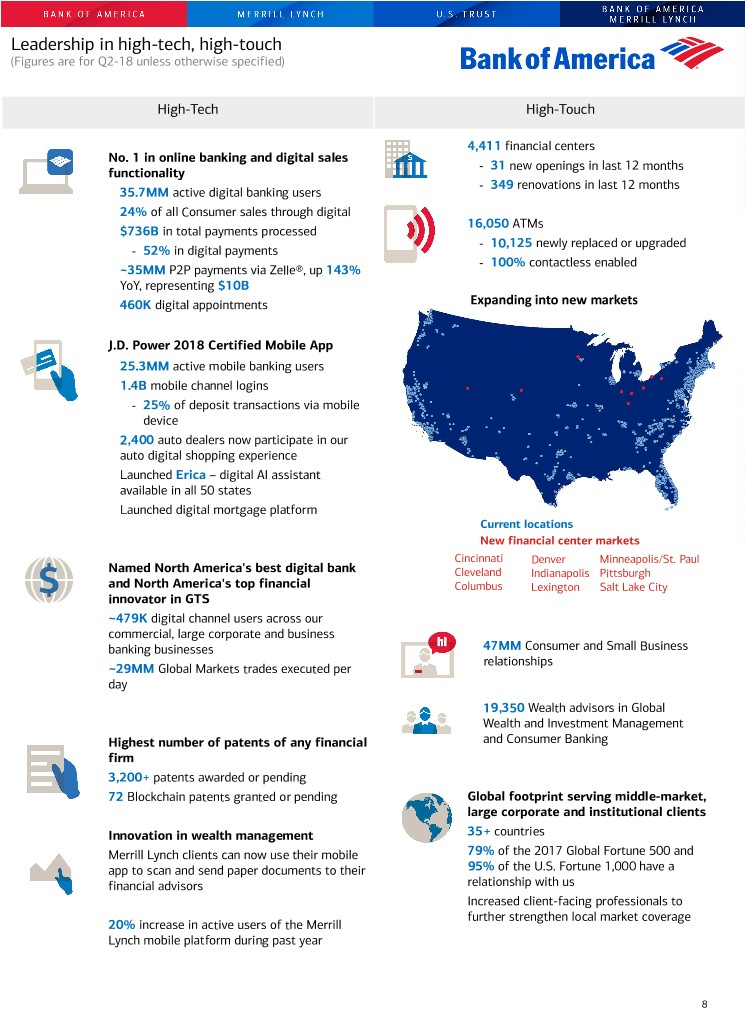 Leadership in high-tech, high-touch (Figures are for Q2-18 unless otherwise specified) High-Tech High-Touch 4,411 financial centers No. 1 in online banking and digital sales ‑ 31 new openings in last 12 months functionality ‑ 349 renovations in last 12 months 35.7MM active digital banking users 24% of all Consumer sales through digital 16,050 ATMs $736B in total payments processed ‑ 10,125 newly replaced or upgraded ‑ 52% in digital payments ‑ 100% contactless enabled ~35MM P2P payments via Zelle®, up 143% YoY, representing $10B 460K digital appointments Expanding into new markets J.D. Power 2018 Certified Mobile App 25.3MM active mobile banking users 1.4B mobile channel logins ‑ 25% of deposit transactions via mobile device 2,400 auto dealers now participate in our auto digital shopping experience Launched Erica – digital AI assistant available in all 50 states Launched digital mortgage platform Current locations New financial center markets Cincinnati Denver Minneapolis/St. Paul Named North America's best digital bank Cleveland Indianapolis Pittsburgh and North America's top financial Columbus Lexington Salt Lake City innovator in GTS ~479K digital channel users across our commercial, large corporate and business banking businesses 47MM Consumer and Small Business relationships ~29MM Global Markets trades executed per day 19,350 Wealth advisors in Global Wealth and Investment Management Highest number of patents of any financial and Consumer Banking firm 3,200+ patents awarded or pending 72 Blockchain patents granted or pending Global footprint serving middle-market, large corporate and institutional clients Innovation in wealth management 35+ countries Merrill Lynch clients can now use their mobile 79% of the 2017 Global Fortune 500 and app to scan and send paper documents to their 95% of the U.S. Fortune 1,000 have a financial advisors relationship with us Increased client-facing professionals to further strengthen local market coverage 20% increase in active users of the Merrill Lynch mobile platform during past year 8