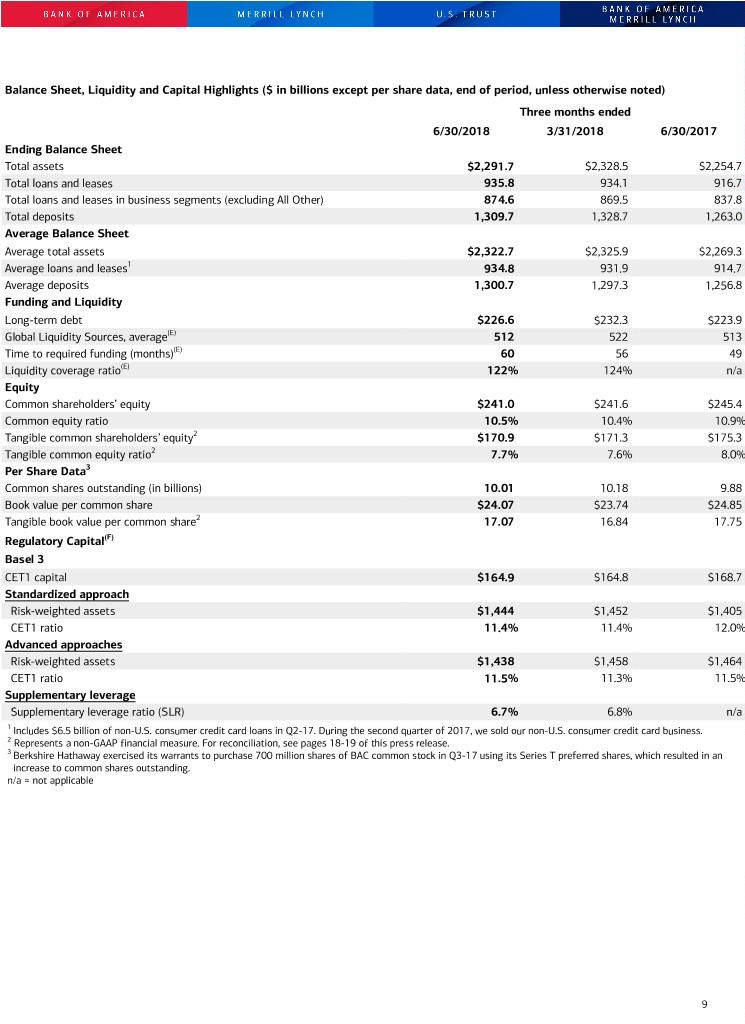 Balance Sheet, Liquidity and Capital Highlights ($ in billions except per share data, end of period, unless otherwise noted) Three months ended 6/30/2018 3/31/2018 6/30/2017 Ending Balance Sheet Total assets $2,291.7 $2,328.5 $2,254.7 Total loans and leases 935.8 934.1 916.7 Total loans and leases in business segments (excluding All Other) 874.6 869.5 837.8 Total deposits 1,309.7 1,328.7 1,263.0 Average Balance Sheet Average total assets $2,322.7 $2,325.9 $2,269.3 Average loans and leases1 934.8 931.9 914.7 Average deposits 1,300.7 1,297.3 1,256.8 Funding and Liquidity Long-term debt $226.6 $232.3 $223.9 Global Liquidity Sources, average(E) 512 522 513 Time to required funding (months)(E) 60 56 49 Liquidity coverage ratio(E) 122% 124% n/a Equity Common shareholders’ equity $241.0 $241.6 $245.4 Common equity ratio 10.5% 10.4% 10.9% Tangible common shareholders’ equity2 $170.9 $171.3 $175.3 Tangible common equity ratio2 7.7% 7.6% 8.0% Per Share Data3 Common shares outstanding (in billions) 10.01 10.18 9.88 Book value per common share $24.07 $23.74 $24.85 Tangible book value per common share2 17.07 16.84 17.75 Regulatory Capital(F) Basel 3 CET1 capital $164.9 $164.8 $168.7 Standardized approach Risk-weighted assets $1,444 $1,452 $1,405 CET1 ratio 11.4% 11.4% 12.0% Advanced approaches Risk-weighted assets $1,438 $1,458 $1,464 CET1 ratio 11.5% 11.3% 11.5% Supplementary leverage Supplementary leverage ratio (SLR) 6.7% 6.8% n/a 1 Includes $6.5 billion of non-U.S. consumer credit card loans in Q2-17. During the second quarter of 2017, we sold our non-U.S. consumer credit card business. 2 Represents a non-GAAP financial measure. For reconciliation, see pages 18-19 of this press release. 3 Berkshire Hathaway exercised its warrants to purchase 700 million shares of BAC common stock in Q3-17 using its Series T preferred shares, which resulted in an increase to common shares outstanding. n/a = not applicable 9