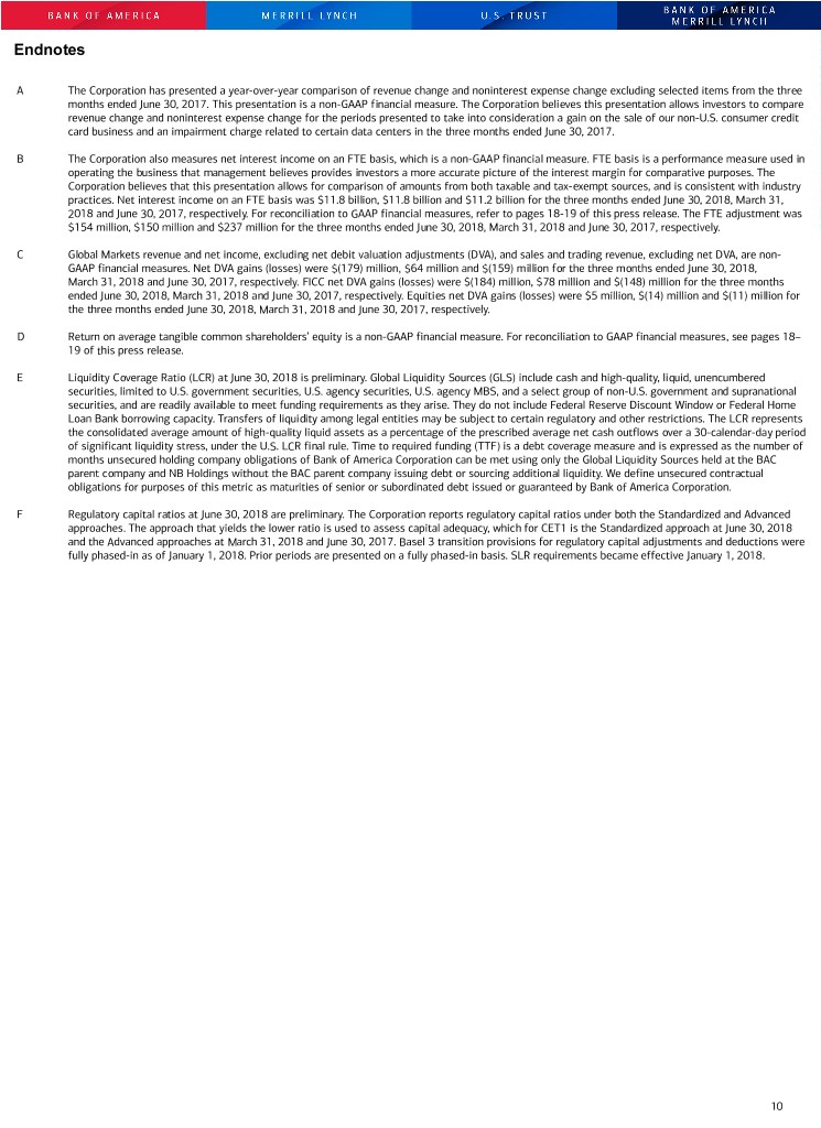 Endnotes A The Corporation has presented a year-over-year comparison of revenue change and noninterest expense change excluding selected items from the three months ended June 30, 2017. This presentation is a non-GAAP financial measure. The Corporation believes this presentation allows investors to compare revenue change and noninterest expense change for the periods presented to take into consideration a gain on the sale of our non-U.S. consumer credit card business and an impairment charge related to certain data centers in the three months ended June 30, 2017. B The Corporation also measures net interest income on an FTE basis, which is a non-GAAP financial measure. FTE basis is a performance measure used in operating the business that management believes provides investors a more accurate picture of the interest margin for comparative purposes. The Corporation believes that this presentation allows for comparison of amounts from both taxable and tax-exempt sources, and is consistent with industry practices. Net interest income on an FTE basis was $11.8 billion, $11.8 billion and $11.2 billion for the three months ended June 30, 2018, March 31, 2018 and June 30, 2017, respectively. For reconciliation to GAAP financial measures, refer to pages 18-19 of this press release. The FTE adjustment was $154 million, $150 million and $237 million for the three months ended June 30, 2018, March 31, 2018 and June 30, 2017, respectively. C Global Markets revenue and net income, excluding net debit valuation adjustments (DVA), and sales and trading revenue, excluding net DVA, are non- GAAP financial measures. Net DVA gains (losses) were $(179) million, $64 million and $(159) million for the three months ended June 30, 2018, March 31, 2018 and June 30, 2017, respectively. FICC net DVA gains (losses) were $(184) million, $78 million and $(148) million for the three months ended June 30, 2018, March 31, 2018 and June 30, 2017, respectively. Equities net DVA gains (losses) were $5 million, $(14) million and $(11) million for the three months ended June 30, 2018, March 31, 2018 and June 30, 2017, respectively. D Return on average tangible common shareholders’ equity is a non-GAAP financial measure. For reconciliation to GAAP financial measures, see pages 18– 19 of this press release. E Liquidity Coverage Ratio (LCR) at June 30, 2018 is preliminary. Global Liquidity Sources (GLS) include cash and high-quality, liquid, unencumbered securities, limited to U.S. government securities, U.S. agency securities, U.S. agency MBS, and a select group of non-U.S. government and supranational securities, and are readily available to meet funding requirements as they arise. They do not include Federal Reserve Discount Window or Federal Home Loan Bank borrowing capacity. Transfers of liquidity among legal entities may be subject to certain regulatory and other restrictions. The LCR represents the consolidated average amount of high-quality liquid assets as a percentage of the prescribed average net cash outflows over a 30-calendar-day period of significant liquidity stress, under the U.S. LCR final rule. Time to required funding (TTF) is a debt coverage measure and is expressed as the number of months unsecured holding company obligations of Bank of America Corporation can be met using only the Global Liquidity Sources held at the BAC parent company and NB Holdings without the BAC parent company issuing debt or sourcing additional liquidity. We define unsecured contractual obligations for purposes of this metric as maturities of senior or subordinated debt issued or guaranteed by Bank of America Corporation. F Regulatory capital ratios at June 30, 2018 are preliminary. The Corporation reports regulatory capital ratios under both the Standardized and Advanced approaches. The approach that yields the lower ratio is used to assess capital adequacy, which for CET1 is the Standardized approach at June 30, 2018 and the Advanced approaches at March 31, 2018 and June 30, 2017. Basel 3 transition provisions for regulatory capital adjustments and deductions were fully phased-in as of January 1, 2018. Prior periods are presented on a fully phased-in basis. SLR requirements became effective January 1, 2018. 10