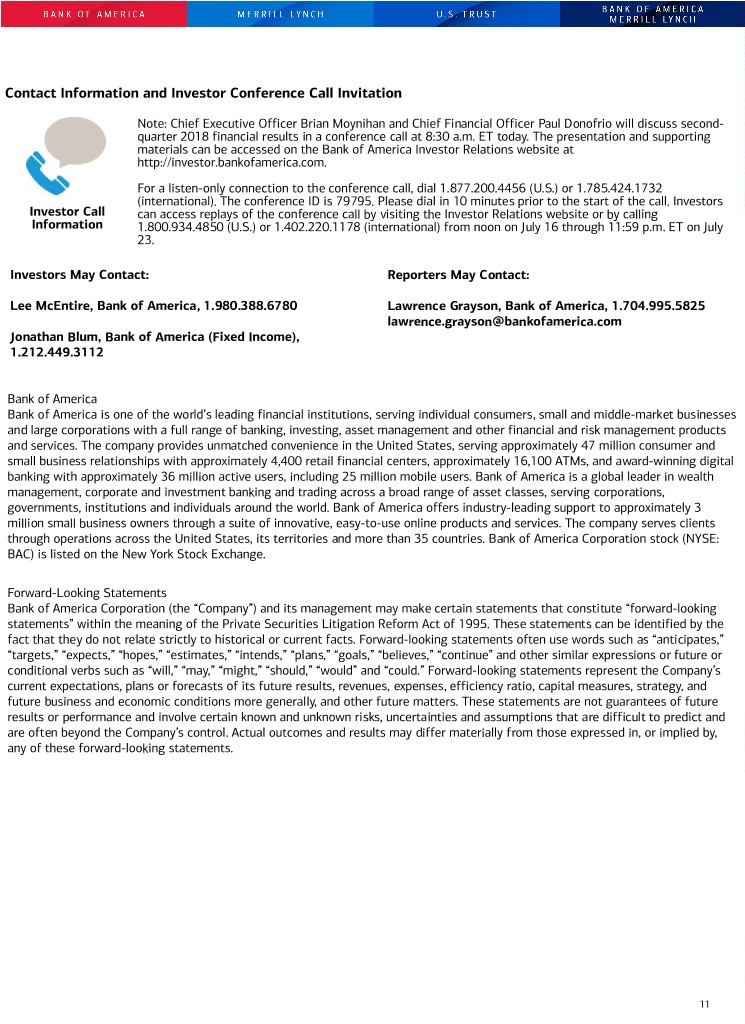 Contact Information and Investor Conference Call Invitation Note: Chief Executive Officer Brian Moynihan and Chief Financial Officer Paul Donofrio will discuss second- quarter 2018 financial results in a conference call at 8:30 a.m. ET today. The presentation and supporting materials can be accessed on the Bank of America Investor Relations website at http://investor.bankofamerica.com. For a listen-only connection to the conference call, dial 1.877.200.4456 (U.S.) or 1.785.424.1732 (international). The conference ID is 79795. Please dial in 10 minutes prior to the start of the call. Investors Investor Call can access replays of the conference call by visiting the Investor Relations website or by calling Information 1.800.934.4850 (U.S.) or 1.402.220.1178 (international) from noon on July 16 through 11:59 p.m. ET on July 23. Investors May Contact: Reporters May Contact: Lee McEntire, Bank of America, 1.980.388.6780 Lawrence Grayson, Bank of America, 1.704.995.5825 lawrence.grayson@bankofamerica.com Jonathan Blum, Bank of America (Fixed Income), 1.212.449.3112 Bank of America Bank of America is one of the world’s leading financial institutions, serving individual consumers, small and middle-market businesses and large corporations with a full range of banking, investing, asset management and other financial and risk management products and services. The company provides unmatched convenience in the United States, serving approximately 47 million consumer and small business relationships with approximately 4,400 retail financial centers, approximately 16,100 ATMs, and award-winning digital banking with approximately 36 million active users, including 25 million mobile users. Bank of America is a global leader in wealth management, corporate and investment banking and trading across a broad range of asset classes, serving corporations, governments, institutions and individuals around the world. Bank of America offers industry-leading support to approximately 3 million small business owners through a suite of innovative, easy-to-use online products and services. The company serves clients through operations across the United States, its territories and more than 35 countries. Bank of America Corporation stock (NYSE: BAC) is listed on the New York Stock Exchange. Forward-Looking Statements Bank of America Corporation (the “Company”) and its management may make certain statements that constitute “forward-looking statements” within the meaning of the Private Securities Litigation Reform Act of 1995. These statements can be identified by the fact that they do not relate strictly to historical or current facts. Forward-looking statements often use words such as “anticipates,” “targets,” “expects,” “hopes,” “estimates,” “intends,” “plans,” “goals,” “believes,” “continue” and other similar expressions or future or conditional verbs such as “will,” “may,” “might,” “should,” “would” and “could.” Forward-looking statements represent the Company’s current expectations, plans or forecasts of its future results, revenues, expenses, efficiency ratio, capital measures, strategy, and future business and economic conditions more generally, and other future matters. These statements are not guarantees of future results or performance and involve certain known and unknown risks, uncertainties and assumptions that are difficult to predict and are often beyond the Company’s control. Actual outcomes and results may differ materially from those expressed in, or implied by, any of these forward-looking statements. 11