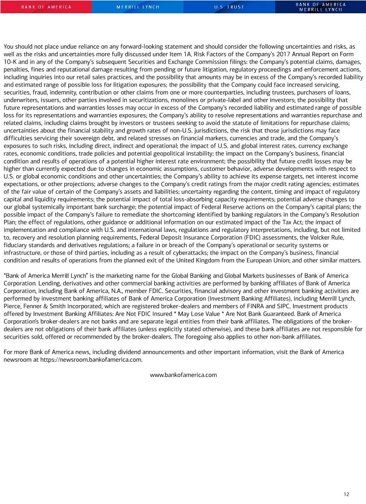 You should not place undue reliance on any forward-looking statement and should consider the following uncertainties and risks, as well as the risks and uncertainties more fully discussed under Item 1A. Risk Factors of the Company’s 2017 Annual Report on Form 10-K and in any of the Company’s subsequent Securities and Exchange Commission filings: the Company’s potential claims, damages, penalties, fines and reputational damage resulting from pending or future litigation, regulatory proceedings and enforcement actions, including inquiries into our retail sales practices, and the possibility that amounts may be in excess of the Company’s recorded liability and estimated range of possible loss for litigation exposures; the possibility that the Company could face increased servicing, securities, fraud, indemnity, contribution or other claims from one or more counterparties, including trustees, purchasers of loans, underwriters, issuers, other parties involved in securitizations, monolines or private-label and other investors; the possibility that future representations and warranties losses may occur in excess of the Company’s recorded liability and estimated range of possible loss for its representations and warranties exposures; the Company’s ability to resolve representations and warranties repurchase and related claims, including claims brought by investors or trustees seeking to avoid the statute of limitations for repurchase claims; uncertainties about the financial stability and growth rates of non-U.S. jurisdictions, the risk that those jurisdictions may face difficulties servicing their sovereign debt, and related stresses on financial markets, currencies and trade, and the Company’s exposures to such risks, including direct, indirect and operational; the impact of U.S. and global interest rates, currency exchange rates, economic conditions, trade policies and potential geopolitical instability; the impact on the Company’s business, financial condition and results of operations of a potential higher interest rate environment; the possibility that future credit losses may be higher than currently expected due to changes in economic assumptions, customer behavior, adverse developments with respect to U.S. or global economic conditions and other uncertainties; the Company’s ability to achieve its expense targets, net interest income expectations, or other projections; adverse changes to the Company’s credit ratings from the major credit rating agencies; estimates of the fair value of certain of the Company’s assets and liabilities; uncertainty regarding the content, timing and impact of regulatory capital and liquidity requirements; the potential impact of total loss-absorbing capacity requirements; potential adverse changes to our global systemically important bank surcharge; the potential impact of Federal Reserve actions on the Company’s capital plans; the possible impact of the Company’s failure to remediate the shortcoming identified by banking regulators in the Company’s Resolution Plan; the effect of regulations, other guidance or additional information on our estimated impact of the Tax Act; the impact of implementation and compliance with U.S. and international laws, regulations and regulatory interpretations, including, but not limited to, recovery and resolution planning requirements, Federal Deposit Insurance Corporation (FDIC) assessments, the Volcker Rule, fiduciary standards and derivatives regulations; a failure in or breach of the Company’s operational or security systems or infrastructure, or those of third parties, including as a result of cyberattacks; the impact on the Company’s business, financial condition and results of operations from the planned exit of the United Kingdom from the European Union; and other similar matters. “Bank of America Merrill Lynch” is the marketing name for the Global Banking and Global Markets businesses of Bank of America Corporation. Lending, derivatives and other commercial banking activities are performed by banking affiliates of Bank of America Corporation, including Bank of America, N.A., member FDIC. Securities, financial advisory and other investment banking activities are performed by investment banking affiliates of Bank of America Corporation (Investment Banking Affiliates), including Merrill Lynch, Pierce, Fenner & Smith Incorporated, which are registered broker-dealers and members of FINRA and SIPC. Investment products offered by Investment Banking Affiliates: Are Not FDIC Insured * May Lose Value * Are Not Bank Guaranteed. Bank of America Corporation’s broker-dealers are not banks and are separate legal entities from their bank affiliates. The obligations of the broker- dealers are not obligations of their bank affiliates (unless explicitly stated otherwise), and these bank affiliates are not responsible for securities sold, offered or recommended by the broker-dealers. The foregoing also applies to other non-bank affiliates. For more Bank of America news, including dividend announcements and other important information, visit the Bank of America newsroom at https://newsroom.bankofamerica.com. www.bankofamerica.com 12