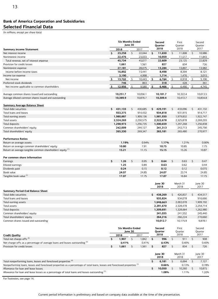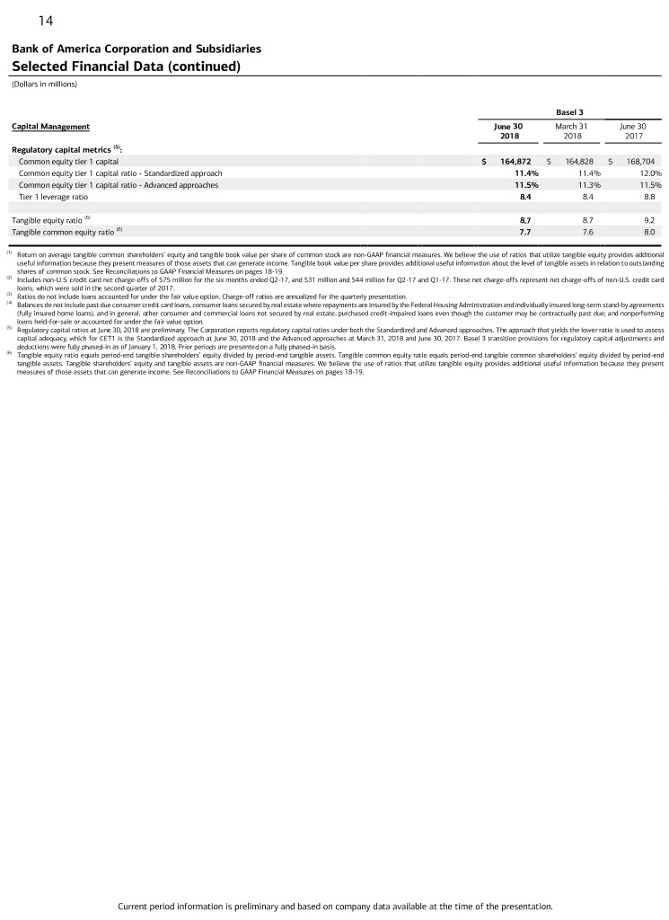 13 Bank of America Corporation and Subsidiaries Selected Financial Data (In millions, except per share data) Six Months Ended Second First Second June 30 Quarter Quarter Quarter Summary Income Statement 2018 2017 2018 2018 2017 Net interest income $ 23,258 $ 22,044 $ 11,650 $ 11,608 $ 10,986 Noninterest income 22,476 23,033 10,959 11,517 11,843 Total revenue, net of interest expense 45,734 45,077 22,609 23,125 22,829 Provision for credit losses 1,661 1,561 827 834 726 Noninterest expense 27,181 28,075 13,284 13,897 13,982 Income before income taxes 16,892 15,441 8,498 8,394 8,121 Income tax expense 3,190 4,998 1,714 1,476 3,015 Net income $ 13,702 $ 10,443 $ 6,784 $ 6,918 $ 5,106 Preferred stock dividends 746 863 318 428 361 Net income applicable to common shareholders $ 12,956 $ 9,580 $ 6,466 $ 6,490 $ 4,745 Average common shares issued and outstanding 10,251.7 10,056.1 10,181.7 10,322.4 10,013.5 Average diluted common shares issued and outstanding 10,389.9 10,876.7 10,309.4 10,472.7 10,834.8 Summary Average Balance Sheet Total debt securities $ 431,133 $ 430,685 $ 429,191 $ 433,096 $ 431,132 Total loans and leases 933,375 914,432 934,818 931,915 914,717 Total earning assets 1,980,887 1,909,136 1,981,930 1,979,832 1,922,747 Total assets 2,324,269 2,250,575 2,322,678 2,325,878 2,269,293 Total deposits 1,298,973 1,256,735 1,300,659 1,297,268 1,256,838 Common shareholders’ equity 242,009 244,127 241,313 242,713 245,756 Total shareholders’ equity 265,330 269,347 265,181 265,480 270,977 Performance Ratios Return on average assets 1.19% 0.94% 1.17% 1.21% 0.90% Return on average common shareholders’ equity 10.80 7.91 10.75 10.85 7.75 Return on average tangible common shareholders’ equity (1) 15.21 11.15 15.15 15.26 10.87 Per common share information Earnings $ 1.26 $ 0.95 $ 0.64 $ 0.63 $ 0.47 Diluted earnings 1.25 0.89 0.63 0.62 0.44 Dividends paid 0.24 0.15 0.12 0.12 0.075 Book value 24.07 24.85 24.07 23.74 24.85 Tangible book value (1) 17.07 17.75 17.07 16.84 17.75 June 30 March 31 June 30 2018 2018 2017 Summary Period-End Balance Sheet Total debt securities $ 438,269 $ 426,837 $ 434,517 Total loans and leases 935,824 934,078 916,666 Total earning assets 1,948,663 2,002,678 1,909,192 Total assets 2,291,670 2,328,478 2,254,714 Total deposits 1,309,691 1,328,664 1,262,980 Common shareholders’ equity 241,035 241,552 245,440 Total shareholders’ equity 264,216 266,224 270,660 Common shares issued and outstanding 10,012.7 10,175.9 9,878.1 Six Months Ended Second First Second June 30 Quarter Quarter Quarter Credit Quality 2018 2017 2018 2018 2017 Total net charge-offs (2) $ 1,907 $ 1,842 $ 996 $ 911 $ 908 Net charge-offs as a percentage of average loans and leases outstanding (3) 0.41% 0.41% 0.43% 0.40% 0.40% Provision for credit losses $ 1,661 $ 1,561 $ 827 $ 834 $ 726 June 30 March 31 June 30 2018 2018 2017 Total nonperforming loans, leases and foreclosed properties (4) $ 6,181 $ 6,694 $ 7,127 Nonperforming loans, leases and foreclosed properties as a percentage of total loans, leases and foreclosed properties (3) 0.66% 0.72% 0.78% Allowance for loan and lease losses $ 10,050 $ 10,260 $ 10,875 Allowance for loan and lease losses as a percentage of total loans and leases outstanding (3) 1.08% 1.11% 1.20% For footnotes, see page 14. Current period information is preliminary and based on company data available at the time of the presentation.