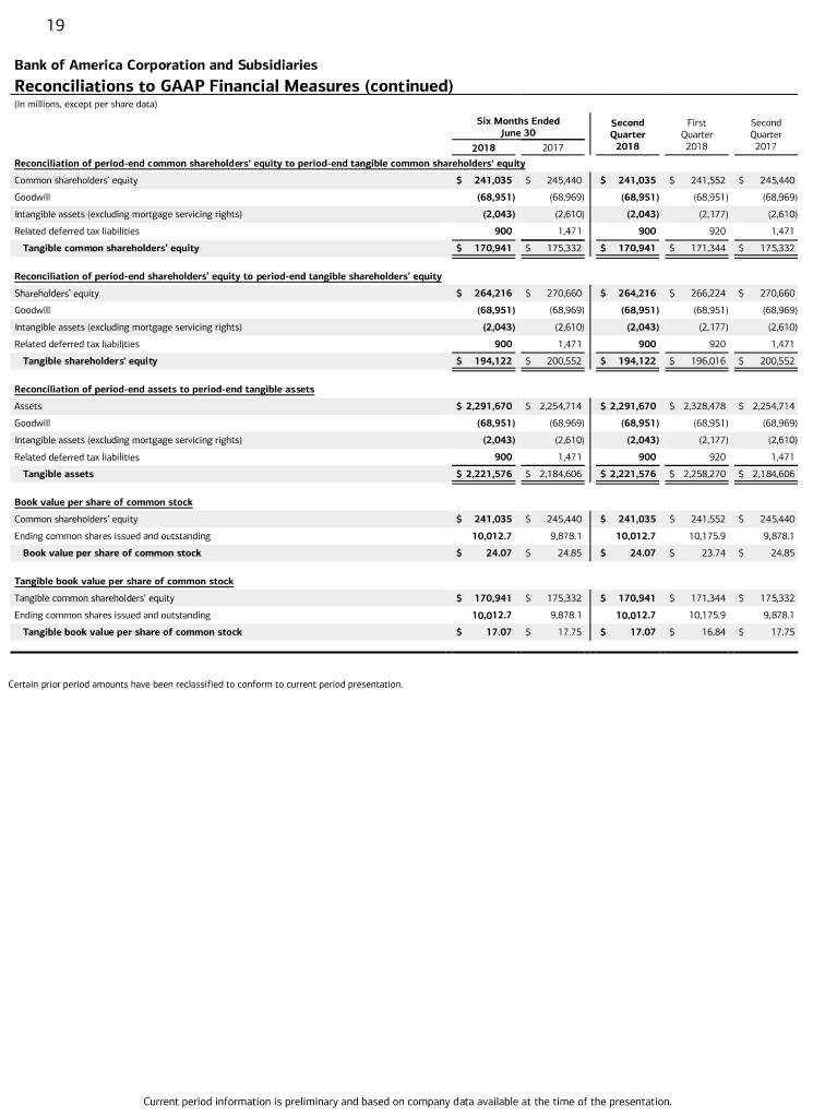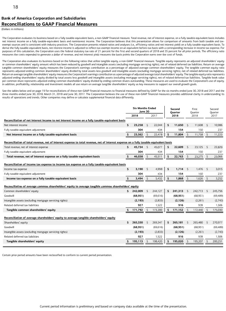 18 Bank of America Corporation and Subsidiaries Reconciliations to GAAP Financial Measures (Dollars in millions) The Corporation evaluates its business based on a fully taxable-equivalent basis, a non-GAAP financial measure. Total revenue, net of interest expense, on a fully taxable-equivalent basis includes net interest income on a fully taxable-equivalent basis and noninterest income. The Corporation believes that this presentation allows for comparison of amounts from both taxable and tax- exempt sources and is consistent with industry practices. The Corporation presents related ratios and analyses (i.e., efficiency ratios and net interest yield) on a fully taxable-equivalent basis. To derive the fully taxable-equivalent basis, net interest income is adjusted to reflect tax-exempt income on an equivalent before-tax basis with a corresponding increase in income tax expense. For purposes of this calculation, the Corporation uses the federal statutory tax rate of 21 percent for the first and second quarters of 2018 and 35 percent for all prior periods. The efficiency ratio measures the costs expended to generate a dollar of revenue, and net interest yield measures the basis points the Corporation earns over the cost of funds. The Corporation also evaluates its business based on the following ratios that utilize tangible equity, a non-GAAP financial measure. Tangible equity represents an adjusted shareholders’ equity or common shareholders’ equity amount which has been reduced by goodwill and intangible assets (excluding mortgage servicing rights), net of related deferred tax liabilities. Return on average tangible common shareholders’ equity measures the Corporation’s earnings contribution as a percentage of adjusted average common shareholders’ equity. The tangible common equity ratio represents adjusted ending common shareholders’ equity divided by total assets less goodwill and intangible assets (excluding mortgage servicing rights), net of related deferred tax liabilities. Return on average tangible shareholders’ equity measures the Corporation’s earnings contribution as a percentage of adjusted average total shareholders’ equity. The tangible equity ratio represents adjusted ending shareholders’ equity divided by total assets less goodwill and intangible assets (excluding mortgage servicing rights), net of related deferred tax liabilities. Tangible book value per common share represents adjusted ending common shareholders’ equity divided by ending common shares outstanding. These measures are used to evaluate the Corporation’s use of equity. In addition, profitability, relationship and investment models all use return on average tangible shareholders’ equity as key measures to support our overall growth goals. See the tables below and on page 19 for reconciliations of these non-GAAP financial measures to financial measures defined by GAAP for the six months ended June 30, 2018 and 2017 and the three months ended June 30, 2018, March 31, 2018 and June 30, 2017. The Corporation believes the use of these non-GAAP financial measures provides additional clarity in understanding its results of operations and trends. Other companies may define or calculate supplemental financial data differently. Six Months Ended Second First Second June 30 Quarter Quarter Quarter 2018 2017 2018 2018 2017 Reconciliation of net interest income to net interest income on a fully taxable-equivalent basis Net interest income $ 23,258 $ 22,044 $ 11,650 $ 11,608 $ 10,986 Fully taxable-equivalent adjustment 304 434 154 150 237 Net interest income on a fully taxable-equivalent basis $ 23,562 $ 22,478 $ 11,804 $ 11,758 $ 11,223 Reconciliation of total revenue, net of interest expense to total revenue, net of interest expense on a fully taxable-equivalent basis Total revenue, net of interest expense $ 45,734 $ 45,077 $ 22,609 $ 23,125 $ 22,829 Fully taxable-equivalent adjustment 304 434 154 150 237 Total revenue, net of interest expense on a fully taxable-equivalent basis $ 46,038 $ 45,511 $ 22,763 $ 23,275 $ 23,066 Reconciliation of income tax expense to income tax expense on a fully taxable-equivalent basis Income tax expense $ 3,190 $ 4,998 $ 1,714 $ 1,476 $ 3,015 Fully taxable-equivalent adjustment 304 434 154 150 237 Income tax expense on a fully taxable-equivalent basis $ 3,494 $ 5,432 $ 1,868 $ 1,626 $ 3,252 Reconciliation of average common shareholders’ equity to average tangible common shareholders’ equity Common shareholders’ equity $ 242,009 $ 244,127 $ 241,313 $ 242,713 $ 245,756 Goodwill (68,951) (69,616) (68,951) (68,951) (69,489) Intangible assets (excluding mortgage servicing rights) (2,193) (2,833) (2,126) (2,261) (2,743) Related deferred tax liabilities 927 1,522 916 939 1,506 Tangible common shareholders’ equity $ 171,792 $ 173,200 $ 171,152 $ 172,440 $ 175,030 Reconciliation of average shareholders’ equity to average tangible shareholders’ equity Shareholders’ equity $ 265,330 $ 269,347 $ 265,181 $ 265,480 $ 270,977 Goodwill (68,951) (69,616) (68,951) (68,951) (69,489) Intangible assets (excluding mortgage servicing rights) (2,193) (2,833) (2,126) (2,261) (2,743) Related deferred tax liabilities 927 1,522 916 939 1,506 Tangible shareholders’ equity $ 195,113 $ 198,420 $ 195,020 $ 195,207 $ 200,251 Certain prior period amounts have been reclassified to conform to current period presentation. Current period information is preliminary and based on company data available at the time of the presentation.