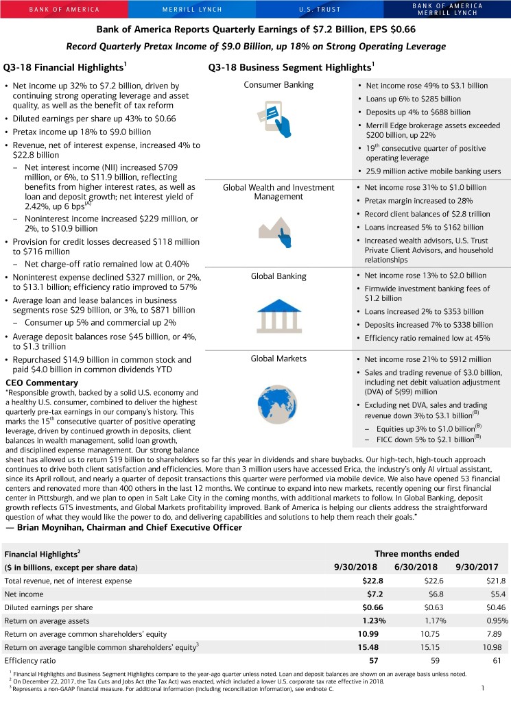 Bank of America Reports Quarterly Earnings of $7.2 Billion, EPS $0.66 Record Quarterly Pretax Income of $9.0 Billion, up 18% on Strong Operating Leverage Q3-18 Financial Highlights1 Q3-18 Business Segment Highlights1 • Net income up 32% to $7.2 billion, driven by Consumer Banking • Net income rose 49% to $3.1 billion continuing strong operating leverage and asset • Loans up 6% to $285 billion quality, as well as the benefit of tax reform • Deposits up 4% to $688 billion • Diluted earnings per share up 43% to $0.66 • Merrill Edge brokerage assets exceeded • Pretax income up 18% to $9.0 billion $200 billion, up 22% • Revenue, net of interest expense, increased 4% to • 19th consecutive quarter of positive $22.8 billion operating leverage – Net interest income (NII) increased $709 • 25.9 million active mobile banking users million, or 6%, to $11.9 billion, reflecting benefits from higher interest rates, as well as Global Wealth and Investment • Net income rose 31% to $1.0 billion loan and deposit growth; net interest yield of Management • Pretax margin increased to 28% 2.42%, up 6 bps(A) • Record client balances of $2.8 trillion – Noninterest income increased $229 million, or 2%, to $10.9 billion • Loans increased 5% to $162 billion • Provision for credit losses decreased $118 million • Increased wealth advisors, U.S. Trust to $716 million Private Client Advisors, and household – Net charge-off ratio remained low at 0.40% relationships • Noninterest expense declined $327 million, or 2%, Global Banking • Net income rose 13% to $2.0 billion to $13.1 billion; efficiency ratio improved to 57% • Firmwide• investment banking fees of • Average loan and lease balances in business $1.2 billion segments rose $29 billion, or 3%, to $871 billion • Loans increased 2% to $353 billion – Consumer up 5% and commercial up 2% • Deposits increased 7% to $338 billion • Average deposit balances rose $45 billion, or 4%, • Efficiency ratio remained low at 45% to $1.3 trillion • Repurchased $14.9 billion in common stock and Global Markets • Net income rose 21% to $912 million paid $4.0 billion in common dividends YTD • Sales and trading revenue of $3.0 billion, CEO Commentary including net debit valuation adjustment “Responsible growth, backed by a solid U.S. economy and (DVA) of $(99) million a healthy U.S. consumer, combined to deliver the highest • Excluding net DVA, sales and trading quarterly pre-tax earnings in our company’s history. This revenue down 3% to $3.1 billion(B) marks the 15th consecutive quarter of positive operating (B) leverage, driven by continued growth in deposits, client – Equities up 3% to $1.0 billion (B balances in wealth management, solid loan growth, – FICC down 5% to $2.1 billion ) and disciplined expense management. Our strong balance sheet has allowed us to return $19 billion to shareholders so far this year in dividends and share buybacks. Our high-tech, high-touch approach continues to drive both client satisfaction and efficiencies. More than 3 million users have accessed Erica, the industry’s only AI virtual assistant, since its April rollout, and nearly a quarter of deposit transactions this quarter were performed via mobile device. We also have opened 53 financial centers and renovated more than 400 others in the last 12 months. We continue to expand into new markets, recently opening our first financial center in Pittsburgh, and we plan to open in Salt Lake City in the coming months, with additional markets to follow. In Global Banking, deposit growth reflects GTS investments, and Global Markets profitability improved. Bank of America is helping our clients address the straightforward question of what they would like the power to do, and delivering capabilities and solutions to help them reach their goals.” — Brian Moynihan, Chairman and Chief Executive Officer Financial Highlights2 Three months ended ($ in billions, except per share data) 9/30/2018 6/30/2018 9/30/2017 Total revenue, net of interest expense $22.8 $22.6 $21.8 Net income $7.2 $6.8 $5.4 Diluted earnings per share $0.66 $0.63 $0.46 Return on average assets 1.23% 1.17% 0.95% Return on average common shareholders’ equity 10.99 10.75 7.89 Return on average tangible common shareholders’ equity3 15.48 15.15 10.98 Efficiency ratio 57 59 61 1 Financial Highlights and Business Segment Highlights compare to the year-ago quarter unless noted. Loan and deposit balances are shown on an average basis unless noted. 2 On December 22, 2017, the Tax Cuts and Jobs Act (the Tax Act) was enacted, which included a lower U.S. corporate tax rate effective in 2018. 3 Represents a non-GAAP financial measure. For additional information (including reconciliation information), see endnote C. 1