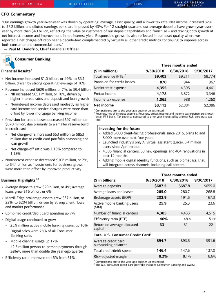 CFO Commentary “Our earnings growth year-over-year was driven by operating leverage, asset quality, and a lower tax rate. Net income increased 32% to $7.2 billion, and diluted earnings per share improved by 43%. For 12 straight quarters, our average deposits have grown year-over- year by more than $40 billion, reflecting the value to customers of our deposit capabilities and franchise – and driving both growth of net interest income and improvement in net interest yield. Responsible growth is also reflected in our asset quality where we reported a net charge-off ratio near a decade-low, complemented by virtually all other credit metrics continuing to improve across both consumer and commercial loans.” — Paul M. Donofrio, Chief Financial Officer Consumer Banking Three months ended Financial Results1 ($ in millions) 9/30/2018 6/30/2018 9/30/2017 Total revenue (FTE)2 $9,403 $9,211 $8,774 • Net income increased $1.0 billion, or 49%, to $3.1 billion, driven by strong operating leverage of 10% Provision for credit losses 870 944 967 • Revenue increased $629 million, or 7%, to $9.4 billion Noninterest expense 4,355 4,395 4,461 – NII increased $651 million, or 10%, driven by Pretax income 4,178 3,872 3,346 higher interest rates and deposit and loan growth Income tax expense 1,065 988 1,260 – Noninterest income decreased modestly as higher Net income $3,113 $2,884 $2,086 card income and service charges were more than 1 Comparisons are to the year-ago quarter unless noted. offset by lower mortgage banking income 2 Revenue, net of interest expense. Revenue, pretax income and income tax expense are shown on an FTE basis. Tax expense compared to prior year impacted by a lower U.S. corporate tax • Provision for credit losses decreased $97 million to rate. $870 million, due primarily to a smaller reserve build in credit card Investing for the future – Net charge-offs increased $53 million to $853 • Added 6,000 client-facing professionals since 2015; plans to add million due to credit card portfolio seasoning and 5,000 more over next four years loan growth • Launched industry’s only AI virtual assistant (Erica); 3.4 million users since April rollout – Net charge-off ratio was 1.19% compared to • 4,385 financial centers: 53 new openings and 404 renovations in 1.18% past 12 months • Noninterest expense decreased $106 million, or 2%, • Adding mobile digital identity functions, such as biometrics, that to $4.4 billion as investments for business growth will integrate across channels, including call centers were more than offset by improved productivity Three months ended Business Highlights1,2 ($ in billions) 9/30/2018 6/30/2018 9/30/2017 • Average deposits grew $29 billion, or 4%; average Average deposits $687.5 $687.8 $659.0 loans grew $16 billion, or 6% Average loans and leases 285.0 280.7 268.8 • Merrill Edge brokerage assets grew $37 billion, or Brokerage assets (EOP) 203.9 191.5 167.3 22%, to $204 billion, driven by strong client flows Active mobile banking users 25.9 25.3 23.6 and market performance (MM) • Combined credit/debit card spending up 7% Number of financial centers 4,385 4,433 4,515 • Digital usage continued to grow Efficiency ratio (FTE) 46% 48% 51% – 25.9 million active mobile banking users, up 10% Return on average allocated 33 31 22 capital – Digital sales were 23% of all Consumer 2 Banking sales Total U.S. Consumer Credit Card – Mobile channel usage up 17% Average credit card $94.7 $93.5 $91.6 outstanding balances – 42.5 million person-to-person payments through Zelle®, more than double the year-ago quarter Total credit/debit spend 146.4 147.5 137.0 • Efficiency ratio improved to 46% from 51% Risk-adjusted margin 8.2% 8.1% 8.6% 1 Comparisons are to the year-ago quarter unless noted. 2 The U.S. consumer credit card portfolio includes Consumer Banking and GWIM. 2