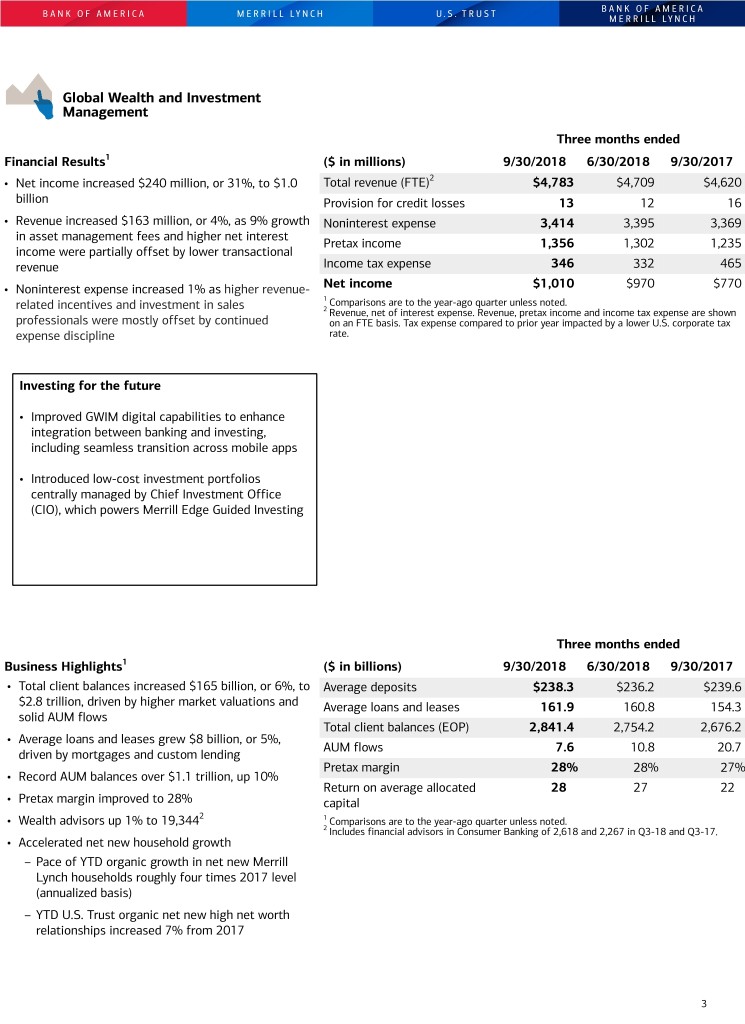 Global Wealth and Investment Management Three months ended Financial Results1 ($ in millions) 9/30/2018 6/30/2018 9/30/2017 • Net income increased $240 million, or 31%, to $1.0 Total revenue (FTE)2 $4,783 $4,709 $4,620 billion Provision for credit losses 13 12 16 • Revenue increased $163 million, or 4%, as 9% growth Noninterest expense 3,414 3,395 3,369 in asset management fees and higher net interest Pretax income 1,356 1,302 1,235 income were partially offset by lower transactional revenue Income tax expense 346 332 465 • Noninterest expense increased 1% as higher revenue- Net income $1,010 $970 $770 1 related incentives and investment in sales Comparisons are to the year-ago quarter unless noted. 2 Revenue, net of interest expense. Revenue, pretax income and income tax expense are shown professionals were mostly offset by continued on an FTE basis. Tax expense compared to prior year impacted by a lower U.S. corporate tax expense discipline rate. Investing for the future • Improved GWIM digital capabilities to enhance integration between banking and investing, including seamless transition across mobile apps • Introduced low-cost investment portfolios centrally managed by Chief Investment Office (CIO), which powers Merrill Edge Guided Investing Three months ended Business Highlights1 ($ in billions) 9/30/2018 6/30/2018 9/30/2017 • Total client balances increased $165 billion, or 6%, to Average deposits $238.3 $236.2 $239.6 $2.8 trillion, driven by higher market valuations and Average loans and leases 161.9 160.8 154.3 solid AUM flows Total client balances (EOP) 2,841.4 2,754.2 2,676.2 • Average loans and leases grew $8 billion, or 5%, AUM flows 7.6 10.8 20.7 driven by mortgages and custom lending Pretax margin 28% 28% 27% • Record AUM balances over $1.1 trillion, up 10% Return on average allocated 28 27 22 • Pretax margin improved to 28% capital 2 • Wealth advisors up 1% to 19,344 1 Comparisons are to the year-ago quarter unless noted. 2 Includes financial advisors in Consumer Banking of 2,618 and 2,267 in Q3-18 and Q3-17. • Accelerated net new household growth – Pace of YTD organic growth in net new Merrill Lynch households roughly four times 2017 level (annualized basis) – YTD U.S. Trust organic net new high net worth relationships increased 7% from 2017 3