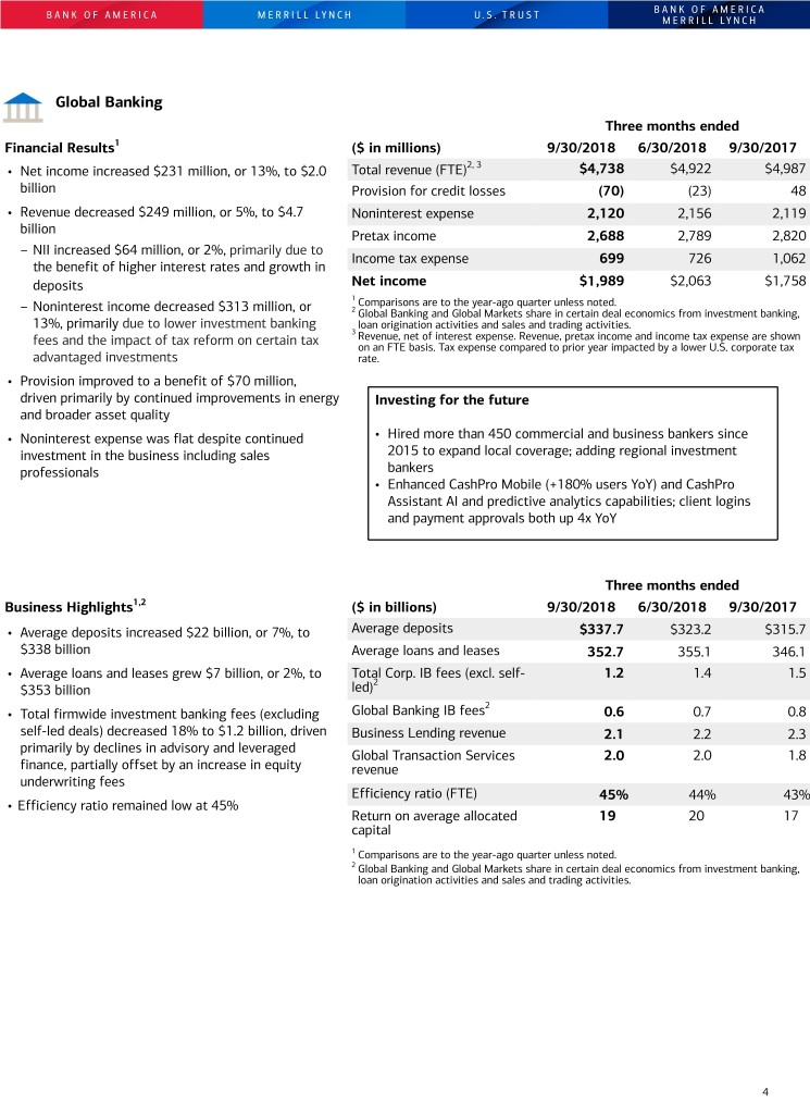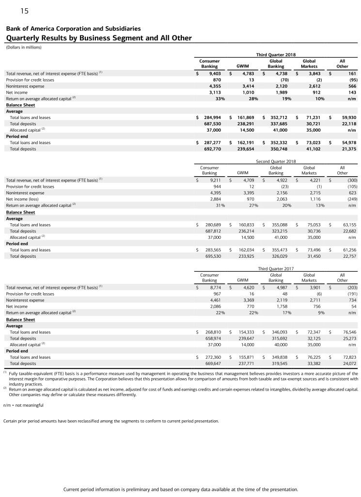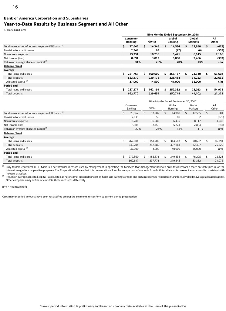 15 Bank of America Corporation and Subsidiaries Quarterly Results by Business Segment and All Other (Dollars in millions) Third Quarter 2018 Consumer Global Global All Banking GWIM Banking Markets Other Total revenue, net of interest expense (FTE basis) (1) $ 9,403 $ 4,783 $ 4,738 $ 3,843 $ 161 Provision for credit losses 870 13 (70) (2) (95) Noninterest expense 4,355 3,414 2,120 2,612 566 Net income 3,113 1,010 1,989 912 143 Return on average allocated capital (2) 33% 28% 19% 10% n/m Balance Sheet Average Total loans and leases $ 284,994 $ 161,869 $ 352,712 $ 71,231 $ 59,930 Total deposits 687,530 238,291 337,685 30,721 22,118 Allocated capital (2) 37,000 14,500 41,000 35,000 n/m Period end Total loans and leases $ 287,277 $ 162,191 $ 352,332 $ 73,023 $ 54,978 Total deposits 692,770 239,654 350,748 41,102 21,375 Second Quarter 2018 Consumer Global Global All Banking GWIM Banking Markets Other Total revenue, net of interest expense (FTE basis) (1) $ 9,211 $ 4,709 $ 4,922 $ 4,221 $ (300) Provision for credit losses 944 12 (23) (1) (105) Noninterest expense 4,395 3,395 2,156 2,715 623 Net income (loss) 2,884 970 2,063 1,116 (249) Return on average allocated capital (2) 31% 27% 20% 13% n/m Balance Sheet Average Total loans and leases $ 280,689 $ 160,833 $ 355,088 $ 75,053 $ 63,155 Total deposits 687,812 236,214 323,215 30,736 22,682 Allocated capital (2) 37,000 14,500 41,000 35,000 n/m Period end Total loans and leases $ 283,565 $ 162,034 $ 355,473 $ 73,496 $ 61,256 Total deposits 695,530 233,925 326,029 31,450 22,757 Third Quarter 2017 Consumer Global Global All Banking GWIM Banking Markets Other Total revenue, net of interest expense (FTE basis) (1) $ 8,774 $ 4,620 $ 4,987 $ 3,901 $ (203) Provision for credit losses 967 16 48 (6) (191) Noninterest expense 4,461 3,369 2,119 2,711 734 Net income 2,086 770 1,758 756 54 Return on average allocated capital (2) 22% 22% 17% 9% n/m Balance Sheet Average Total loans and leases $ 268,810 $ 154,333 $ 346,093 $ 72,347 $ 76,546 Total deposits 658,974 239,647 315,692 32,125 25,273 Allocated capital (2) 37,000 14,000 40,000 35,000 n/m Period end Total loans and leases $ 272,360 $ 155,871 $ 349,838 $ 76,225 $ 72,823 Total deposits 669,647 237,771 319,545 33,382 24,072 (1) Fully taxable-equivalent (FTE) basis is a performance measure used by management in operating the business that management believes provides investors a more accurate picture of the interest margin for comparative purposes. The Corporation believes that this presentation allows for comparison of amounts from both taxable and tax-exempt sources and is consistent with industry practices. (2) Return on average allocated capital is calculated as net income, adjusted for cost of funds and earnings credits and certain expenses related to intangibles, divided by average allocated capital. Other companies may define or calculate these measures differently. n/m = not meaningful Certain prior period amounts have been reclassified among the segments to conform to current period presentation. Current period information is preliminary and based on company data available at the time of the presentation.