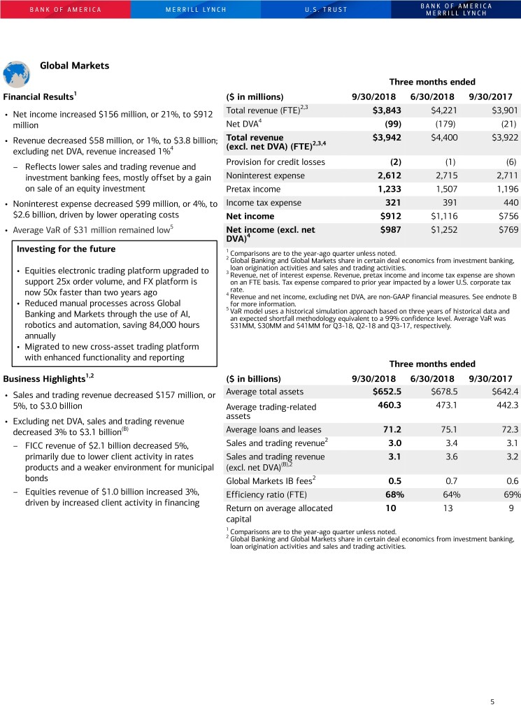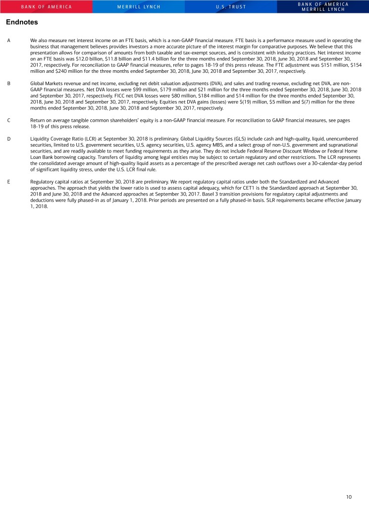 Endnotes A We also measure net interest income on an FTE basis, which is a non-GAAP financial measure. FTE basis is a performance measure used in operating the business that management believes provides investors a more accurate picture of the interest margin for comparative purposes. We believe that this presentation allows for comparison of amounts from both taxable and tax-exempt sources, and is consistent with industry practices. Net interest income on an FTE basis was $12.0 billion, $11.8 billion and $11.4 billion for the three months ended September 30, 2018, June 30, 2018 and September 30, 2017, respectively. For reconciliation to GAAP financial measures, refer to pages 18-19 of this press release. The FTE adjustment was $151 million, $154 million and $240 million for the three months ended September 30, 2018, June 30, 2018 and September 30, 2017, respectively. B Global Markets revenue and net income, excluding net debit valuation adjustments (DVA), and sales and trading revenue, excluding net DVA, are non- GAAP financial measures. Net DVA losses were $99 million, $179 million and $21 million for the three months ended September 30, 2018, June 30, 2018 and September 30, 2017, respectively. FICC net DVA losses were $80 million, $184 million and $14 million for the three months ended September 30, 2018, June 30, 2018 and September 30, 2017, respectively. Equities net DVA gains (losses) were $(19) million, $5 million and $(7) million for the three months ended September 30, 2018, June 30, 2018 and September 30, 2017, respectively. C Return on average tangible common shareholders’ equity is a non-GAAP financial measure. For reconciliation to GAAP financial measures, see pages 18-19 of this press release. D Liquidity Coverage Ratio (LCR) at September 30, 2018 is preliminary. Global Liquidity Sources (GLS) include cash and high-quality, liquid, unencumbered securities, limited to U.S. government securities, U.S. agency securities, U.S. agency MBS, and a select group of non-U.S. government and supranational securities, and are readily available to meet funding requirements as they arise. They do not include Federal Reserve Discount Window or Federal Home Loan Bank borrowing capacity. Transfers of liquidity among legal entities may be subject to certain regulatory and other restrictions. The LCR represents the consolidated average amount of high-quality liquid assets as a percentage of the prescribed average net cash outflows over a 30-calendar-day period of significant liquidity stress, under the U.S. LCR final rule. E Regulatory capital ratios at September 30, 2018 are preliminary. We report regulatory capital ratios under both the Standardized and Advanced approaches. The approach that yields the lower ratio is used to assess capital adequacy, which for CET1 is the Standardized approach at September 30, 2018 and June 30, 2018 and the Advanced approaches at September 30, 2017. Basel 3 transition provisions for regulatory capital adjustments and deductions were fully phased-in as of January 1, 2018. Prior periods are presented on a fully phased-in basis. SLR requirements became effective January 1, 2018. 10