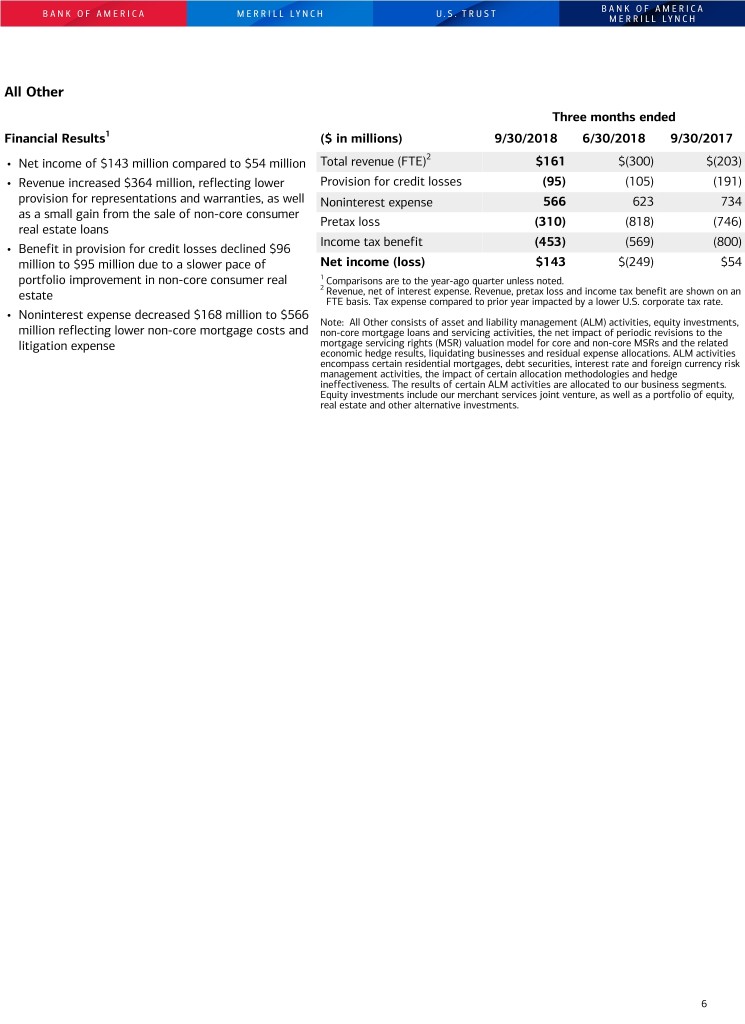 All Other Three months ended Financial Results1 ($ in millions) 9/30/2018 6/30/2018 9/30/2017 2 • Net income of $143 million compared to $54 million Total revenue (FTE) $161 $(300) $(203) • Revenue increased $364 million, reflecting lower Provision for credit losses (95) (105) (191) provision for representations and warranties, as well Noninterest expense 566 623 734 as a small gain from the sale of non-core consumer Pretax loss (310) (818) (746) real estate loans Income tax benefit (453) (569) (800) • Benefit in provision for credit losses declined $96 million to $95 million due to a slower pace of Net income (loss) $143 $(249) $54 portfolio improvement in non-core consumer real 1 Comparisons are to the year-ago quarter unless noted. 2 Revenue, net of interest expense. Revenue, pretax loss and income tax benefit are shown on an estate FTE basis. Tax expense compared to prior year impacted by a lower U.S. corporate tax rate. • Noninterest expense decreased $168 million to $566 Note: All Other consists of asset and liability management (ALM) activities, equity investments, million reflecting lower non-core mortgage costs and non-core mortgage loans and servicing activities, the net impact of periodic revisions to the litigation expense mortgage servicing rights (MSR) valuation model for core and non-core MSRs and the related economic hedge results, liquidating businesses and residual expense allocations. ALM activities encompass certain residential mortgages, debt securities, interest rate and foreign currency risk management activities, the impact of certain allocation methodologies and hedge ineffectiveness. The results of certain ALM activities are allocated to our business segments. Equity investments include our merchant services joint venture, as well as a portfolio of equity, real estate and other alternative investments. 6