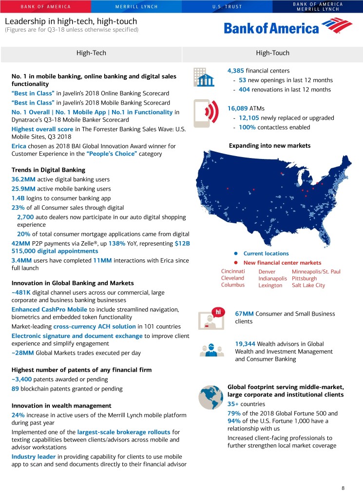 Leadership in high-tech, high-touch (Figures are for Q3-18 unless otherwise specified) High-Tech High-Touch 4,385 financial centers No. 1 in mobile banking, online banking and digital sales ‑ 53 new openings in last 12 months functionality ‑ 404 renovations in last 12 months “Best in Class” in Javelin’s 2018 Online Banking Scorecard “Best in Class” in Javelin’s 2018 Mobile Banking Scorecard 16,089 ATMs No. 1 Overall | No. 1 Mobile App | No.1 in Functionality in Dynatrace’s Q3-18 Mobile Banker Scorecard ‑ 12,105 newly replaced or upgraded Highest overall score in The Forrester Banking Sales Wave: U.S. ‑ 100% contactless enabled Mobile Sites, Q3 2018 Erica chosen as 2018 BAI Global Innovation Award winner for Expanding into new markets Customer Experience in the “People’s Choice” category Trends in Digital Banking 36.2MM active digital banking users 25.9MM active mobile banking users 1.4B logins to consumer banking app 23% of all Consumer sales through digital 2,700 auto dealers now participate in our auto digital shopping experience 20% of total consumer mortgage applications came from digital 42MM P2P payments via Zelle®, up 138% YoY, representing $12B 515,000 digital appointments l Current locations 3.4MM users have completed 11MM interactions with Erica since l New financial center markets full launch Cincinnati Denver Minneapolis/St. Paul Cleveland Indianapolis Pittsburgh Innovation in Global Banking and Markets Columbus Lexington Salt Lake City ~481K digital channel users across our commercial, large corporate and business banking businesses Enhanced CashPro Mobile to include streamlined navigation, 67MM Consumer and Small Business biometrics and embedded token functionality clients Market-leading cross-currency ACH solution in 101 countries Electronic signature and document exchange to improve client experience and simplify engagement 19,344 Wealth advisors in Global ~28MM Global Markets trades executed per day Wealth and Investment Management and Consumer Banking Highest number of patents of any financial firm ~3,400 patents awarded or pending 89 blockchain patents granted or pending Global footprint serving middle-market, large corporate and institutional clients Innovation in wealth management 35+ countries 24% increase in active users of the Merrill Lynch mobile platform 79% of the 2018 Global Fortune 500 and during past year 94% of the U.S. Fortune 1,000 have a relationship with us Implemented one of the largest-scale brokerage rollouts for texting capabilities between clients/advisors across mobile and Increased client-facing professionals to advisor workstations further strengthen local market coverage Industry leader in providing capability for clients to use mobile app to scan and send documents directly to their financial advisor 8