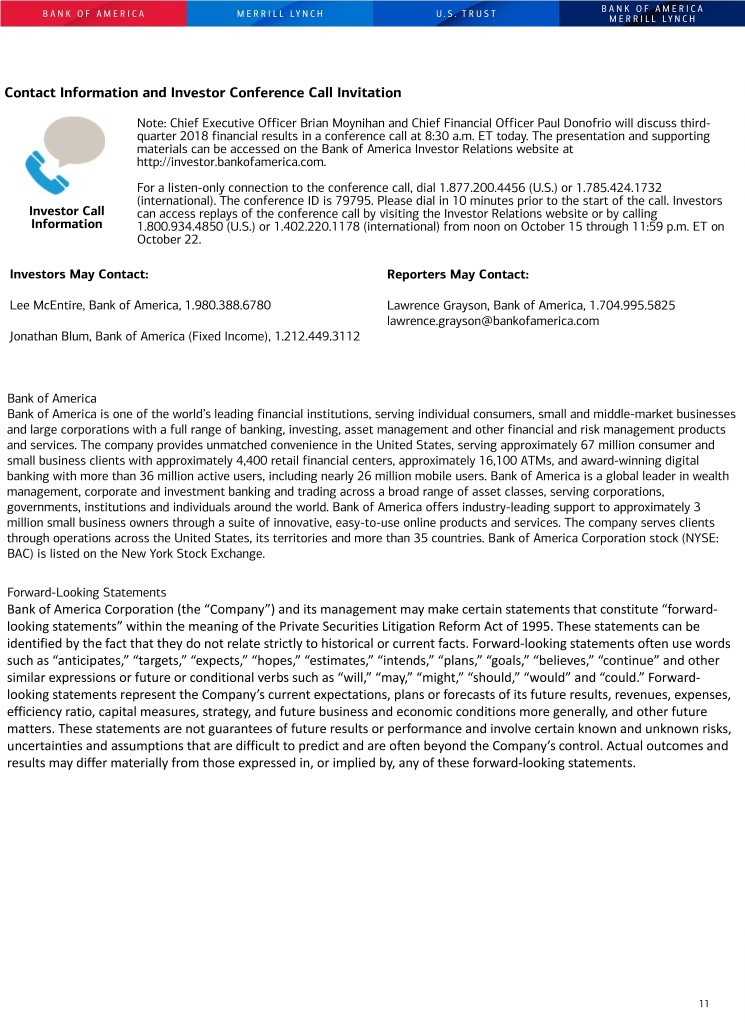 Contact Information and Investor Conference Call Invitation Note: Chief Executive Officer Brian Moynihan and Chief Financial Officer Paul Donofrio will discuss third- quarter 2018 financial results in a conference call at 8:30 a.m. ET today. The presentation and supporting materials can be accessed on the Bank of America Investor Relations website at http://investor.bankofamerica.com. For a listen-only connection to the conference call, dial 1.877.200.4456 (U.S.) or 1.785.424.1732 (international). The conference ID is 79795. Please dial in 10 minutes prior to the start of the call. Investors Investor Call can access replays of the conference call by visiting the Investor Relations website or by calling Information 1.800.934.4850 (U.S.) or 1.402.220.1178 (international) from noon on October 15 through 11:59 p.m. ET on October 22. Investors May Contact: Reporters May Contact: Lee McEntire, Bank of America, 1.980.388.6780 Lawrence Grayson, Bank of America, 1.704.995.5825 lawrence.grayson@bankofamerica.com Jonathan Blum, Bank of America (Fixed Income), 1.212.449.3112 Bank of America Bank of America is one of the world’s leading financial institutions, serving individual consumers, small and middle-market businesses and large corporations with a full range of banking, investing, asset management and other financial and risk management products and services. The company provides unmatched convenience in the United States, serving approximately 67 million consumer and small business clients with approximately 4,400 retail financial centers, approximately 16,100 ATMs, and award-winning digital banking with more than 36 million active users, including nearly 26 million mobile users. Bank of America is a global leader in wealth management, corporate and investment banking and trading across a broad range of asset classes, serving corporations, governments, institutions and individuals around the world. Bank of America offers industry-leading support to approximately 3 million small business owners through a suite of innovative, easy-to-use online products and services. The company serves clients through operations across the United States, its territories and more than 35 countries. Bank of America Corporation stock (NYSE: BAC) is listed on the New York Stock Exchange. Forward-Looking Statements Bank of America Corporation (the “Company”) and its management may make certain statements that constitute “forward- looking statements” within the meaning of the Private Securities Litigation Reform Act of 1995. These statements can be identified by the fact that they do not relate strictly to historical or current facts. Forward-looking statements often use words such as “anticipates,” “targets,” “expects,” “hopes,” “estimates,” “intends,” “plans,” “goals,” “believes,” “continue” and other similar expressions or future or conditional verbs such as “will,” “may,” “might,” “should,” “would” and “could.” Forward- looking statements represent the Company’s current expectations, plans or forecasts of its future results, revenues, expenses, efficiency ratio, capital measures, strategy, and future business and economic conditions more generally, and other future matters. These statements are not guarantees of future results or performance and involve certain known and unknown risks, uncertainties and assumptions that are difficult to predict and are often beyond the Company’s control. Actual outcomes and results may differ materially from those expressed in, or implied by, any of these forward-looking statements. 11