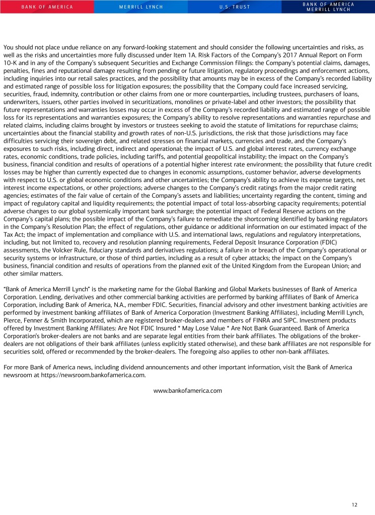 You should not place undue reliance on any forward-looking statement and should consider the following uncertainties and risks, as well as the risks and uncertainties more fully discussed under Item 1A. Risk Factors of the Company’s 2017 Annual Report on Form 10-K and in any of the Company’s subsequent Securities and Exchange Commission filings: the Company’s potential claims, damages, penalties, fines and reputational damage resulting from pending or future litigation, regulatory proceedings and enforcement actions, including inquiries into our retail sales practices, and the possibility that amounts may be in excess of the Company’s recorded liability and estimated range of possible loss for litigation exposures; the possibility that the Company could face increased servicing, securities, fraud, indemnity, contribution or other claims from one or more counterparties, including trustees, purchasers of loans, underwriters, issuers, other parties involved in securitizations, monolines or private-label and other investors; the possibility that future representations and warranties losses may occur in excess of the Company’s recorded liability and estimated range of possible loss for its representations and warranties exposures; the Company’s ability to resolve representations and warranties repurchase and related claims, including claims brought by investors or trustees seeking to avoid the statute of limitations for repurchase claims; uncertainties about the financial stability and growth rates of non-U.S. jurisdictions, the risk that those jurisdictions may face difficulties servicing their sovereign debt, and related stresses on financial markets, currencies and trade, and the Company’s exposures to such risks, including direct, indirect and operational; the impact of U.S. and global interest rates, currency exchange rates, economic conditions, trade policies, including tariffs, and potential geopolitical instability; the impact on the Company’s business, financial condition and results of operations of a potential higher interest rate environment; the possibility that future credit losses may be higher than currently expected due to changes in economic assumptions, customer behavior, adverse developments with respect to U.S. or global economic conditions and other uncertainties; the Company’s ability to achieve its expense targets, net interest income expectations, or other projections; adverse changes to the Company’s credit ratings from the major credit rating agencies; estimates of the fair value of certain of the Company’s assets and liabilities; uncertainty regarding the content, timing and impact of regulatory capital and liquidity requirements; the potential impact of total loss-absorbing capacity requirements; potential adverse changes to our global systemically important bank surcharge; the potential impact of Federal Reserve actions on the Company’s capital plans; the possible impact of the Company’s failure to remediate the shortcoming identified by banking regulators in the Company’s Resolution Plan; the effect of regulations, other guidance or additional information on our estimated impact of the Tax Act; the impact of implementation and compliance with U.S. and international laws, regulations and regulatory interpretations, including, but not limited to, recovery and resolution planning requirements, Federal Deposit Insurance Corporation (FDIC) assessments, the Volcker Rule, fiduciary standards and derivatives regulations; a failure in or breach of the Company’s operational or security systems or infrastructure, or those of third parties, including as a result of cyber attacks; the impact on the Company’s business, financial condition and results of operations from the planned exit of the United Kingdom from the European Union; and other similar matters. “Bank of America Merrill Lynch” is the marketing name for the Global Banking and Global Markets businesses of Bank of America Corporation. Lending, derivatives and other commercial banking activities are performed by banking affiliates of Bank of America Corporation, including Bank of America, N.A., member FDIC. Securities, financial advisory and other investment banking activities are performed by investment banking affiliates of Bank of America Corporation (Investment Banking Affiliates), including Merrill Lynch, Pierce, Fenner & Smith Incorporated, which are registered broker-dealers and members of FINRA and SIPC. Investment products offered by Investment Banking Affiliates: Are Not FDIC Insured * May Lose Value * Are Not Bank Guaranteed. Bank of America Corporation’s broker-dealers are not banks and are separate legal entities from their bank affiliates. The obligations of the broker- dealers are not obligations of their bank affiliates (unless explicitly stated otherwise), and these bank affiliates are not responsible for securities sold, offered or recommended by the broker-dealers. The foregoing also applies to other non-bank affiliates. For more Bank of America news, including dividend announcements and other important information, visit the Bank of America newsroom at https://newsroom.bankofamerica.com. www.bankofamerica.com 12