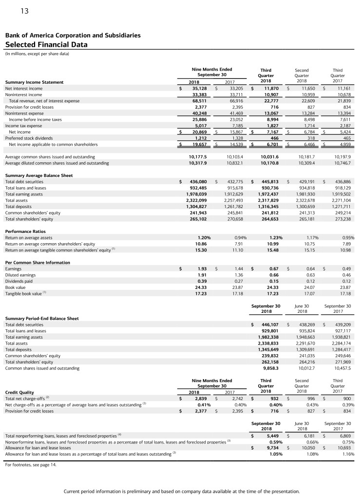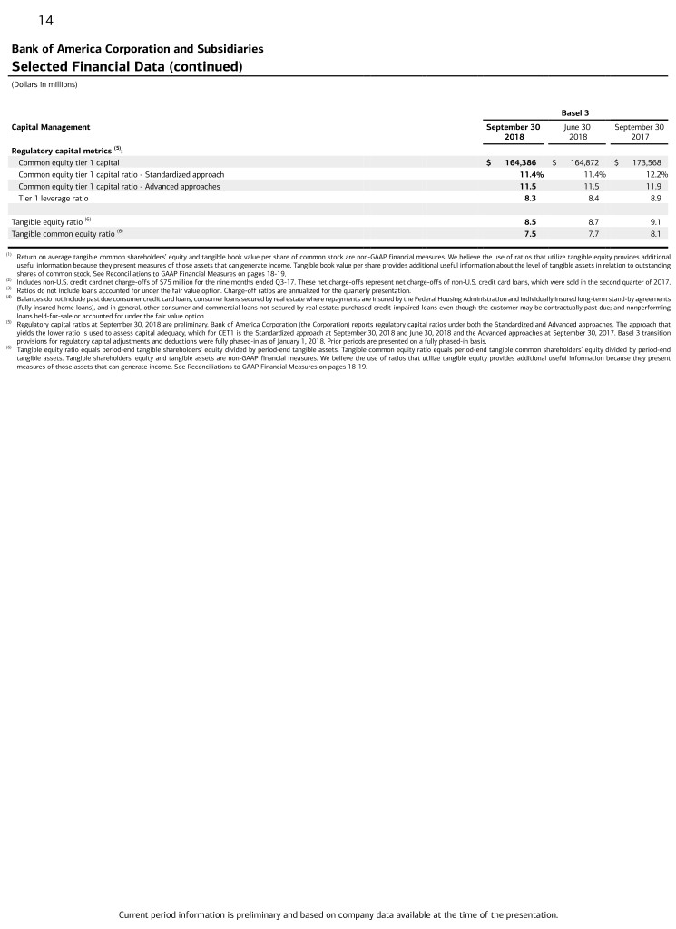13 Bank of America Corporation and Subsidiaries Selected Financial Data (In millions, except per share data) Nine Months Ended Third Second Third September 30 Quarter Quarter Quarter Summary Income Statement 2018 2017 2018 2018 2017 Net interest income $ 35,128 $ 33,205 $ 11,870 $ 11,650 $ 11,161 Noninterest income 33,383 33,711 10,907 10,959 10,678 Total revenue, net of interest expense 68,511 66,916 22,777 22,609 21,839 Provision for credit losses 2,377 2,395 716 827 834 Noninterest expense 40,248 41,469 13,067 13,284 13,394 Income before income taxes 25,886 23,052 8,994 8,498 7,611 Income tax expense 5,017 7,185 1,827 1,714 2,187 Net income $ 20,869 $ 15,867 $ 7,167 $ 6,784 $ 5,424 Preferred stock dividends 1,212 1,328 466 318 465 Net income applicable to common shareholders $ 19,657 $ 14,539 $ 6,701 $ 6,466 $ 4,959 Average common shares issued and outstanding 10,177.5 10,103.4 10,031.6 10,181.7 10,197.9 Average diluted common shares issued and outstanding 10,317.9 10,832.1 10,170.8 10,309.4 10,746.7 Summary Average Balance Sheet Total debt securities $ 436,080 $ 432,775 $ 445,813 $ 429,191 $ 436,886 Total loans and leases 932,485 915,678 930,736 934,818 918,129 Total earning assets 1,978,039 1,912,629 1,972,437 1,981,930 1,919,502 Total assets 2,322,099 2,257,493 2,317,829 2,322,678 2,271,104 Total deposits 1,304,827 1,261,782 1,316,345 1,300,659 1,271,711 Common shareholders’ equity 241,943 245,841 241,812 241,313 249,214 Total shareholders’ equity 265,102 270,658 264,653 265,181 273,238 Performance Ratios Return on average assets 1.20% 0.94% 1.23% 1.17% 0.95% Return on average common shareholders’ equity 10.86 7.91 10.99 10.75 7.89 Return on average tangible common shareholders’ equity (1) 15.30 11.10 15.48 15.15 10.98 Per Common Share Information Earnings $ 1.93 $ 1.44 $ 0.67 $ 0.64 $ 0.49 Diluted earnings 1.91 1.36 0.66 0.63 0.46 Dividends paid 0.39 0.27 0.15 0.12 0.12 Book value 24.33 23.87 24.33 24.07 23.87 Tangible book value (1) 17.23 17.18 17.23 17.07 17.18 September 30 June 30 September 30 2018 2018 2017 Summary Period-End Balance Sheet Total debt securities $ 446,107 $ 438,269 $ 439,209 Total loans and leases 929,801 935,824 927,117 Total earning assets 1,982,338 1,948,663 1,938,821 Total assets 2,338,833 2,291,670 2,284,174 Total deposits 1,345,649 1,309,691 1,284,417 Common shareholders’ equity 239,832 241,035 249,646 Total shareholders’ equity 262,158 264,216 271,969 Common shares issued and outstanding 9,858.3 10,012.7 10,457.5 Nine Months Ended Third Second Third September 30 Quarter Quarter Quarter Credit Quality 2018 2017 2018 2018 2017 Total net charge-offs (2) $ 2,839 $ 2,742 $ 932 $ 996 $ 900 Net charge-offs as a percentage of average loans and leases outstanding (3) 0.41% 0.40% 0.40% 0.43% 0.39% Provision for credit losses $ 2,377 $ 2,395 $ 716 $ 827 $ 834 September 30 June 30 September 30 2018 2018 2017 Total nonperforming loans, leases and foreclosed properties (4) $ 5,449 $ 6,181 $ 6,869 Nonperforming loans, leases and foreclosed properties as a percentage of total loans, leases and foreclosed properties (3) 0.59% 0.66% 0.75% Allowance for loan and lease losses $ 9,734 $ 10,050 $ 10,693 Allowance for loan and lease losses as a percentage of total loans and leases outstanding (3) 1.05% 1.08% 1.16% For footnotes, see page 14. Current period information is preliminary and based on company data available at the time of the presentation.