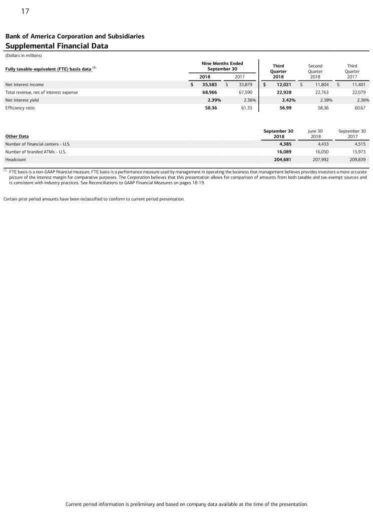 17 Bank of America Corporation and Subsidiaries Supplemental Financial Data (Dollars in millions) Nine Months Ended Third Second Third Fully taxable-equivalent (FTE) basis data (1) September 30 Quarter Quarter Quarter 2018 2017 2018 2018 2017 Net interest income $ 35,583 $ 33,879 $ 12,021 $ 11,804 $ 11,401 Total revenue, net of interest expense 68,966 67,590 22,928 22,763 22,079 Net interest yield 2.39% 2.36% 2.42% 2.38% 2.36% Efficiency ratio 58.36 61.35 56.99 58.36 60.67 September 30 June 30 September 30 Other Data 2018 2018 2017 Number of financial centers - U.S. 4,385 4,433 4,515 Number of branded ATMs - U.S. 16,089 16,050 15,973 Headcount 204,681 207,992 209,839 (1) FTE basis is a non-GAAP financial measure. FTE basis is a performance measure used by management in operating the business that management believes provides investors a more accurate picture of the interest margin for comparative purposes. The Corporation believes that this presentation allows for comparison of amounts from both taxable and tax-exempt sources and is consistent with industry practices. See Reconciliations to GAAP Financial Measures on pages 18-19. Certain prior period amounts have been reclassified to conform to current period presentation. Current period information is preliminary and based on company data available at the time of the presentation.