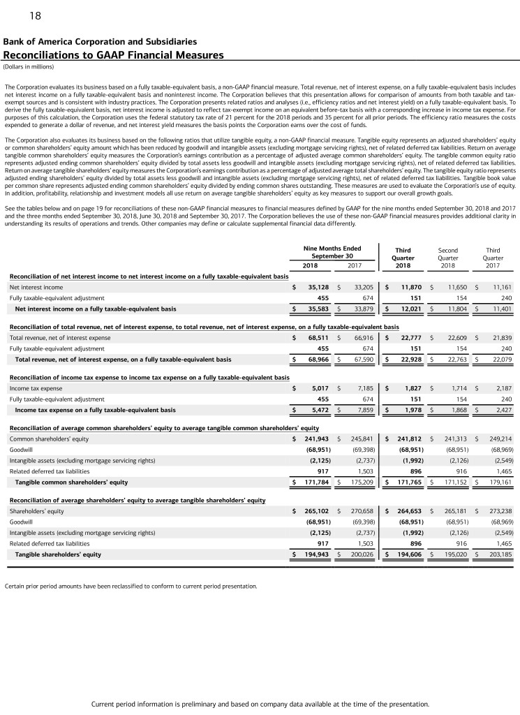 18 Bank of America Corporation and Subsidiaries Reconciliations to GAAP Financial Measures (Dollars in millions) The Corporation evaluates its business based on a fully taxable-equivalent basis, a non-GAAP financial measure. Total revenue, net of interest expense, on a fully taxable-equivalent basis includes net interest income on a fully taxable-equivalent basis and noninterest income. The Corporation believes that this presentation allows for comparison of amounts from both taxable and tax- exempt sources and is consistent with industry practices. The Corporation presents related ratios and analyses (i.e., efficiency ratios and net interest yield) on a fully taxable-equivalent basis. To derive the fully taxable-equivalent basis, net interest income is adjusted to reflect tax-exempt income on an equivalent before-tax basis with a corresponding increase in income tax expense. For purposes of this calculation, the Corporation uses the federal statutory tax rate of 21 percent for the 2018 periods and 35 percent for all prior periods. The efficiency ratio measures the costs expended to generate a dollar of revenue, and net interest yield measures the basis points the Corporation earns over the cost of funds. The Corporation also evaluates its business based on the following ratios that utilize tangible equity, a non-GAAP financial measure. Tangible equity represents an adjusted shareholders’ equity or common shareholders’ equity amount which has been reduced by goodwill and intangible assets (excluding mortgage servicing rights), net of related deferred tax liabilities. Return on average tangible common shareholders’ equity measures the Corporation’s earnings contribution as a percentage of adjusted average common shareholders’ equity. The tangible common equity ratio represents adjusted ending common shareholders’ equity divided by total assets less goodwill and intangible assets (excluding mortgage servicing rights), net of related deferred tax liabilities. Return on average tangible shareholders’ equity measures the Corporation’s earnings contribution as a percentage of adjusted average total shareholders’ equity. The tangible equity ratio represents adjusted ending shareholders’ equity divided by total assets less goodwill and intangible assets (excluding mortgage servicing rights), net of related deferred tax liabilities. Tangible book value per common share represents adjusted ending common shareholders’ equity divided by ending common shares outstanding. These measures are used to evaluate the Corporation’s use of equity. In addition, profitability, relationship and investment models all use return on average tangible shareholders’ equity as key measures to support our overall growth goals. See the tables below and on page 19 for reconciliations of these non-GAAP financial measures to financial measures defined by GAAP for the nine months ended September 30, 2018 and 2017 and the three months ended September 30, 2018, June 30, 2018 and September 30, 2017. The Corporation believes the use of these non-GAAP financial measures provides additional clarity in understanding its results of operations and trends. Other companies may define or calculate supplemental financial data differently. Nine Months Ended Third Second Third September 30 Quarter Quarter Quarter 2018 2017 2018 2018 2017 Reconciliation of net interest income to net interest income on a fully taxable-equivalent basis Net interest income $ 35,128 $ 33,205 $ 11,870 $ 11,650 $ 11,161 Fully taxable-equivalent adjustment 455 674 151 154 240 Net interest income on a fully taxable-equivalent basis $ 35,583 $ 33,879 $ 12,021 $ 11,804 $ 11,401 Reconciliation of total revenue, net of interest expense, to total revenue, net of interest expense, on a fully taxable-equivalent basis Total revenue, net of interest expense $ 68,511 $ 66,916 $ 22,777 $ 22,609 $ 21,839 Fully taxable-equivalent adjustment 455 674 151 154 240 Total revenue, net of interest expense, on a fully taxable-equivalent basis $ 68,966 $ 67,590 $ 22,928 $ 22,763 $ 22,079 Reconciliation of income tax expense to income tax expense on a fully taxable-equivalent basis Income tax expense $ 5,017 $ 7,185 $ 1,827 $ 1,714 $ 2,187 Fully taxable-equivalent adjustment 455 674 151 154 240 Income tax expense on a fully taxable-equivalent basis $ 5,472 $ 7,859 $ 1,978 $ 1,868 $ 2,427 Reconciliation of average common shareholders’ equity to average tangible common shareholders’ equity Common shareholders’ equity $ 241,943 $ 245,841 $ 241,812 $ 241,313 $ 249,214 Goodwill (68,951) (69,398) (68,951) (68,951) (68,969) Intangible assets (excluding mortgage servicing rights) (2,125) (2,737) (1,992) (2,126) (2,549) Related deferred tax liabilities 917 1,503 896 916 1,465 Tangible common shareholders’ equity $ 171,784 $ 175,209 $ 171,765 $ 171,152 $ 179,161 Reconciliation of average shareholders’ equity to average tangible shareholders’ equity Shareholders’ equity $ 265,102 $ 270,658 $ 264,653 $ 265,181 $ 273,238 Goodwill (68,951) (69,398) (68,951) (68,951) (68,969) Intangible assets (excluding mortgage servicing rights) (2,125) (2,737) (1,992) (2,126) (2,549) Related deferred tax liabilities 917 1,503 896 916 1,465 Tangible shareholders’ equity $ 194,943 $ 200,026 $ 194,606 $ 195,020 $ 203,185 Certain prior period amounts have been reclassified to conform to current period presentation. Current period information is preliminary and based on company data available at the time of the presentation.