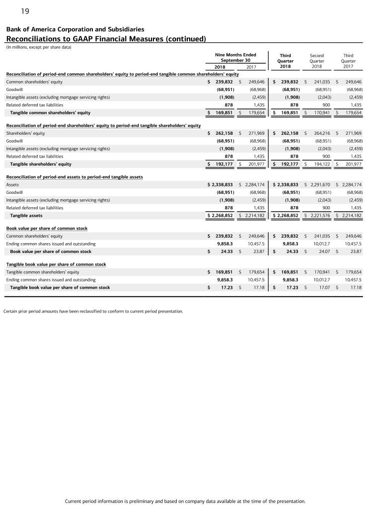 19 Bank of America Corporation and Subsidiaries Reconciliations to GAAP Financial Measures (continued) (In millions, except per share data) Nine Months Ended Third Second Third September 30 Quarter Quarter Quarter 2018 2017 2018 2018 2017 Reconciliation of period-end common shareholders’ equity to period-end tangible common shareholders’ equity Common shareholders’ equity $ 239,832 $ 249,646 $ 239,832 $ 241,035 $ 249,646 Goodwill (68,951) (68,968) (68,951) (68,951) (68,968) Intangible assets (excluding mortgage servicing rights) (1,908) (2,459) (1,908) (2,043) (2,459) Related deferred tax liabilities 878 1,435 878 900 1,435 Tangible common shareholders’ equity $ 169,851 $ 179,654 $ 169,851 $ 170,941 $ 179,654 Reconciliation of period-end shareholders’ equity to period-end tangible shareholders’ equity Shareholders’ equity $ 262,158 $ 271,969 $ 262,158 $ 264,216 $ 271,969 Goodwill (68,951) (68,968) (68,951) (68,951) (68,968) Intangible assets (excluding mortgage servicing rights) (1,908) (2,459) (1,908) (2,043) (2,459) Related deferred tax liabilities 878 1,435 878 900 1,435 Tangible shareholders’ equity $ 192,177 $ 201,977 $ 192,177 $ 194,122 $ 201,977 Reconciliation of period-end assets to period-end tangible assets Assets $ 2,338,833 $ 2,284,174 $ 2,338,833 $ 2,291,670 $ 2,284,174 Goodwill (68,951) (68,968) (68,951) (68,951) (68,968) Intangible assets (excluding mortgage servicing rights) (1,908) (2,459) (1,908) (2,043) (2,459) Related deferred tax liabilities 878 1,435 878 900 1,435 Tangible assets $ 2,268,852 $ 2,214,182 $ 2,268,852 $ 2,221,576 $ 2,214,182 Book value per share of common stock Common shareholders’ equity $ 239,832 $ 249,646 $ 239,832 $ 241,035 $ 249,646 Ending common shares issued and outstanding 9,858.3 10,457.5 9,858.3 10,012.7 10,457.5 Book value per share of common stock $ 24.33 $ 23.87 $ 24.33 $ 24.07 $ 23.87 Tangible book value per share of common stock Tangible common shareholders’ equity $ 169,851 $ 179,654 $ 169,851 $ 170,941 $ 179,654 Ending common shares issued and outstanding 9,858.3 10,457.5 9,858.3 10,012.7 10,457.5 Tangible book value per share of common stock $ 17.23 $ 17.18 $ 17.23 $ 17.07 $ 17.18 Certain prior period amounts have been reclassified to conform to current period presentation. Current period information is preliminary and based on company data available at the time of the presentation.