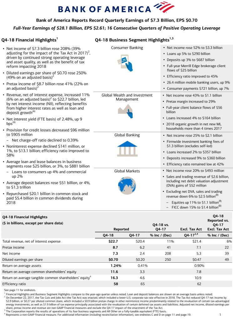 Bank of America Reports Record Quarterly Earnings of $7.3 Billion, EPS $0.70 Full-Year Earnings of $28.1 Billion, EPS $2.61; 16 Consecutive Quarters of Positive Operating Leverage Q4-18 Financial Highlights1 Q4-18 Business Segment Highlights1,3 • Net income of $7.3 billion rose 208% (39% Consumer Banking • Net income rose 52% to $3.3 billion 2 adjusting for the impact of the Tax Act in 2017) , • Loans up 5% to $290 billion driven by continued strong operating leverage • Deposits up 3% to $687 billion and asset quality, as well as the benefit of tax reform impacting 2018 • Full-year Merrill Edge brokerage client flows of $25 billion • Diluted earnings per share of $0.70 rose 250% (49% on an adjusted basis)2 • Efficiency ratio improved to 45% • Pretax income of $8.7 billion rose 41% (22% on • 26.4 million mobile banking users, up 9% an adjusted basis)2 • Consumer payments $721 billion, up 7% • Revenue, net of interest expense, increased 11% Global Wealth and Investment • Net income rose 43% to $1.1 billion (6% on an adjusted basis)2 to $22.7 billion, led Management • Pretax margin increased to 29% by net interest income (NII), reflecting benefits from higher interest rates as well as loan and • Full-year client balance flows of $56 deposit growth(A) billion • Net interest yield (FTE basis) of 2.48%, up 9 • Loans increased 4% to $164 billion (A) bps • 2018 organic growth in net new ML • Provision for credit losses decreased $96 million households more than 4 times 2017 to $905 million Global Banking • Net income rose 25% to $2.1 billion – Net charge-off ratio declined to 0.39% • Firmwide investment banking fees of • Noninterest expense declined $141 million, or $1.3• billion (excludes self-led) 1%, to $13.1 billion; efficiency ratio improved to • Loans increased 2% to $357 billion 58% • Deposits increased 9% to $360 billion • Average loan and lease balances in business • segments rose $25 billion, or 3%, to $881 billion Efficiency ratio remained low at 42% – Loans to consumers up 4% and commercial Global Markets • Net income rose 20% to $493 million up 2% • Sales and trading revenue of $2.6 billion, • Average deposit balances rose $51 billion, or 4%, including net debit valuation adjustment to $1.3 trillion (DVA) gains of $52 million • Excluding net DVA, sales and trading • Repurchased $20.1 billion in common stock and (B) paid $5.4 billion in common dividends during revenue down 6% to $2.5 billion 2018 – Equities up 11% to $1.1 billion(B) – FICC down 15% to $1.4 billion(B) Q4-18 Financial Highlights Q4-18 Reported vs. ($ in billions, except per share data) Q4-18 vs. Q4-17 Reported Q4-17 Excl. Tax Act Excl. Tax Act Q4-18 Q4-17 % Inc / (Dec) Q4-172,4 % Inc / (Dec) Total revenue, net of interest expense $22.7 $20.4 11% $21.4 6% Pretax income 8.7 6.2 41 7.1 22 Net income 7.3 2.4 208 5.3 39 Diluted earnings per share $0.70 $0.20 250 $0.47 49 Return on average assets 1.24% 0.41% 0.90% Return on average common shareholders’ equity 11.6 3.3 7.8 Return on average tangible common shareholders’ equity4 16.3 4.6 10.9 Efficiency ratio 58 65 62 See page 11 for endnotes. 1 Financial Highlights and Business Segment Highlights compare to the year-ago quarter unless noted. Loan and deposit balances are shown on an average basis unless noted. 2 On December 22, 2017, the Tax Cuts and Jobs Act (the Tax Act) was enacted, which included a lower U.S. corporate tax rate effective in 2018. The Tax Act reduced Q4-17 net income by $2.9 billion, or $0.27 per diluted common share, which included a $0.9 billion pretax charge in other noninterest income predominantly related to the revaluation of certain tax-advantaged energy investments, as well as $1.9 billion of tax expense principally associated with the revaluation of certain deferred tax assets and liabilities. Adjusted net income, diluted earnings per share, pretax income and revenue are non-GAAP financial measures and exclude the Q4-17 impact of the enactment of the Tax Act. 3 The Corporation reports the results of operations of its four business segments and All Other on a fully-taxable equivalent (FTE) basis. 4 Represents a non-GAAP financial measure. For additional information (including reconciliation information), see endnotes C and D on page 11 and page 19. 1