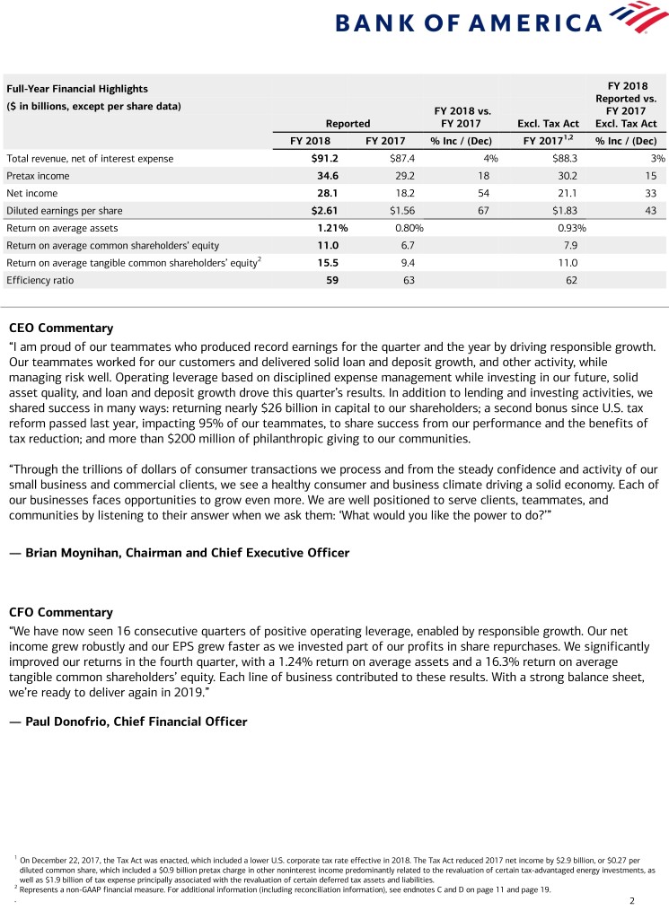 Full-Year Financial Highlights FY 2018 Reported vs. ($ in billions, except per share data) FY 2018 vs. FY 2017 Reported FY 2017 Excl. Tax Act Excl. Tax Act FY 2018 FY 2017 % Inc / (Dec) FY 20171,2 % Inc / (Dec) Total revenue, net of interest expense $91.2 $87.4 4% $88.3 3% Pretax income 34.6 29.2 18 30.2 15 Net income 28.1 18.2 54 21.1 33 Diluted earnings per share $2.61 $1.56 67 $1.83 43 Return on average assets 1.21% 0.80% 0.93% Return on average common shareholders’ equity 11.0 6.7 7.9 Return on average tangible common shareholders’ equity2 15.5 9.4 11.0 Efficiency ratio 59 63 62 CEO Commentary “I am proud of our teammates who produced record earnings for the quarter and the year by driving responsible growth. Our teammates worked for our customers and delivered solid loan and deposit growth, and other activity, while managing risk well. Operating leverage based on disciplined expense management while investing in our future, solid asset quality, and loan and deposit growth drove this quarter’s results. In addition to lending and investing activities, we shared success in many ways: returning nearly $26 billion in capital to our shareholders; a second bonus since U.S. tax reform passed last year, impacting 95% of our teammates, to share success from our performance and the benefits of tax reduction; and more than $200 million of philanthropic giving to our communities. “Through the trillions of dollars of consumer transactions we process and from the steady confidence and activity of our small business and commercial clients, we see a healthy consumer and business climate driving a solid economy. Each of our businesses faces opportunities to grow even more. We are well positioned to serve clients, teammates, and communities by listening to their answer when we ask them: ‘What would you like the power to do?’” — Brian Moynihan, Chairman and Chief Executive Officer CFO Commentary “We have now seen 16 consecutive quarters of positive operating leverage, enabled by responsible growth. Our net income grew robustly and our EPS grew faster as we invested part of our profits in share repurchases. We significantly improved our returns in the fourth quarter, with a 1.24% return on average assets and a 16.3% return on average tangible common shareholders’ equity. Each line of business contributed to these results. With a strong balance sheet, we’re ready to deliver again in 2019.” — Paul Donofrio, Chief Financial Officer 1 On December 22, 2017, the Tax Act was enacted, which included a lower U.S. corporate tax rate effective in 2018. The Tax Act reduced 2017 net income by $2.9 billion, or $0.27 per diluted common share, which included a $0.9 billion pretax charge in other noninterest income predominantly related to the revaluation of certain tax-advantaged energy investments, as well as $1.9 billion of tax expense principally associated with the revaluation of certain deferred tax assets and liabilities. 2 Represents a non-GAAP financial measure. For additional information (including reconciliation information), see endnotes C and D on page 11 and page 19. . 2