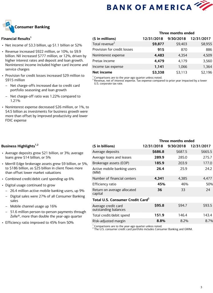Consumer Banking Three months ended Financial Results1 ($ in millions) 12/31/2018 9/30/2018 12/31/2017 2 • Net income of $3.3 billion, up $1.1 billion or 52% Total revenue $9,877 $9,403 $8,955 Provision for credit losses 915 870 886 • Revenue increased $922 million, or 10%, to $9.9 billion. NII increased $777 million, or 12%, driven by Noninterest expense 4,483 4,354 4,509 higher interest rates and deposit and loan growth. Pretax income 4,479 4,179 3,560 Noninterest income included higher card income and Income tax expense 1,141 1,066 1,364 service charges Net income $3,338 $3,113 $2,196 • Provision for credit losses increased $29 million to 1 Comparisons are to the year-ago quarter unless noted. $915 million 2 Revenue, net of interest expense. Tax expense compared to prior year impacted by a lower U.S. corporate tax rate. – Net charge-offs increased due to credit card portfolio seasoning and loan growth – Net charge-off ratio was 1.22% compared to 1.21% • Noninterest expense decreased $26 million, or 1%, to $4.5 billion as investments for business growth were more than offset by improved productivity and lower FDIC expense Three months ended Business Highlights1,2 ($ in billions) 12/31/2018 9/30/2018 12/31/2017 • Average deposits grew $21 billion, or 3%; average Average deposits $686.8 $687.5 $665.5 loans grew $14 billion, or 5% Average loans and leases 289.9 285.0 275.7 • Merrill Edge brokerage assets grew $9 billion, or 5%, Brokerage assets (EOP) 185.9 203.9 177.0 to $186 billion, as $25 billion in client flows more Active mobile banking users 26.4 25.9 24.2 than offset lower market valuations (MM) • Combined credit/debit card spending up 6% Number of financial centers 4,341 4,385 4,477 • Digital usage continued to grow Efficiency ratio 45% 46% 50% – 26.4 million active mobile banking users, up 9% Return on average allocated 36 33 24 capital – Digital sales were 27% of all Consumer Banking 2 sales Total U.S. Consumer Credit Card – Mobile channel usage up 16% Average credit card $95.8 $94.7 $93.5 outstanding balances – 51.6 million person-to-person payments through Zelle®, more than double the year-ago quarter Total credit/debit spend 151.9 146.4 143.4 • Efficiency ratio improved to 45% from 50% Risk-adjusted margin 8.8% 8.2% 8.7% 1 Comparisons are to the year-ago quarter unless noted. 2 The U.S. consumer credit card portfolio includes Consumer Banking and GWIM. 3