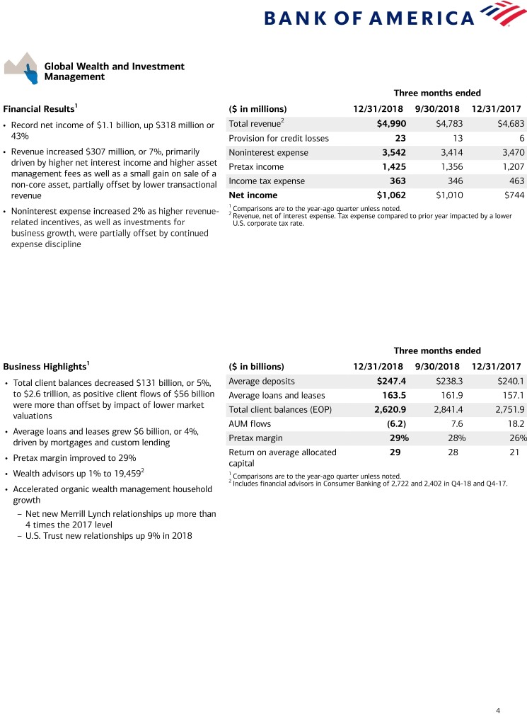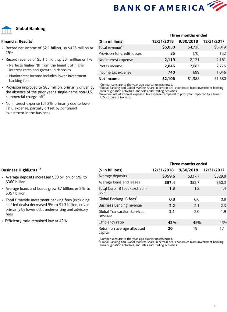 17 Bank of America Corporation and Subsidiaries Annual Results by Business Segment and All Other (Dollars in millions) Year Ended December 31, 2018 Consumer Global Global All Banking GWIM Banking Markets Other Total revenue, net of interest expense $ 37,523 $ 19,338 $ 19,644 $ 16,063 $ (711) Provision for credit losses 3,664 86 8 — (476) Noninterest expense 17,713 13,777 8,591 10,686 2,614 Net income (loss) 12,029 4,079 8,173 3,979 (113) Return on average allocated capital (1) 33% 28% 20% 11% n/m Balance Sheet Average Total loans and leases $ 283,807 $ 161,342 $ 354,236 $ 72,651 $ 61,013 Total deposits 684,173 241,256 336,337 31,209 21,966 Allocated capital (1) 37,000 14,500 41,000 35,000 n/m Year end Total loans and leases $ 294,335 $ 164,854 $ 365,717 $ 73,928 $ 48,061 Total deposits 696,146 268,700 360,248 37,841 18,541 Year Ended December 31, 2017 Consumer Global Global All Banking GWIM Banking Markets Other Total revenue, net of interest expense $ 34,521 $ 18,590 $ 19,999 $ 15,951 $ (784) Provision for credit losses 3,525 56 212 164 (561) Noninterest expense 17,795 13,556 8,596 10,731 4,065 Net income (loss) 8,202 3,093 6,953 3,293 (3,309) Return on average allocated capital (1) 22% 22% 17% 9% n/m Balance Sheet Average Total loans and leases $ 266,058 $ 152,682 $ 346,089 $ 71,413 $ 82,489 Total deposits 653,320 245,559 312,859 32,864 25,194 Allocated capital (1) 37,000 14,000 40,000 35,000 n/m Year end Total loans and leases $ 280,473 $ 159,378 $ 350,668 $ 76,778 $ 69,452 Total deposits 676,530 246,994 329,273 34,029 22,719 (1) Return on average allocated capital is calculated as net income, adjusted for cost of funds and earnings credits and certain expenses related to intangibles, divided by average allocated capital. Other companies may define or calculate these measures differently. n/m = not meaningful Certain prior period amounts have been reclassified among the segments to conform to current period presentation. Current period information is preliminary and based on company data available at the time of the presentation.