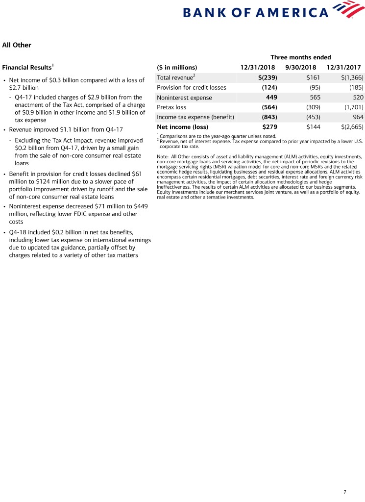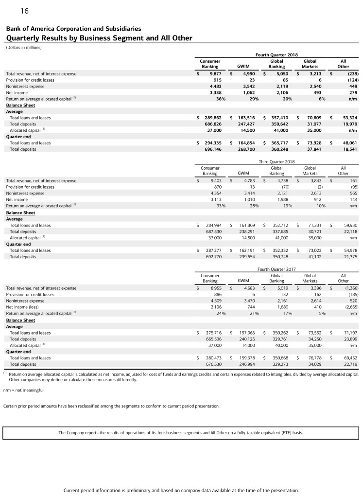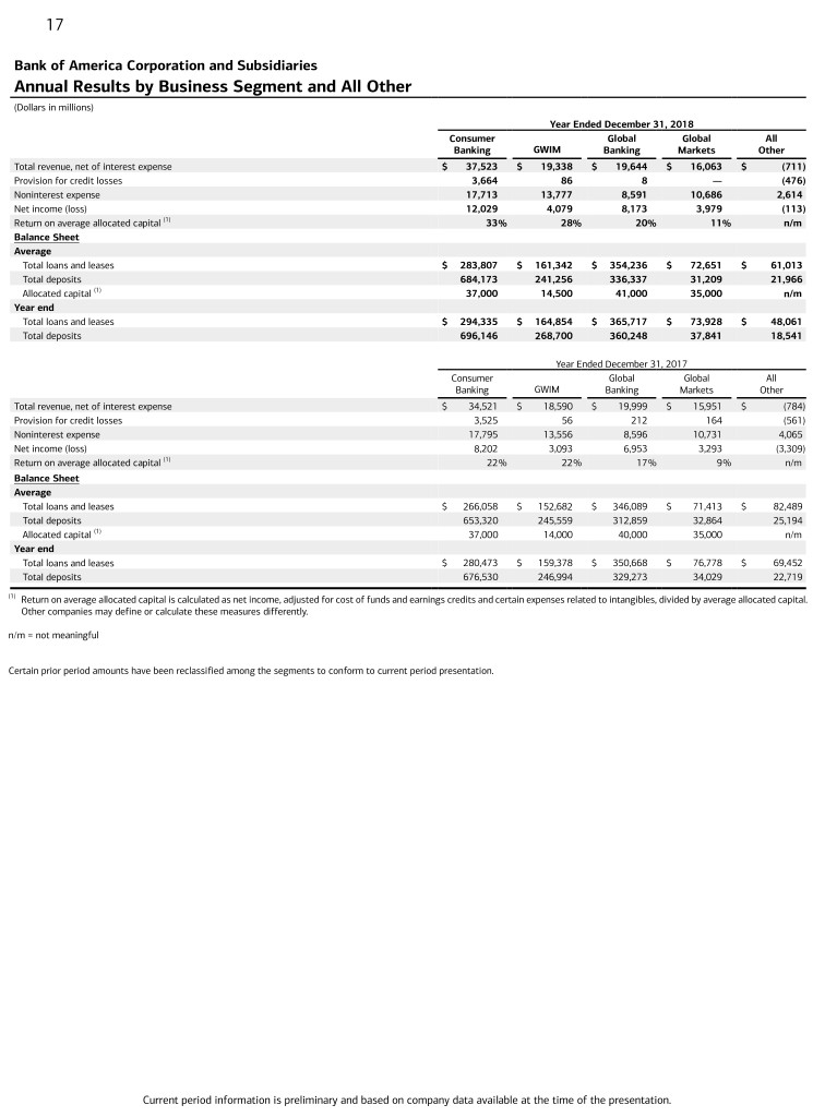 16 Bank of America Corporation and Subsidiaries Quarterly Results by Business Segment and All Other (Dollars in millions) Fourth Quarter 2018 Consumer Global Global All Banking GWIM Banking Markets Other Total revenue, net of interest expense $ 9,877 $ 4,990 $ 5,050 $ 3,213 $ (239) Provision for credit losses 915 23 85 6 (124) Noninterest expense 4,483 3,542 2,119 2,540 449 Net income 3,338 1,062 2,106 493 279 Return on average allocated capital (1) 36% 29% 20% 6% n/m Balance Sheet Average Total loans and leases $ 289,862 $ 163,516 $ 357,410 $ 70,609 $ 53,324 Total deposits 686,826 247,427 359,642 31,077 19,979 Allocated capital (1) 37,000 14,500 41,000 35,000 n/m Quarter end Total loans and leases $ 294,335 $ 164,854 $ 365,717 $ 73,928 $ 48,061 Total deposits 696,146 268,700 360,248 37,841 18,541 Third Quarter 2018 Consumer Global Global All Banking GWIM Banking Markets Other Total revenue, net of interest expense $ 9,403 $ 4,783 $ 4,738 $ 3,843 $ 161 Provision for credit losses 870 13 (70) (2) (95) Noninterest expense 4,354 3,414 2,121 2,613 565 Net income 3,113 1,010 1,988 912 144 Return on average allocated capital (1) 33% 28% 19% 10% n/m Balance Sheet Average Total loans and leases $ 284,994 $ 161,869 $ 352,712 $ 71,231 $ 59,930 Total deposits 687,530 238,291 337,685 30,721 22,118 Allocated capital (1) 37,000 14,500 41,000 35,000 n/m Quarter end Total loans and leases $ 287,277 $ 162,191 $ 352,332 $ 73,023 $ 54,978 Total deposits 692,770 239,654 350,748 41,102 21,375 Fourth Quarter 2017 Consumer Global Global All Banking GWIM Banking Markets Other Total revenue, net of interest expense $ 8,955 $ 4,683 $ 5,019 $ 3,396 $ (1,366) Provision for credit losses 886 6 132 162 (185) Noninterest expense 4,509 3,470 2,161 2,614 520 Net income (loss) 2,196 744 1,680 410 (2,665) Return on average allocated capital (1) 24% 21% 17% 5% n/m Balance Sheet Average Total loans and leases $ 275,716 $ 157,063 $ 350,262 $ 73,552 $ 71,197 Total deposits 665,536 240,126 329,761 34,250 23,899 Allocated capital (1) 37,000 14,000 40,000 35,000 n/m Quarter end Total loans and leases $ 280,473 $ 159,378 $ 350,668 $ 76,778 $ 69,452 Total deposits 676,530 246,994 329,273 34,029 22,719 (1) Return on average allocated capital is calculated as net income, adjusted for cost of funds and earnings credits and certain expenses related to intangibles, divided by average allocated capital. Other companies may define or calculate these measures differently. n/m = not meaningful Certain prior period amounts have been reclassified among the segments to conform to current period presentation. The Company reports the results of operations of its four business segments and All Other on a fully-taxable equivalent (FTE) basis. Current period information is preliminary and based on company data available at the time of the presentation.