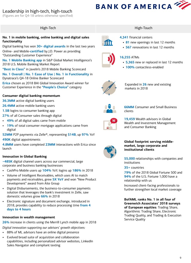 Leadership in high-tech, high-touch (Figures are for Q4-18 unless otherwise specified) High-Tech High-Touch No. 1 in mobile banking, online banking and digital sales 4,341 financial centers functionality • 81 new openings in last 12 months Digital banking has won 30+ digital awards in the last two years • 567 renovations in last 12 months Online- and Mobile-certified by J.D. Power as providing “Outstanding Customer Experience” 16,255 ATMs No. 1 Mobile Banking app in S&P Global Market Intelligence’s • 5,365 new or replaced in last 12 months 2018 U.S. Mobile Banking Market Report • 100% contactless-enabled “Best in Class” in Javelin’s 2018 Mobile Banking Scorecard No. 1 Overall | No. 1 Ease of Use | No. 1 in Functionality in Dynatrace’s Q4-18 Online Banker Scorecard Erica chosen as 2018 BAI Global Innovation Award winner for Expanded in 26 new and existing Customer Experience in the “People’s Choice” category markets in 2018 Consumer digital banking momentum 36.3MM active digital banking users 26.4MM active mobile banking users 66MM Consumer and Small Business 1.5B logins to consumer banking app clients 27% of all Consumer sales through digital • 49% of all digital sales came from mobile 19,459 Wealth advisors in Global Wealth and Investment Management • 19% of total consumer mortgage applications came from and Consumer Banking digital 52MM P2P payments via Zelle®, representing $14B, up 97% YoY 490K digital appointments Global footprint serving middle- 4.8MM users have completed 23MM interactions with Erica since market, large corporate and launch institutional clients Innovation in Global Banking 55,000 relationships with companies and ~485K digital channel users across our commercial, large institutions corporate and business banking businesses 35+ countries • CashPro Mobile users up 104% YoY; logins up 186% in 2018 79% of the 2018 Global Fortune 500 and • Volume of Intelligent Receivables, which uses AI to match 94% of the U.S. Fortune 1,000 have a payments and receivables, grew 5X YoY and won “New Product relationship with us Development” award from Aite Group Increased client-facing professionals to • Digital Disbursements, the business-to-consumer payments further strengthen local market coverage solution that leverages the bank’s investment in Zelle, saw domestic volumes grow 66% in 2018 BofAML ranks No. 1 in all four of • Electronic signature and document exchange, introduced in Greenwich Associates’ 2018 surveys 2018, provides capability to reduce processing time from 4 of European equities: Trading Share, days to 4 hours Algorithmic Trading Share, Electronic Trading Quality, and Trading & Execution Innovation in wealth management Service Quality 26% increase in clients using the Merrill Lynch mobile app in 2018 Digital innovation supporting our advisors’ growth objectives: • 88% of ML advisors have an online digital presence • Evolved broad suite of acquisition and collaboration capabilities, including personalized advisor websites, LinkedIn Sales Navigator and compliant texting 9