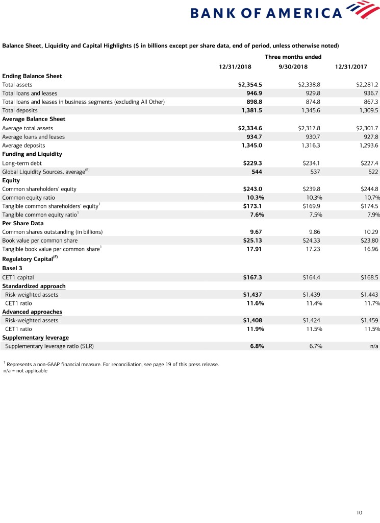 Balance Sheet, Liquidity and Capital Highlights ($ in billions except per share data, end of period, unless otherwise noted) Three months ended 12/31/2018 9/30/2018 12/31/2017 Ending Balance Sheet Total assets $2,354.5 $2,338.8 $2,281.2 Total loans and leases 946.9 929.8 936.7 Total loans and leases in business segments (excluding All Other) 898.8 874.8 867.3 Total deposits 1,381.5 1,345.6 1,309.5 Average Balance Sheet Average total assets $2,334.6 $2,317.8 $2,301.7 Average loans and leases 934.7 930.7 927.8 Average deposits 1,345.0 1,316.3 1,293.6 Funding and Liquidity Long-term debt $229.3 $234.1 $227.4 Global Liquidity Sources, average(E) 544 537 522 Equity Common shareholders’ equity $243.0 $239.8 $244.8 Common equity ratio 10.3% 10.3% 10.7% Tangible common shareholders’ equity1 $173.1 $169.9 $174.5 Tangible common equity ratio1 7.6% 7.5% 7.9% Per Share Data Common shares outstanding (in billions) 9.67 9.86 10.29 Book value per common share $25.13 $24.33 $23.80 Tangible book value per common share1 17.91 17.23 16.96 Regulatory Capital(F) Basel 3 CET1 capital $167.3 $164.4 $168.5 Standardized approach Risk-weighted assets $1,437 $1,439 $1,443 CET1 ratio 11.6% 11.4% 11.7% Advanced approaches Risk-weighted assets $1,408 $1,424 $1,459 CET1 ratio 11.9% 11.5% 11.5% Supplementary leverage Supplementary leverage ratio (SLR) 6.8% 6.7% n/a 1 Represents a non-GAAP financial measure. For reconciliation, see page 19 of this press release. n/a = not applicable 10