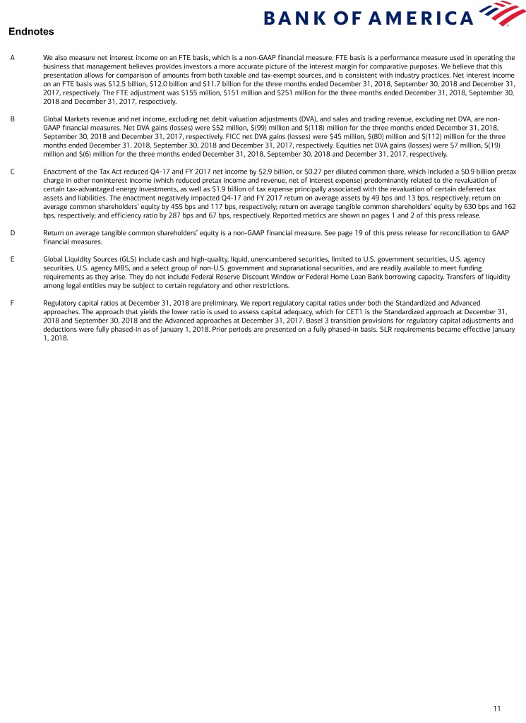 Endnotes A We also measure net interest income on an FTE basis, which is a non-GAAP financial measure. FTE basis is a performance measure used in operating the business that management believes provides investors a more accurate picture of the interest margin for comparative purposes. We believe that this presentation allows for comparison of amounts from both taxable and tax-exempt sources, and is consistent with industry practices. Net interest income on an FTE basis was $12.5 billion, $12.0 billion and $11.7 billion for the three months ended December 31, 2018, September 30, 2018 and December 31, 2017, respectively. The FTE adjustment was $155 million, $151 million and $251 million for the three months ended December 31, 2018, September 30, 2018 and December 31, 2017, respectively. B Global Markets revenue and net income, excluding net debit valuation adjustments (DVA), and sales and trading revenue, excluding net DVA, are non- GAAP financial measures. Net DVA gains (losses) were $52 million, $(99) million and $(118) million for the three months ended December 31, 2018, September 30, 2018 and December 31, 2017, respectively. FICC net DVA gains (losses) were $45 million, $(80) million and $(112) million for the three months ended December 31, 2018, September 30, 2018 and December 31, 2017, respectively. Equities net DVA gains (losses) were $7 million, $(19) million and $(6) million for the three months ended December 31, 2018, September 30, 2018 and December 31, 2017, respectively. C Enactment of the Tax Act reduced Q4-17 and FY 2017 net income by $2.9 billion, or $0.27 per diluted common share, which included a $0.9 billion pretax charge in other noninterest income (which reduced pretax income and revenue, net of interest expense) predominantly related to the revaluation of certain tax-advantaged energy investments, as well as $1.9 billion of tax expense principally associated with the revaluation of certain deferred tax assets and liabilities. The enactment negatively impacted Q4-17 and FY 2017 return on average assets by 49 bps and 13 bps, respectively; return on average common shareholders’ equity by 455 bps and 117 bps, respectively; return on average tangible common shareholders’ equity by 630 bps and 162 bps, respectively; and efficiency ratio by 287 bps and 67 bps, respectively. Reported metrics are shown on pages 1 and 2 of this press release. D Return on average tangible common shareholders’ equity is a non-GAAP financial measure. See page 19 of this press release for reconciliation to GAAP financial measures. E Global Liquidity Sources (GLS) include cash and high-quality, liquid, unencumbered securities, limited to U.S. government securities, U.S. agency securities, U.S. agency MBS, and a select group of non-U.S. government and supranational securities, and are readily available to meet funding requirements as they arise. They do not include Federal Reserve Discount Window or Federal Home Loan Bank borrowing capacity. Transfers of liquidity among legal entities may be subject to certain regulatory and other restrictions. F Regulatory capital ratios at December 31, 2018 are preliminary. We report regulatory capital ratios under both the Standardized and Advanced approaches. The approach that yields the lower ratio is used to assess capital adequacy, which for CET1 is the Standardized approach at December 31, 2018 and September 30, 2018 and the Advanced approaches at December 31, 2017. Basel 3 transition provisions for regulatory capital adjustments and deductions were fully phased-in as of January 1, 2018. Prior periods are presented on a fully phased-in basis. SLR requirements became effective January 1, 2018. 11