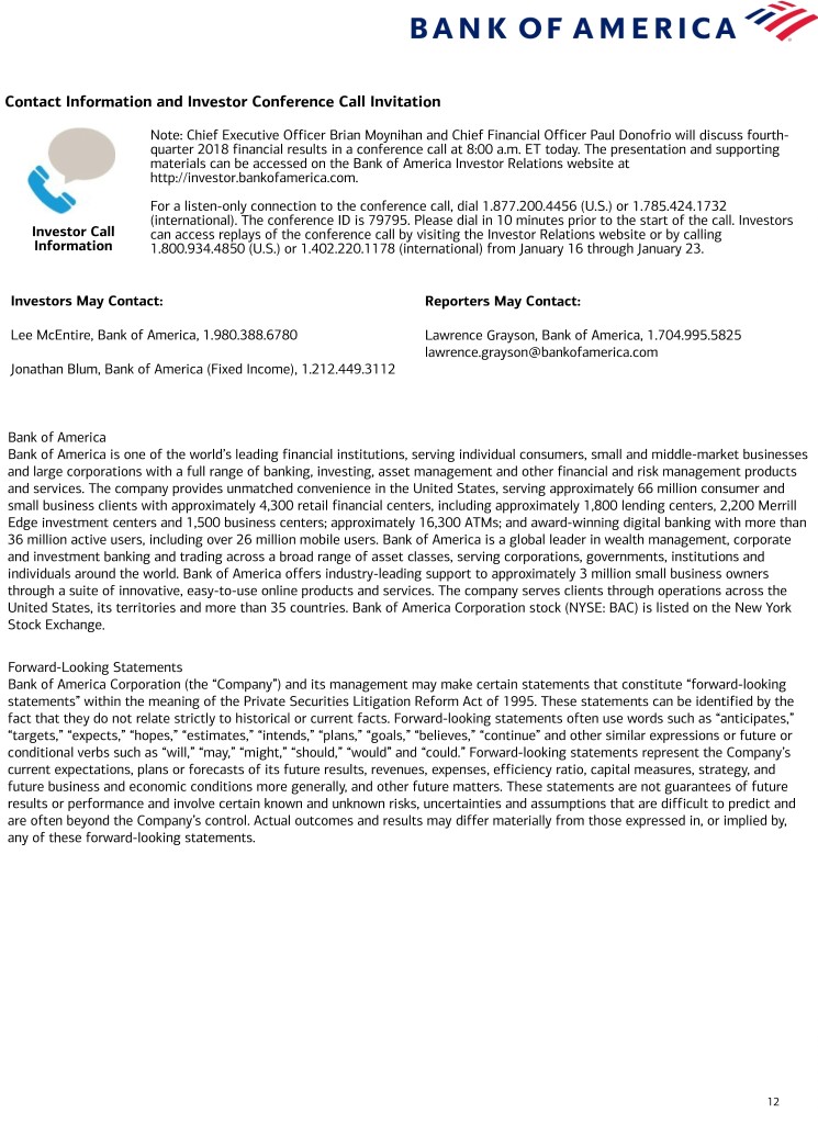 Contact Information and Investor Conference Call Invitation Note: Chief Executive Officer Brian Moynihan and Chief Financial Officer Paul Donofrio will discuss fourth- quarter 2018 financial results in a conference call at 8:00 a.m. ET today. The presentation and supporting materials can be accessed on the Bank of America Investor Relations website at http://investor.bankofamerica.com. For a listen-only connection to the conference call, dial 1.877.200.4456 (U.S.) or 1.785.424.1732 (international). The conference ID is 79795. Please dial in 10 minutes prior to the start of the call. Investors Investor Call can access replays of the conference call by visiting the Investor Relations website or by calling Information 1.800.934.4850 (U.S.) or 1.402.220.1178 (international) from January 16 through January 23. Investors May Contact: Reporters May Contact: Lee McEntire, Bank of America, 1.980.388.6780 Lawrence Grayson, Bank of America, 1.704.995.5825 lawrence.grayson@bankofamerica.com Jonathan Blum, Bank of America (Fixed Income), 1.212.449.3112 Bank of America Bank of America is one of the world’s leading financial institutions, serving individual consumers, small and middle-market businesses and large corporations with a full range of banking, investing, asset management and other financial and risk management products and services. The company provides unmatched convenience in the United States, serving approximately 66 million consumer and small business clients with approximately 4,300 retail financial centers, including approximately 1,800 lending centers, 2,200 Merrill Edge investment centers and 1,500 business centers; approximately 16,300 ATMs; and award-winning digital banking with more than 36 million active users, including over 26 million mobile users. Bank of America is a global leader in wealth management, corporate and investment banking and trading across a broad range of asset classes, serving corporations, governments, institutions and individuals around the world. Bank of America offers industry-leading support to approximately 3 million small business owners through a suite of innovative, easy-to-use online products and services. The company serves clients through operations across the United States, its territories and more than 35 countries. Bank of America Corporation stock (NYSE: BAC) is listed on the New York Stock Exchange. Forward-Looking Statements Bank of America Corporation (the “Company”) and its management may make certain statements that constitute “forward-looking statements” within the meaning of the Private Securities Litigation Reform Act of 1995. These statements can be identified by the fact that they do not relate strictly to historical or current facts. Forward-looking statements often use words such as “anticipates,” “targets,” “expects,” “hopes,” “estimates,” “intends,” “plans,” “goals,” “believes,” “continue” and other similar expressions or future or conditional verbs such as “will,” “may,” “might,” “should,” “would” and “could.” Forward-looking statements represent the Company’s current expectations, plans or forecasts of its future results, revenues, expenses, efficiency ratio, capital measures, strategy, and future business and economic conditions more generally, and other future matters. These statements are not guarantees of future results or performance and involve certain known and unknown risks, uncertainties and assumptions that are difficult to predict and are often beyond the Company’s control. Actual outcomes and results may differ materially from those expressed in, or implied by, any of these forward-looking statements. 12