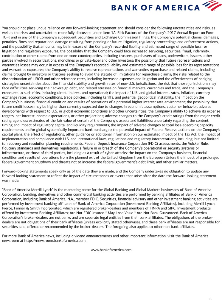 You should not place undue reliance on any forward-looking statement and should consider the following uncertainties and risks, as well as the risks and uncertainties more fully discussed under Item 1A. Risk Factors of the Company’s 2017 Annual Report on Form 10-K and in any of the Company’s subsequent Securities and Exchange Commission filings: the Company’s potential claims, damages, penalties, fines and reputational damage resulting from pending or future litigation, regulatory proceedings and enforcement actions, and the possibility that amounts may be in excess of the Company’s recorded liability and estimated range of possible loss for litigation and regulatory exposures; the possibility that the Company could face increased servicing, securities, fraud, indemnity, contribution or other claims from one or more counterparties, including trustees, purchasers of loans, underwriters, issuers, other parties involved in securitizations, monolines or private-label and other investors; the possibility that future representations and warranties losses may occur in excess of the Company’s recorded liability and estimated range of possible loss for its representations and warranties exposures; the Company’s ability to resolve representations and warranties repurchase and related claims, including claims brought by investors or trustees seeking to avoid the statute of limitations for repurchase claims; the risks related to the discontinuation of LIBOR and other reference rates, including increased expenses and litigation and the effectiveness of hedging strategies; uncertainties about the financial stability and growth rates of non-U.S. jurisdictions, the risk that those jurisdictions may face difficulties servicing their sovereign debt, and related stresses on financial markets, currencies and trade, and the Company’s exposures to such risks, including direct, indirect and operational; the impact of U.S. and global interest rates, inflation, currency exchange rates, economic conditions, trade policies, including tariffs, and potential geopolitical instability; the impact on the Company’s business, financial condition and results of operations of a potential higher interest rate environment; the possibility that future credit losses may be higher than currently expected due to changes in economic assumptions, customer behavior, adverse developments with respect to U.S. or global economic conditions and other uncertainties; the Company’s ability to achieve its expense targets, net interest income expectations, or other projections; adverse changes to the Company’s credit ratings from the major credit rating agencies; estimates of the fair value of certain of the Company’s assets and liabilities; uncertainty regarding the content, timing and impact of regulatory capital and liquidity requirements; the impact of adverse changes to total loss-absorbing capacity requirements and/or global systemically important bank surcharges; the potential impact of Federal Reserve actions on the Company’s capital plans; the effect of regulations, other guidance or additional information on our estimated impact of the Tax Act; the impact of implementation and compliance with U.S. and international laws, regulations and regulatory interpretations, including, but not limited to, recovery and resolution planning requirements, Federal Deposit Insurance Corporation (FDIC) assessments, the Volcker Rule, fiduciary standards and derivatives regulations; a failure in or breach of the Company’s operational or security systems or infrastructure, or those of third parties, including as a result of cyber-attacks; the impact on the Company’s business, financial condition and results of operations from the planned exit of the United Kingdom from the European Union; the impact of a prolonged federal government shutdown and threats not to increase the federal government’s debt limit; and other similar matters. Forward-looking statements speak only as of the date they are made, and the Company undertakes no obligation to update any forward-looking statement to reflect the impact of circumstances or events that arise after the date the forward-looking statement was made. “Bank of America Merrill Lynch” is the marketing name for the Global Banking and Global Markets businesses of Bank of America Corporation. Lending, derivatives and other commercial banking activities are performed by banking affiliates of Bank of America Corporation, including Bank of America, N.A., member FDIC. Securities, financial advisory and other investment banking activities are performed by investment banking affiliates of Bank of America Corporation (Investment Banking Affiliates), including Merrill Lynch, Pierce, Fenner & Smith Incorporated, which are registered broker-dealers and members of FINRA and SIPC. Investment products offered by Investment Banking Affiliates: Are Not FDIC Insured * May Lose Value * Are Not Bank Guaranteed. Bank of America Corporation’s broker-dealers are not banks and are separate legal entities from their bank affiliates. The obligations of the broker- dealers are not obligations of their bank affiliates (unless explicitly stated otherwise), and these bank affiliates are not responsible for securities sold, offered or recommended by the broker-dealers. The foregoing also applies to other non-bank affiliates. For more Bank of America news, including dividend announcements and other important information, visit the Bank of America newsroom at https://newsroom.bankofamerica.com. www.bankofamerica.com 13