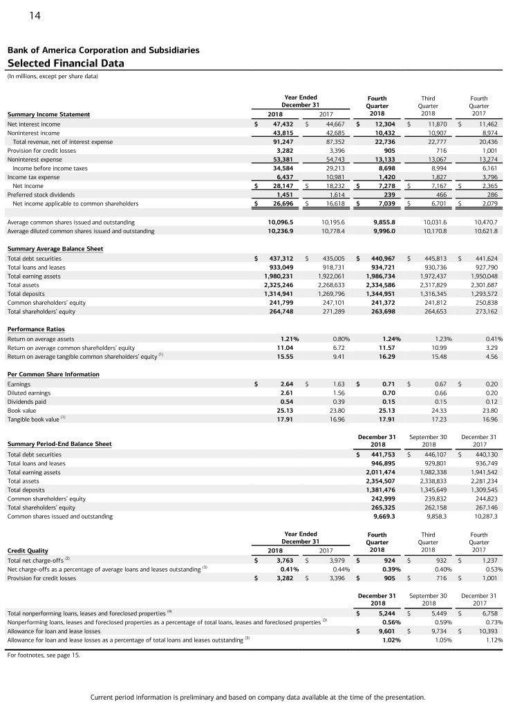 14 Bank of America Corporation and Subsidiaries Selected Financial Data (In millions, except per share data) Year Ended Fourth Third Fourth December 31 Quarter Quarter Quarter Summary Income Statement 2018 2017 2018 2018 2017 Net interest income $ 47,432 $ 44,667 $ 12,304 $ 11,870 $ 11,462 Noninterest income 43,815 42,685 10,432 10,907 8,974 Total revenue, net of interest expense 91,247 87,352 22,736 22,777 20,436 Provision for credit losses 3,282 3,396 905 716 1,001 Noninterest expense 53,381 54,743 13,133 13,067 13,274 Income before income taxes 34,584 29,213 8,698 8,994 6,161 Income tax expense 6,437 10,981 1,420 1,827 3,796 Net income $ 28,147 $ 18,232 $ 7,278 $ 7,167 $ 2,365 Preferred stock dividends 1,451 1,614 239 466 286 Net income applicable to common shareholders $ 26,696 $ 16,618 $ 7,039 $ 6,701 $ 2,079 Average common shares issued and outstanding 10,096.5 10,195.6 9,855.8 10,031.6 10,470.7 Average diluted common shares issued and outstanding 10,236.9 10,778.4 9,996.0 10,170.8 10,621.8 Summary Average Balance Sheet Total debt securities $ 437,312 $ 435,005 $ 440,967 $ 445,813 $ 441,624 Total loans and leases 933,049 918,731 934,721 930,736 927,790 Total earning assets 1,980,231 1,922,061 1,986,734 1,972,437 1,950,048 Total assets 2,325,246 2,268,633 2,334,586 2,317,829 2,301,687 Total deposits 1,314,941 1,269,796 1,344,951 1,316,345 1,293,572 Common shareholders’ equity 241,799 247,101 241,372 241,812 250,838 Total shareholders’ equity 264,748 271,289 263,698 264,653 273,162 Performance Ratios Return on average assets 1.21% 0.80% 1.24% 1.23% 0.41% Return on average common shareholders’ equity 11.04 6.72 11.57 10.99 3.29 Return on average tangible common shareholders’ equity (1) 15.55 9.41 16.29 15.48 4.56 Per Common Share Information Earnings $ 2.64 $ 1.63 $ 0.71 $ 0.67 $ 0.20 Diluted earnings 2.61 1.56 0.70 0.66 0.20 Dividends paid 0.54 0.39 0.15 0.15 0.12 Book value 25.13 23.80 25.13 24.33 23.80 Tangible book value (1) 17.91 16.96 17.91 17.23 16.96 December 31 September 30 December 31 Summary Period-End Balance Sheet 2018 2018 2017 Total debt securities $ 441,753 $ 446,107 $ 440,130 Total loans and leases 946,895 929,801 936,749 Total earning assets 2,011,474 1,982,338 1,941,542 Total assets 2,354,507 2,338,833 2,281,234 Total deposits 1,381,476 1,345,649 1,309,545 Common shareholders’ equity 242,999 239,832 244,823 Total shareholders’ equity 265,325 262,158 267,146 Common shares issued and outstanding 9,669.3 9,858.3 10,287.3 Year Ended Fourth Third Fourth December 31 Quarter Quarter Quarter Credit Quality 2018 2017 2018 2018 2017 Total net charge-offs (2) $ 3,763 $ 3,979 $ 924 $ 932 $ 1,237 Net charge-offs as a percentage of average loans and leases outstanding (3) 0.41% 0.44% 0.39% 0.40% 0.53% Provision for credit losses $ 3,282 $ 3,396 $ 905 $ 716 $ 1,001 December 31 September 30 December 31 2018 2018 2017 Total nonperforming loans, leases and foreclosed properties (4) $ 5,244 $ 5,449 $ 6,758 Nonperforming loans, leases and foreclosed properties as a percentage of total loans, leases and foreclosed properties (3) 0.56% 0.59% 0.73% Allowance for loan and lease losses $ 9,601 $ 9,734 $ 10,393 Allowance for loan and lease losses as a percentage of total loans and leases outstanding (3) 1.02% 1.05% 1.12% For footnotes, see page 15. Current period information is preliminary and based on company data available at the time of the presentation.