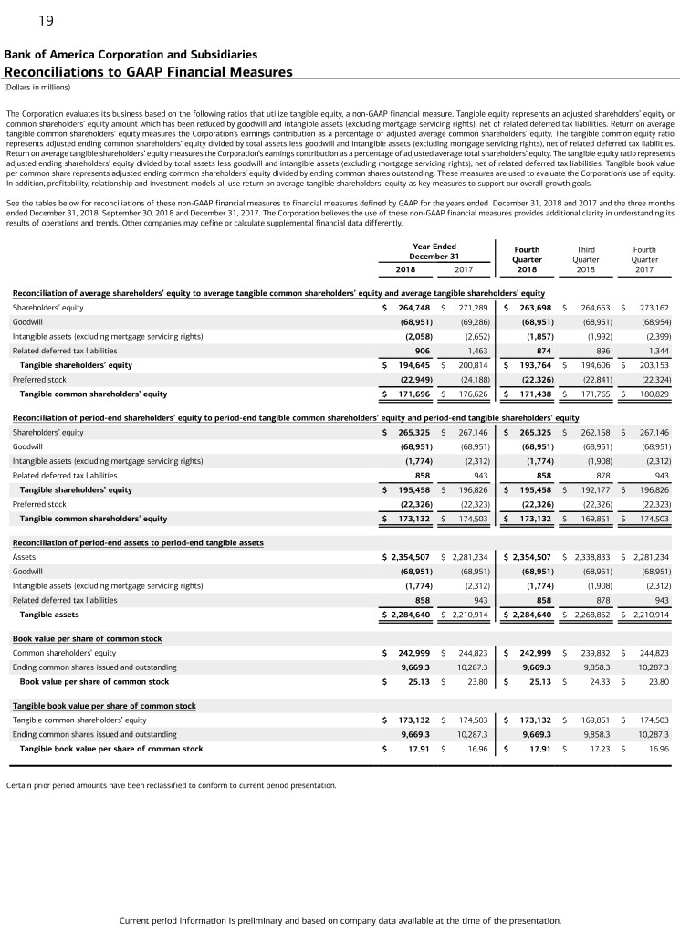 19 Bank of America Corporation and Subsidiaries Reconciliations to GAAP Financial Measures (Dollars in millions) The Corporation evaluates its business based on the following ratios that utilize tangible equity, a non-GAAP financial measure. Tangible equity represents an adjusted shareholders’ equity or common shareholders’ equity amount which has been reduced by goodwill and intangible assets (excluding mortgage servicing rights), net of related deferred tax liabilities. Return on average tangible common shareholders’ equity measures the Corporation’s earnings contribution as a percentage of adjusted average common shareholders’ equity. The tangible common equity ratio represents adjusted ending common shareholders’ equity divided by total assets less goodwill and intangible assets (excluding mortgage servicing rights), net of related deferred tax liabilities. Return on average tangible shareholders’ equity measures the Corporation’s earnings contribution as a percentage of adjusted average total shareholders’ equity. The tangible equity ratio represents adjusted ending shareholders’ equity divided by total assets less goodwill and intangible assets (excluding mortgage servicing rights), net of related deferred tax liabilities. Tangible book value per common share represents adjusted ending common shareholders’ equity divided by ending common shares outstanding. These measures are used to evaluate the Corporation’s use of equity. In addition, profitability, relationship and investment models all use return on average tangible shareholders’ equity as key measures to support our overall growth goals. See the tables below for reconciliations of these non-GAAP financial measures to financial measures defined by GAAP for the years ended December 31, 2018 and 2017 and the three months ended December 31, 2018, September 30, 2018 and December 31, 2017. The Corporation believes the use of these non-GAAP financial measures provides additional clarity in understanding its results of operations and trends. Other companies may define or calculate supplemental financial data differently. Year Ended Fourth Third Fourth December 31 Quarter Quarter Quarter 2018 2017 2018 2018 2017 Reconciliation of average shareholders’ equity to average tangible common shareholders’ equity and average tangible shareholders’ equity Shareholders’ equity $ 264,748 $ 271,289 $ 263,698 $ 264,653 $ 273,162 Goodwill (68,951) (69,286) (68,951) (68,951) (68,954) Intangible assets (excluding mortgage servicing rights) (2,058) (2,652) (1,857) (1,992) (2,399) Related deferred tax liabilities 906 1,463 874 896 1,344 Tangible shareholders’ equity $ 194,645 $ 200,814 $ 193,764 $ 194,606 $ 203,153 Preferred stock (22,949) (24,188) (22,326) (22,841) (22,324) Tangible common shareholders’ equity $ 171,696 $ 176,626 $ 171,438 $ 171,765 $ 180,829 Reconciliation of period-end shareholders’ equity to period-end tangible common shareholders’ equity and period-end tangible shareholders’ equity Shareholders’ equity $ 265,325 $ 267,146 $ 265,325 $ 262,158 $ 267,146 Goodwill (68,951) (68,951) (68,951) (68,951) (68,951) Intangible assets (excluding mortgage servicing rights) (1,774) (2,312) (1,774) (1,908) (2,312) Related deferred tax liabilities 858 943 858 878 943 Tangible shareholders’ equity $ 195,458 $ 196,826 $ 195,458 $ 192,177 $ 196,826 Preferred stock (22,326) (22,323) (22,326) (22,326) (22,323) Tangible common shareholders’ equity $ 173,132 $ 174,503 $ 173,132 $ 169,851 $ 174,503 Reconciliation of period-end assets to period-end tangible assets Assets $ 2,354,507 $ 2,281,234 $ 2,354,507 $ 2,338,833 $ 2,281,234 Goodwill (68,951) (68,951) (68,951) (68,951) (68,951) Intangible assets (excluding mortgage servicing rights) (1,774) (2,312) (1,774) (1,908) (2,312) Related deferred tax liabilities 858 943 858 878 943 Tangible assets $ 2,284,640 $ 2,210,914 $ 2,284,640 $ 2,268,852 $ 2,210,914 Book value per share of common stock Common shareholders’ equity $ 242,999 $ 244,823 $ 242,999 $ 239,832 $ 244,823 Ending common shares issued and outstanding 9,669.3 10,287.3 9,669.3 9,858.3 10,287.3 Book value per share of common stock $ 25.13 $ 23.80 $ 25.13 $ 24.33 $ 23.80 Tangible book value per share of common stock Tangible common shareholders’ equity $ 173,132 $ 174,503 $ 173,132 $ 169,851 $ 174,503 Ending common shares issued and outstanding 9,669.3 10,287.3 9,669.3 9,858.3 10,287.3 Tangible book value per share of common stock $ 17.91 $ 16.96 $ 17.91 $ 17.23 $ 16.96 Certain prior period amounts have been reclassified to conform to current period presentation. Current period information is preliminary and based on company data available at the time of the presentation.