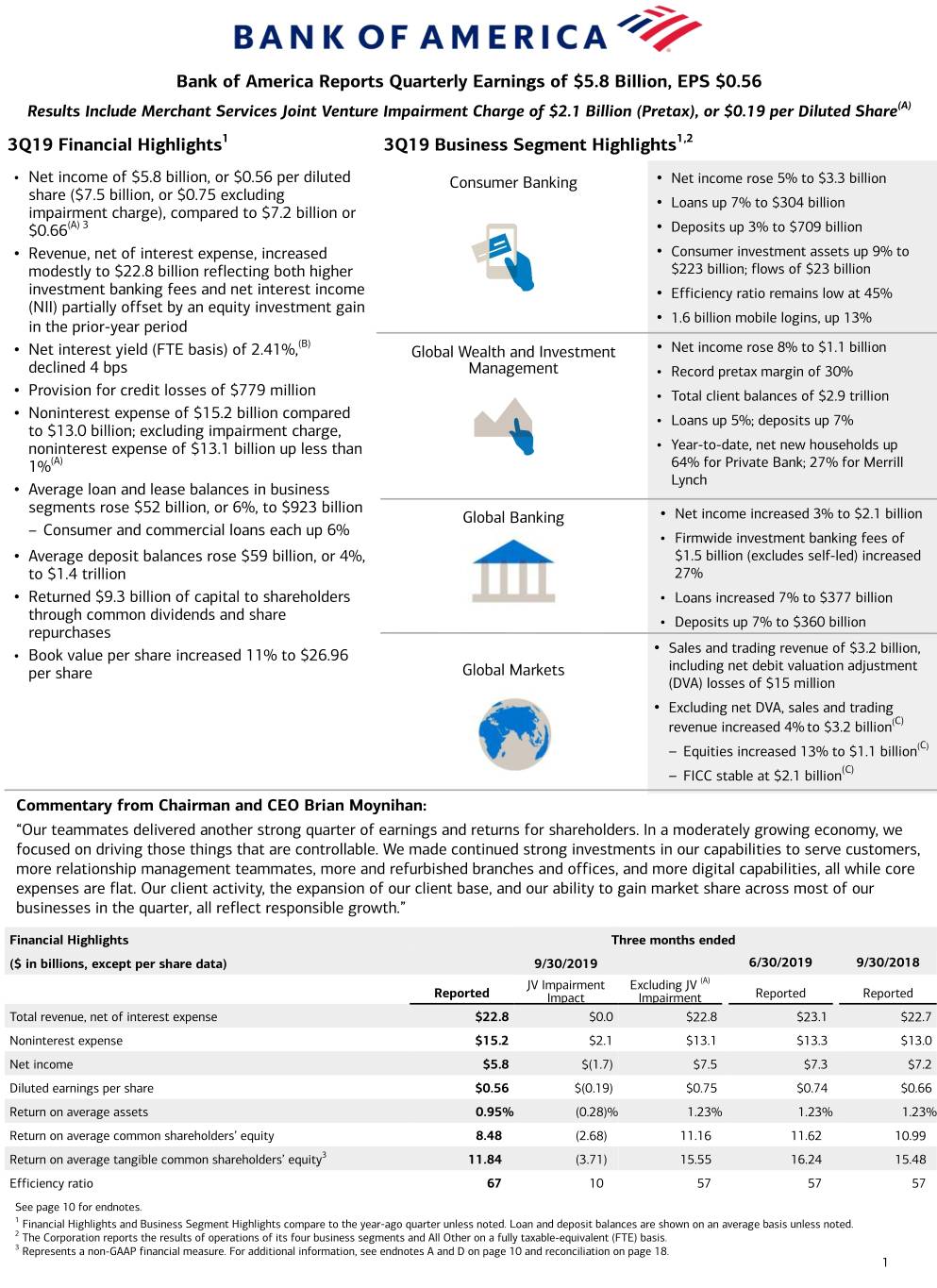 Bank of America Reports Quarterly Earnings of $5.8 Billion, EPS $0.56 Results Include Merchant Services Joint Venture Impairment Charge of $2.1 Billion (Pretax), or $0.19 per Diluted Share(A) 3Q19 Financial Highlights1 3Q19 Business Segment Highlights1,2 • Net income of $5.8 billion, or $0.56 per diluted Consumer Banking • Net income rose 5% to $3.3 billion share ($7.5 billion, or $0.75 excluding • Loans up 7% to $304 billion impairment charge), compared to $7.2 billion or $0.66(A) 3 • Deposits up 3% to $709 billion • Revenue, net of interest expense, increased • Consumer investment assets up 9% to modestly to $22.8 billion reflecting both higher $223 billion; flows of $23 billion investment banking fees and net interest income • Efficiency ratio remains low at 45% (NII) partially offset by an equity investment gain • 1.6 billion mobile logins, up 13% in the prior-year period (B) • Net interest yield (FTE basis) of 2.41%, Global Wealth and Investment • Net income rose 8% to $1.1 billion declined 4 bps Management • Record pretax margin of 30% • Provision for credit losses of $779 million • Total client balances of $2.9 trillion • Noninterest expense of $15.2 billion compared • Loans up 5%; deposits up 7% to $13.0 billion; excluding impairment charge, noninterest expense of $13.1 billion up less than • Year-to-date, net new households up 1%(A) 64% for Private Bank; 27% for Merrill Lynch • Average loan and lease balances in business segments rose $52 billion, or 6%, to $923 billion Global Banking • Net income increased 3% to $2.1 billion – Consumer and commercial loans each up 6% • Firmwide investment banking fees of • Average deposit balances rose $59 billion, or 4%, $1.5 billion (excludes self-led) increased to $1.4 trillion 27% • Returned $9.3 billion of capital to shareholders • Loans increased 7% to $377 billion through common dividends and share • Deposits up 7% to $360 billion repurchases • • Book value per share increased 11% to $26.96 Sales and trading revenue of $3.2 billion, per share Global Markets including net debit valuation adjustment (DVA) losses of $15 million • Excluding net DVA, sales and trading revenue increased 4% to $3.2 billion(C) – Equities increased 13% to $1.1 billion(C) – FICC stable at $2.1 billion(C) Commentary from Chairman and CEO Brian Moynihan: “Our teammates delivered another strong quarter of earnings and returns for shareholders. In a moderately growing economy, we focused on driving those things that are controllable. We made continued strong investments in our capabilities to serve customers, more relationship management teammates, more and refurbished branches and offices, and more digital capabilities, all while core expenses are flat. Our client activity, the expansion of our client base, and our ability to gain market share across most of our businesses in the quarter, all reflect responsible growth.” Financial Highlights Three months ended ($ in billions, except per share data) 9/30/2019 6/30/2019 9/30/2018 JV Impairment Excluding JV (A) Reported Impact Impairment Reported Reported Total revenue, net of interest expense $22.8 $0.0 $22.8 $23.1 $22.7 Noninterest expense $15.2 $2.1 $13.1 $13.3 $13.0 Net income $5.8 $(1.7) $7.5 $7.3 $7.2 Diluted earnings per share $0.56 $(0.19) $0.75 $0.74 $0.66 Return on average assets 0.95% (0.28)% 1.23% 1.23% 1.23% Return on average common shareholders’ equity 8.48 (2.68) 11.16 11.62 10.99 Return on average tangible common shareholders’ equity3 11.84 (3.71) 15.55 16.24 15.48 Efficiency ratio 67 10 57 57 57 See page 10 for endnotes. 1 Financial Highlights and Business Segment Highlights compare to the year-ago quarter unless noted. Loan and deposit balances are shown on an average basis unless noted. 2 The Corporation reports the results of operations of its four business segments and All Other on a fully taxable-equivalent (FTE) basis. 3 Represents a non-GAAP financial measure. For additional information, see endnotes A and D on page 10 and reconciliation on page 18. 1