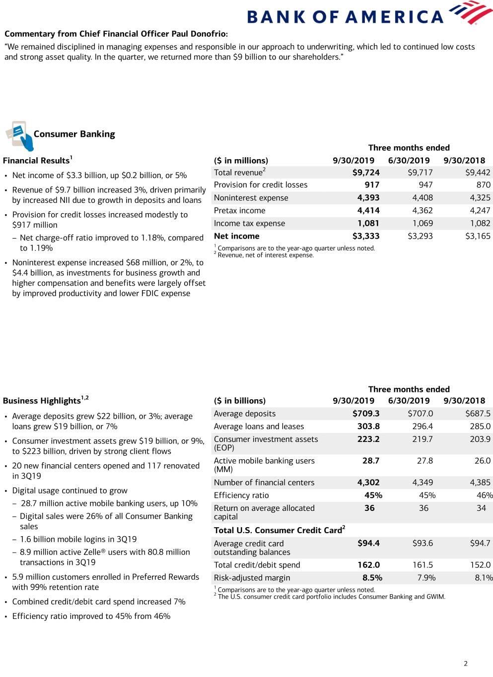 Commentary from Chief Financial Officer Paul Donofrio: “We remained disciplined in managing expenses and responsible in our approach to underwriting, which led to continued low costs and strong asset quality. In the quarter, we returned more than $9 billion to our shareholders.” Consumer Banking Three months ended Financial Results1 ($ in millions) 9/30/2019 6/30/2019 9/30/2018 2 • Net income of $3.3 billion, up $0.2 billion, or 5% Total revenue $9,724 $9,717 $9,442 Provision for credit losses 917 947 870 • Revenue of $9.7 billion increased 3%, driven primarily by increased NII due to growth in deposits and loans Noninterest expense 4,393 4,408 4,325 • Provision for credit losses increased modestly to Pretax income 4,414 4,362 4,247 $917 million Income tax expense 1,081 1,069 1,082 – Net charge-off ratio improved to 1.18%, compared Net income $3,333 $3,293 $3,165 to 1.19% 1 Comparisons are to the year-ago quarter unless noted. 2 Revenue, net of interest expense. • Noninterest expense increased $68 million, or 2%, to $4.4 billion, as investments for business growth and higher compensation and benefits were largely offset by improved productivity and lower FDIC expense Three months ended Business Highlights1,2 ($ in billions) 9/30/2019 6/30/2019 9/30/2018 • Average deposits grew $22 billion, or 3%; average Average deposits $709.3 $707.0 $687.5 loans grew $19 billion, or 7% Average loans and leases 303.8 296.4 285.0 • Consumer investment assets grew $19 billion, or 9%, Consumer investment assets 223.2 219.7 203.9 to $223 billion, driven by strong client flows (EOP) Active mobile banking users 28.7 27.8 26.0 • 20 new financial centers opened and 117 renovated (MM) in 3Q19 Number of financial centers 4,302 4,349 4,385 • Digital usage continued to grow Efficiency ratio 45% 45% 46% – 28.7 million active mobile banking users, up 10% Return on average allocated 36 36 34 – Digital sales were 26% of all Consumer Banking capital sales Total U.S. Consumer Credit Card2 – 1.6 billion mobile logins in 3Q19 Average credit card $94.4 $93.6 $94.7 – 8.9 million active Zelle® users with 80.8 million outstanding balances transactions in 3Q19 Total credit/debit spend 162.0 161.5 152.0 • 5.9 million customers enrolled in Preferred Rewards Risk-adjusted margin 8.5% 7.9% 8.1% with 99% retention rate 1 Comparisons are to the year-ago quarter unless noted. 2 The U.S. consumer credit card portfolio includes Consumer Banking and GWIM. • Combined credit/debit card spend increased 7% • Efficiency ratio improved to 45% from 46% 2