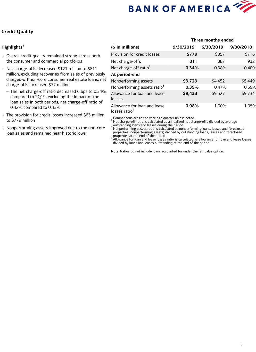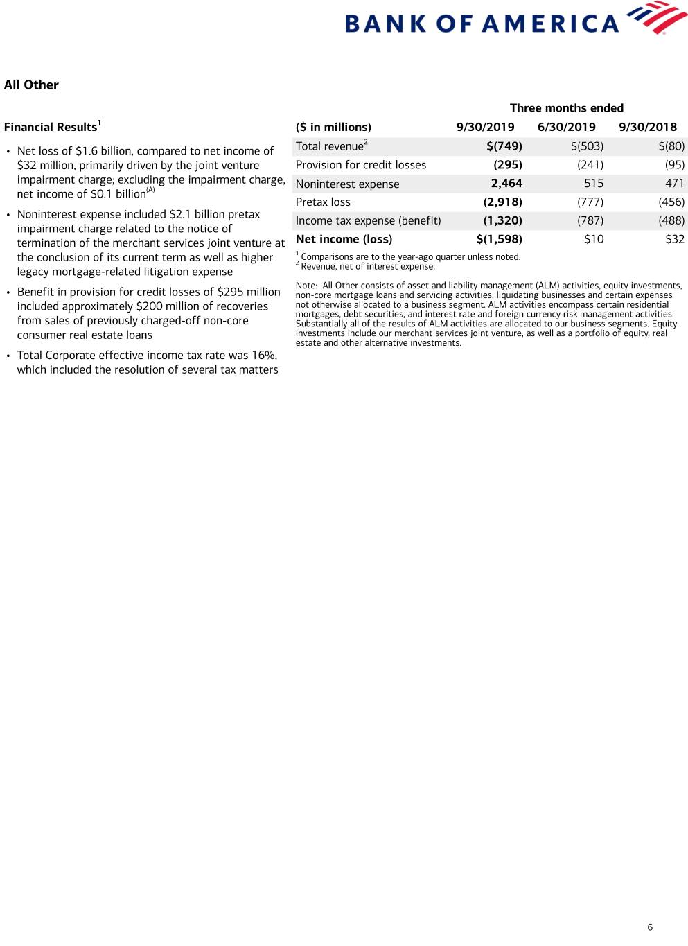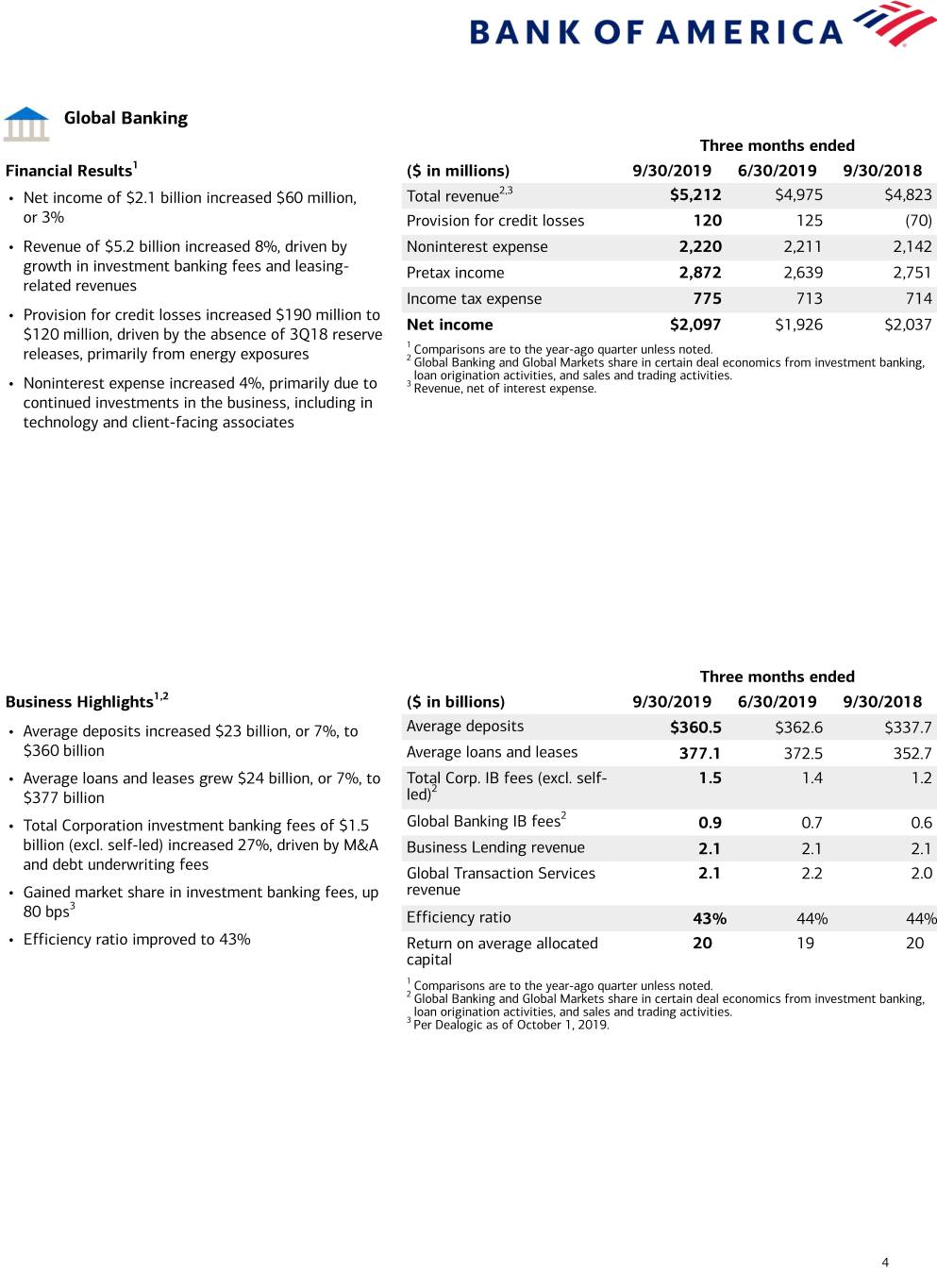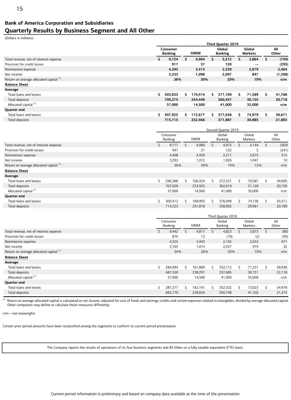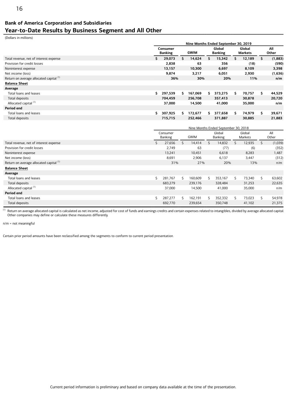 15 Bank of America Corporation and Subsidiaries Quarterly Results by Business Segment and All Other (Dollars in millions) Third Quarter 2019 Consumer Global Global All Banking GWIM Banking Markets Other Total revenue, net of interest expense $ 9,724 $ 4,904 $ 5,212 $ 3,864 $ (749) Provision for credit losses 917 37 120 — (295) Noninterest expense 4,393 3,413 2,220 2,679 2,464 Net income 3,333 1,098 2,097 847 (1,598) Return on average allocated capital (1) 36% 30% 20% 10% n/m Balance Sheet Average Total loans and leases $ 303,833 $ 170,414 $ 377,109 $ 71,589 $ 41,788 Total deposits 709,273 254,449 360,457 30,155 20,718 Allocated capital (1) 37,000 14,500 41,000 35,000 n/m Quarter end Total loans and leases $ 307,925 $ 172,677 $ 377,658 $ 74,979 $ 39,671 Total deposits 715,715 252,466 371,887 30,885 21,883 Second Quarter 2019 Consumer Global Global All Banking GWIM Banking Markets Other Total revenue, net of interest expense $ 9,717 $ 4,900 $ 4,975 $ 4,144 $ (503) Provision for credit losses 947 21 125 5 (241) Noninterest expense 4,408 3,459 2,211 2,675 515 Net income 3,293 1,072 1,926 1,047 10 Return on average allocated capital (1) 36% 30% 19% 12% n/m Balance Sheet Average Total loans and leases $ 296,388 $ 166,324 $ 372,531 $ 70,587 $ 44,695 Total deposits 707,028 253,925 362,619 31,128 20,750 Allocated capital (1) 37,000 14,500 41,000 35,000 n/m Quarter end Total loans and leases $ 300,412 $ 168,993 $ 376,948 $ 74,136 $ 43,311 Total deposits 714,223 251,818 358,902 29,961 20,189 Third Quarter 2018 Consumer Global Global All Banking GWIM Banking Markets Other Total revenue, net of interest expense $ 9,442 $ 4,817 $ 4,823 $ 3,873 $ (80) Provision for credit losses 870 13 (70) (2) (95) Noninterest expense 4,325 3,443 2,142 2,633 471 Net income 3,165 1,014 2,037 919 32 Return on average allocated capital (1) 34% 28% 20% 10% n/m Balance Sheet Average Total loans and leases $ 284,994 $ 161,869 $ 352,712 $ 71,231 $ 59,930 Total deposits 687,530 238,291 337,685 30,721 22,118 Allocated capital (1) 37,000 14,500 41,000 35,000 n/m Quarter end Total loans and leases $ 287,277 $ 162,191 $ 352,332 $ 73,023 $ 54,978 Total deposits 692,770 239,654 350,748 41,102 21,375 (1) Return on average allocated capital is calculated as net income, adjusted for cost of funds and earnings credits and certain expenses related to intangibles, divided by average allocated capital. Other companies may define or calculate these measures differently. n/m = not meaningful Certain prior period amounts have been reclassified among the segments to conform to current period presentation. The Company reports the results of operations of its four business segments and All Other on a fully taxable-equivalent (FTE) basis. Current period information is preliminary and based on company data available at the time of the presentation.