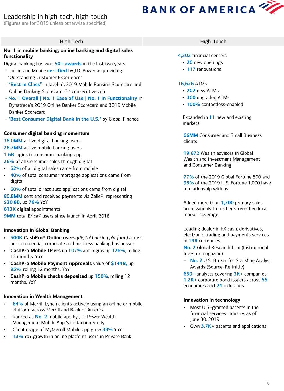 Leadership in high-tech, high-touch (Figures are for 3Q19 unless otherwise specified) High-Tech High-Touch No. 1 in mobile banking, online banking and digital sales functionality 4,302 financial centers Digital banking has won 50+ awards in the last two years • 20 new openings - Online and Mobile certified by J.D. Power as providing • 117 renovations “Outstanding Customer Experience” - “Best in Class” in Javelin’s 2019 Mobile Banking Scorecard and 16,626 ATMs Online Banking Scorecard, 3rd consecutive win • 202 new ATMs - No. 1 Overall | No. 1 Ease of Use | No. 1 in Functionality in • 300 upgraded ATMs Dynatrace’s 2Q19 Online Banker Scorecard and 3Q19 Mobile • 100% contactless-enabled Banker Scorecard - "Best Consumer Digital Bank in the U.S." by Global Finance Expanded in 11 new and existing markets Consumer digital banking momentum 66MM Consumer and Small Business 38.0MM active digital banking users clients 28.7MM active mobile banking users 1.6B logins to consumer banking app 19,672 Wealth advisors in Global 26% of all Consumer sales through digital Wealth and Investment Management and Consumer Banking • 52% of all digital sales came from mobile • 40% of total consumer mortgage applications came from 77% of the 2019 Global Fortune 500 and digital 95% of the 2019 U.S. Fortune 1,000 have • 60% of total direct auto applications came from digital a relationship with us 80.8MM sent and received payments via Zelle®, representing $20.8B, up 76% YoY Added more than 1,700 primary sales 613K digital appointments professionals to further strengthen local 9MM total Erica® users since launch in April, 2018 market coverage Innovation in Global Banking Leading dealer in FX cash, derivatives, electronic trading and payments services • 500K CashPro® Online users (digital banking platform) across in 148 currencies our commercial, corporate and business banking businesses No. 2 Global Research firm (Institutional • CashPro Mobile Users up 107% and logins up 126%, rolling Investor magazine) 12 months, YoY – No. 2 U.S. Broker for StarMine Analyst • CashPro Mobile Payment Approvals value of $144B, up 95%, rolling 12 months, YoY Awards (Source: Refinitiv) • CashPro Mobile checks deposited up 150%, rolling 12 650+ analysts covering 3K+ companies, months, YoY 1.2K+ corporate bond issuers across 55 economies and 24 industries Innovation in Wealth Management Innovation in technology • 64% of Merrill Lynch clients actively using an online or mobile platform across Merrill and Bank of America • Most U.S.-granted patents in the financial services industry, as of • Ranked as No. 2 mobile app by J.D. Power Wealth June 30, 2019 Management Mobile App Satisfaction Study • Own 3.7K+ patents and applications • Client usage of MyMerrill Mobile app grew 33% YoY • 13% YoY growth in online platform users in Private Bank 8