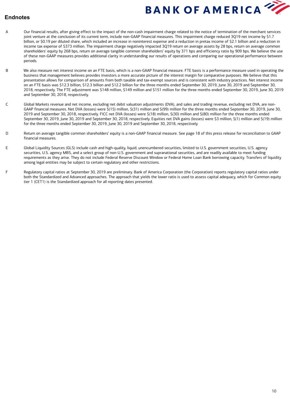 Endnotes A Our financial results, after giving effect to the impact of the non-cash impairment charge related to the notice of termination of the merchant services joint venture at the conclusion of its current term, include non-GAAP financial measures. This impairment charge reduced 3Q19 net income by $1.7 billion, or $0.19 per diluted share, which included an increase in noninterest expense and a reduction in pretax income of $2.1 billion and a reduction in income tax expense of $373 million. The impairment charge negatively impacted 3Q19 return on average assets by 28 bps, return on average common shareholders’ equity by 268 bps, return on average tangible common shareholders’ equity by 371 bps and efficiency ratio by 909 bps. We believe the use of these non-GAAP measures provides additional clarity in understanding our results of operations and comparing our operational performance between periods. B We also measure net interest income on an FTE basis, which is a non-GAAP financial measure. FTE basis is a performance measure used in operating the business that management believes provides investors a more accurate picture of the interest margin for comparative purposes. We believe that this presentation allows for comparison of amounts from both taxable and tax-exempt sources and is consistent with industry practices. Net interest income on an FTE basis was $12.3 billion, $12.3 billion and $12.2 billion for the three months ended September 30, 2019, June 30, 2019 and September 30, 2018, respectively. The FTE adjustment was $148 million, $149 million and $151 million for the three months ended September 30, 2019, June 30, 2019 and September 30, 2018, respectively. C Global Markets revenue and net income, excluding net debit valuation adjustments (DVA), and sales and trading revenue, excluding net DVA, are non- GAAP financial measures. Net DVA (losses) were $(15) million, $(31) million and $(99) million for the three months ended September 30, 2019, June 30, 2019 and September 30, 2018, respectively. FICC net DVA (losses) were $(18) million, $(30) million and $(80) million for the three months ended September 30, 2019, June 30, 2019 and September 30, 2018, respectively. Equities net DVA gains (losses) were $3 million, $(1) million and $(19) million for the three months ended September 30, 2019, June 30, 2019 and September 30, 2018, respectively. D Return on average tangible common shareholders’ equity is a non-GAAP financial measure. See page 18 of this press release for reconciliation to GAAP financial measures. E Global Liquidity Sources (GLS) include cash and high-quality, liquid, unencumbered securities, limited to U.S. government securities, U.S. agency securities, U.S. agency MBS, and a select group of non-U.S. government and supranational securities, and are readily available to meet funding requirements as they arise. They do not include Federal Reserve Discount Window or Federal Home Loan Bank borrowing capacity. Transfers of liquidity among legal entities may be subject to certain regulatory and other restrictions. F Regulatory capital ratios at September 30, 2019 are preliminary. Bank of America Corporation (the Corporation) reports regulatory capital ratios under both the Standardized and Advanced approaches. The approach that yields the lower ratio is used to assess capital adequacy, which for Common equity tier 1 (CET1) is the Standardized approach for all reporting dates presented. 10